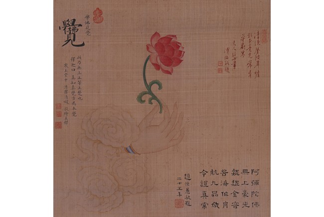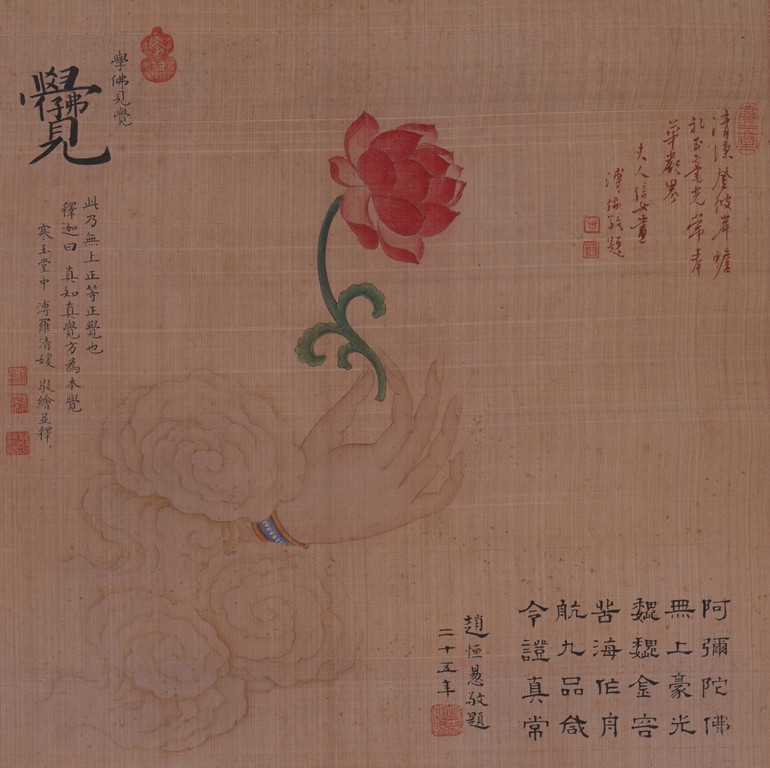 Color and ink on silk. Buddha's hand. Mounted for framing. Inscribed and signed, with eight seals of the artists.