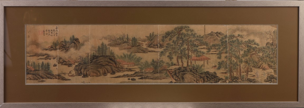 Ink and color on paper. Landscape in the manner of Zhao Mengfu. Framed. Signed Wen Zhengming and with one seal of the artist.