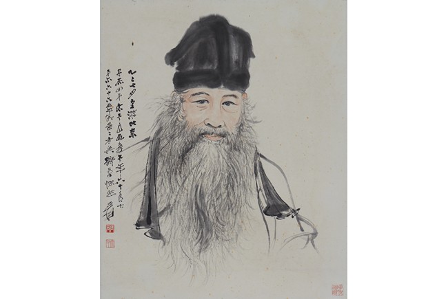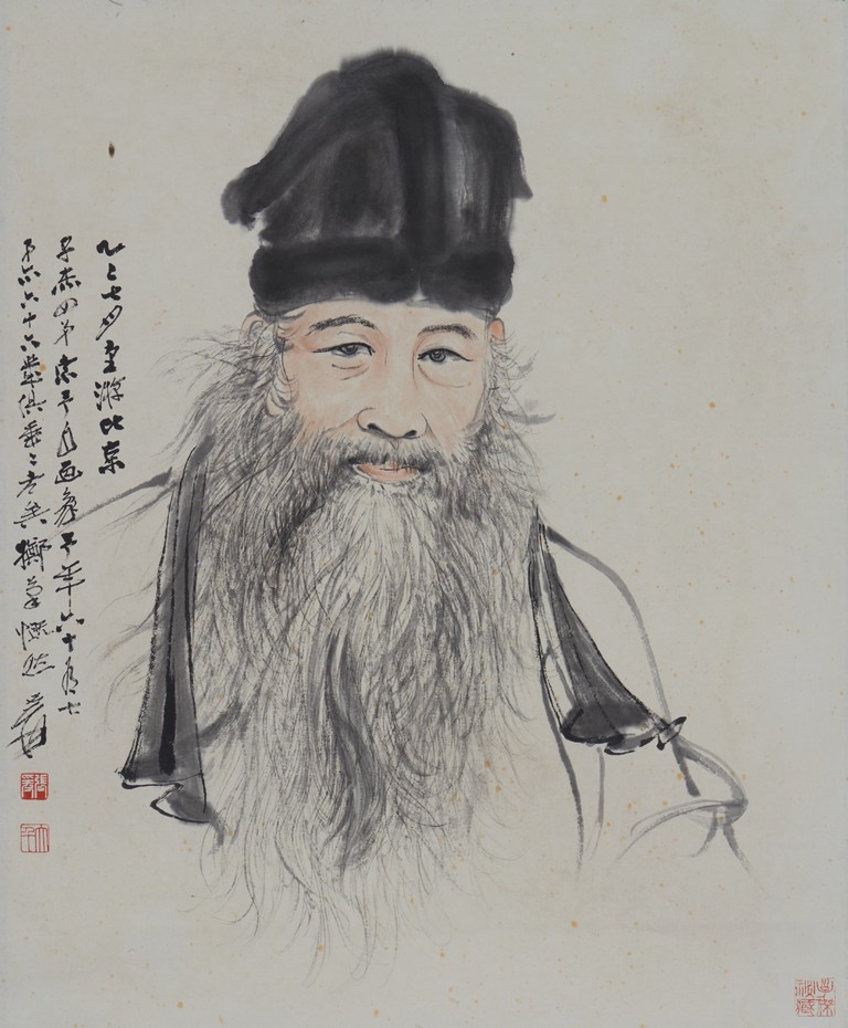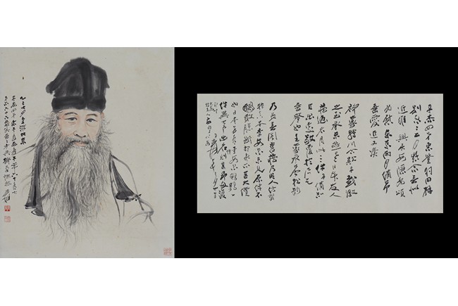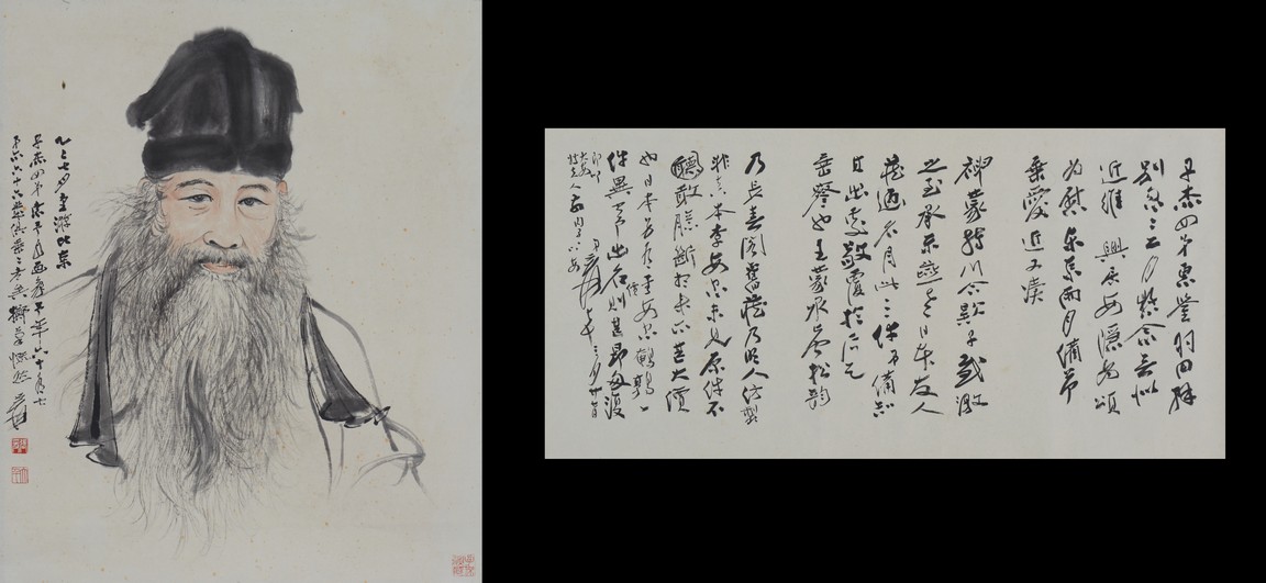 Comprising of a painting and a calligraphy. Painting: Color and ink on paper. Self-portrait. Inscribed and signed, with three seals of the artist. Calligraphy: Ink on paper. Running script calligraphy. Signed Yuan Da Qian.