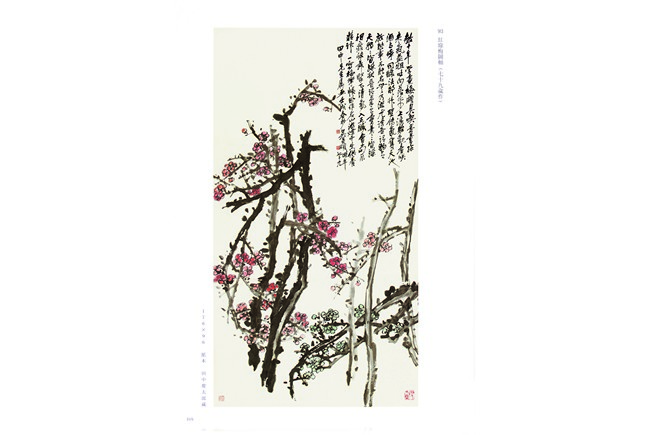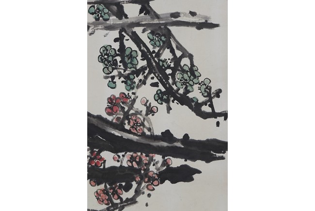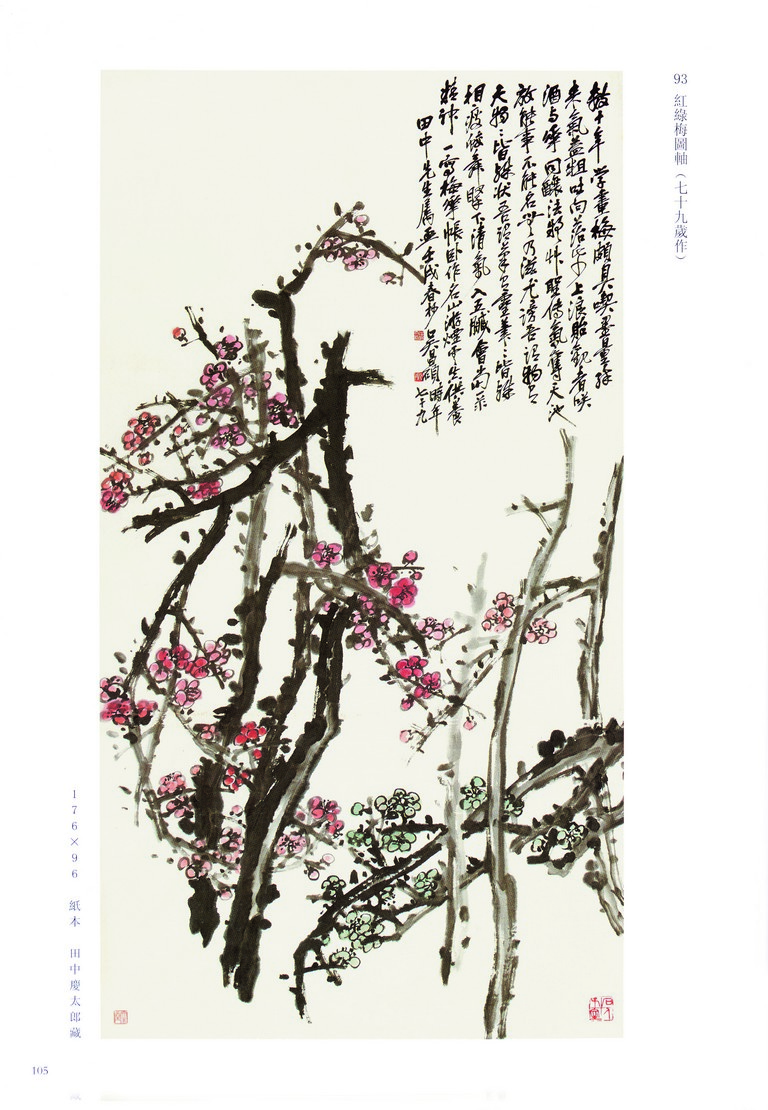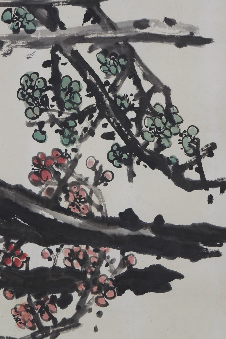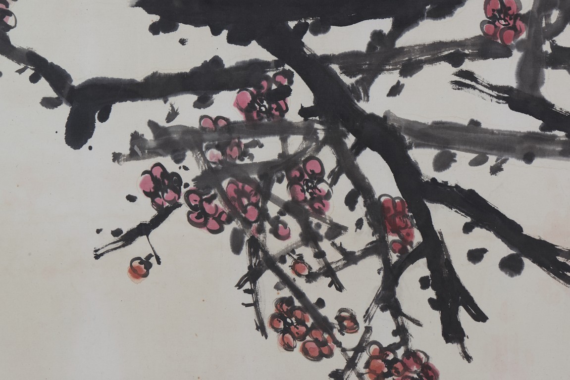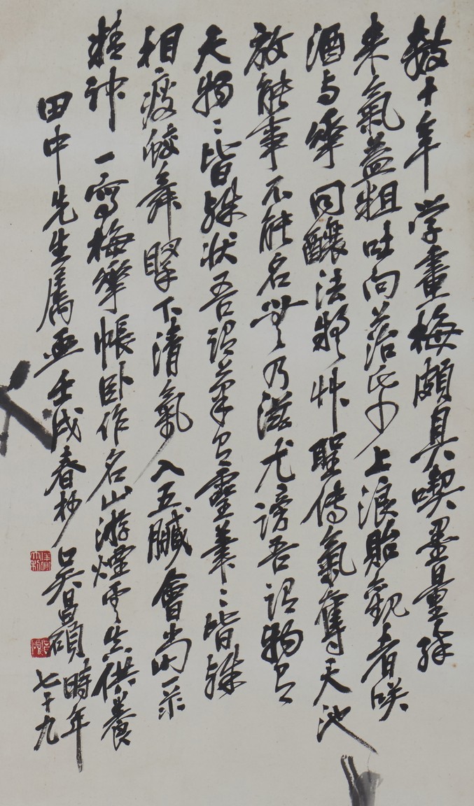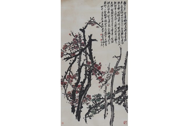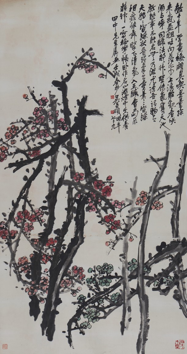 Color and ink on paper. Plum Blossom. Framed. Inscribed and signed Wu Changshuo, dated to 1921 Spring, dedicated to Mr. Tanaka Keitaro, with four seals.