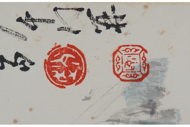 Color and ink on paper. Flower and bird. Hanging scroll. Signed and with two seals of the artist.