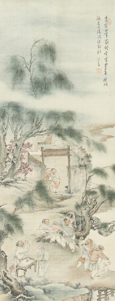 Color and ink on silk. Figures. Hanging scroll. Inscribed and signed, with two seals of the artist.