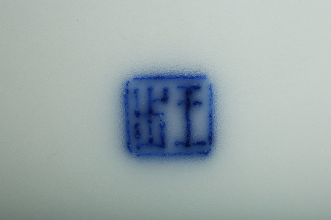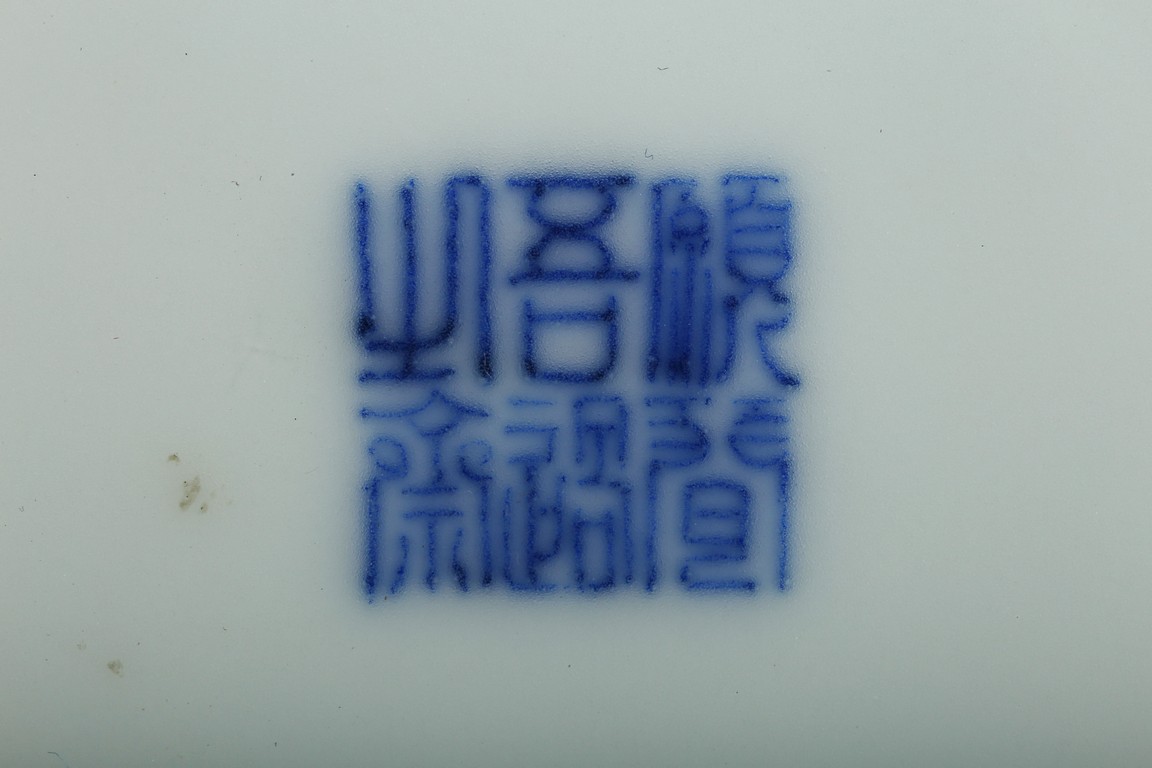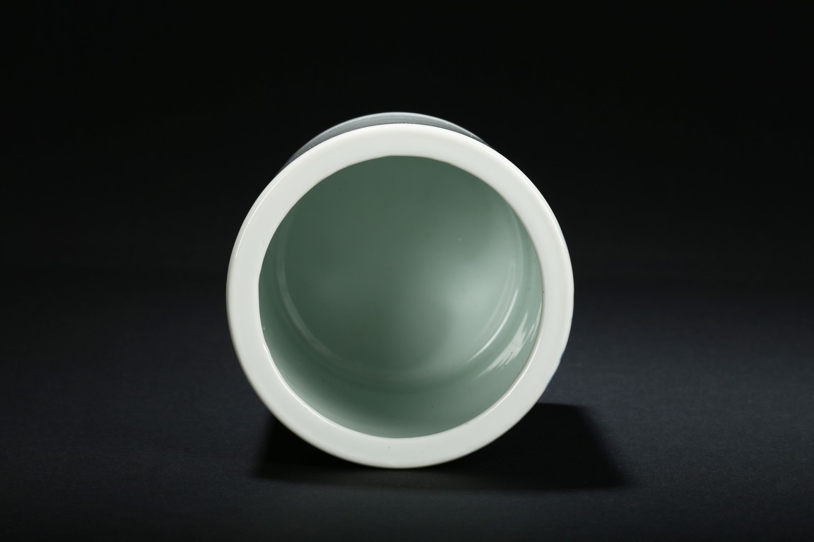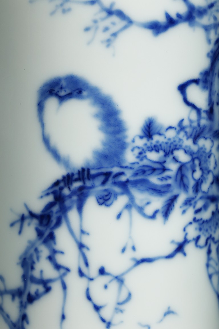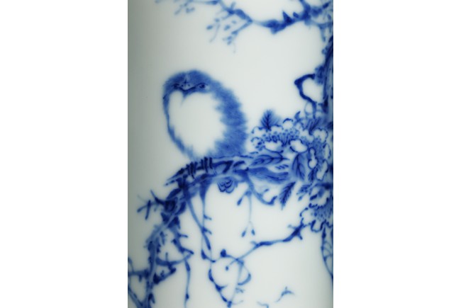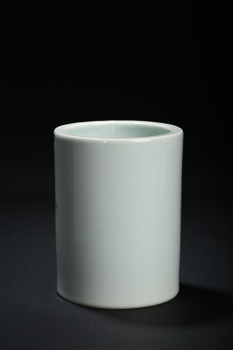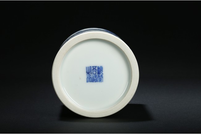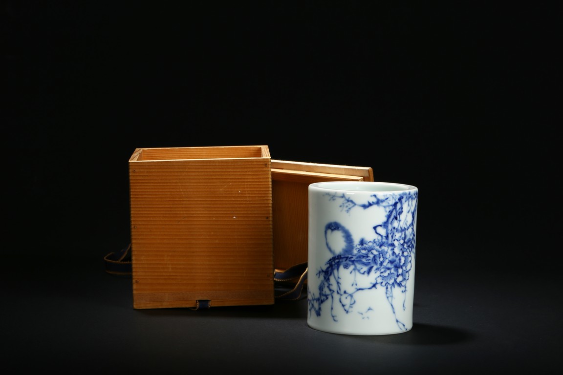 Of cylindrical form,the side finely painted with a placid scene of a bird resting upon a gnarled branch,the details masterfully rendered in shades of cobalt; one square seal mark reading Wang Bu drawn at the lower section,with a six character seal yuan wen wu guo zhi zhai to the base. Republic period.