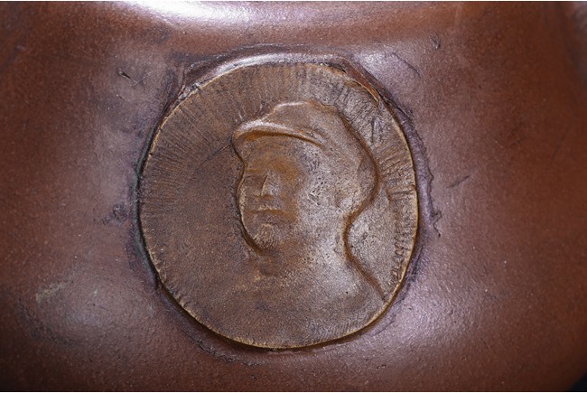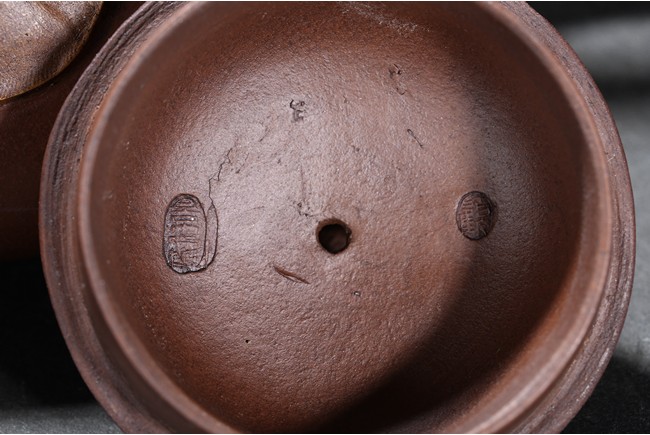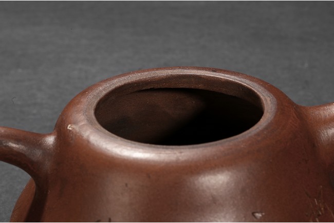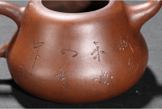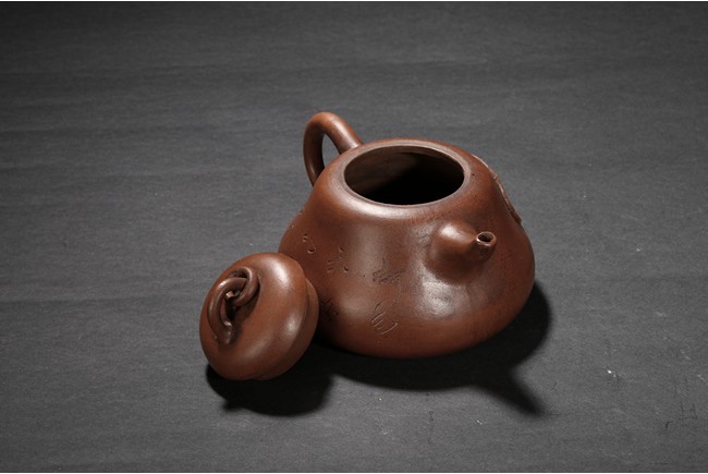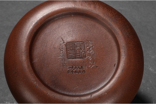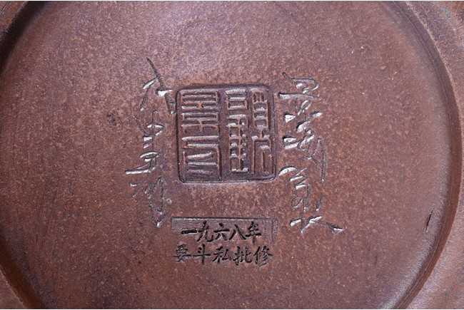 The teapot modelled with a circular handle and a upturned spout,the cover finial modelled in the form of a arched ring with a loose ring,the body moulded with a circular Mao Zedong medallion,base with inscriptions attributed to Gu Jing Zhou.