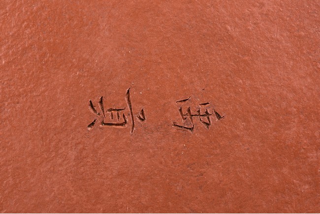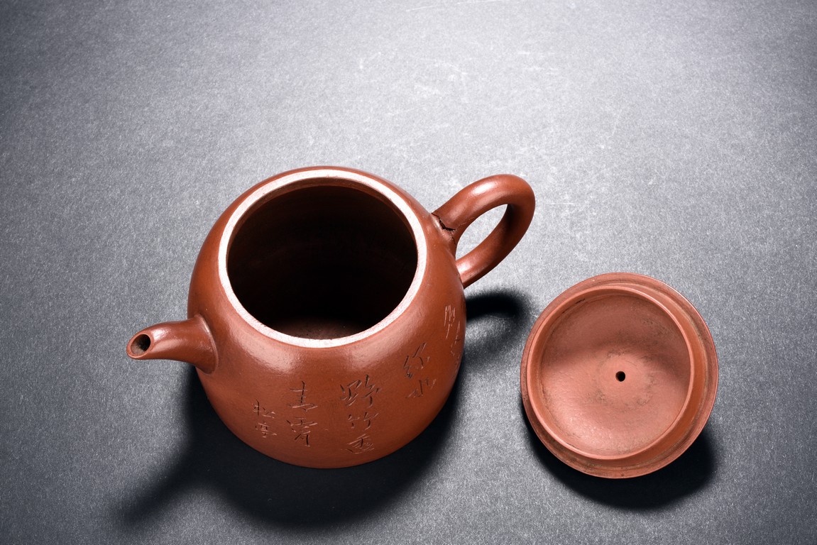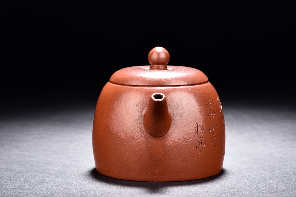 The teapot is incised with a poem on the body with two character colophon 'Song Ting',with ear-shaped round handle,curved spout. The bottom incised with two character 'Yu Gong'.