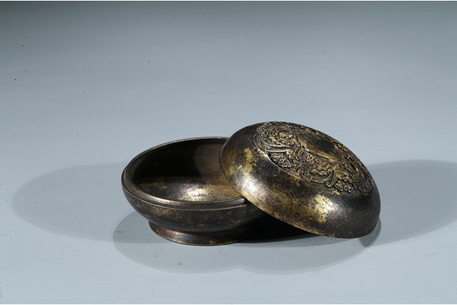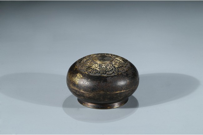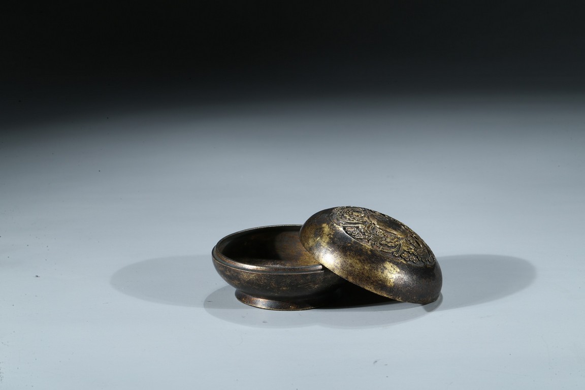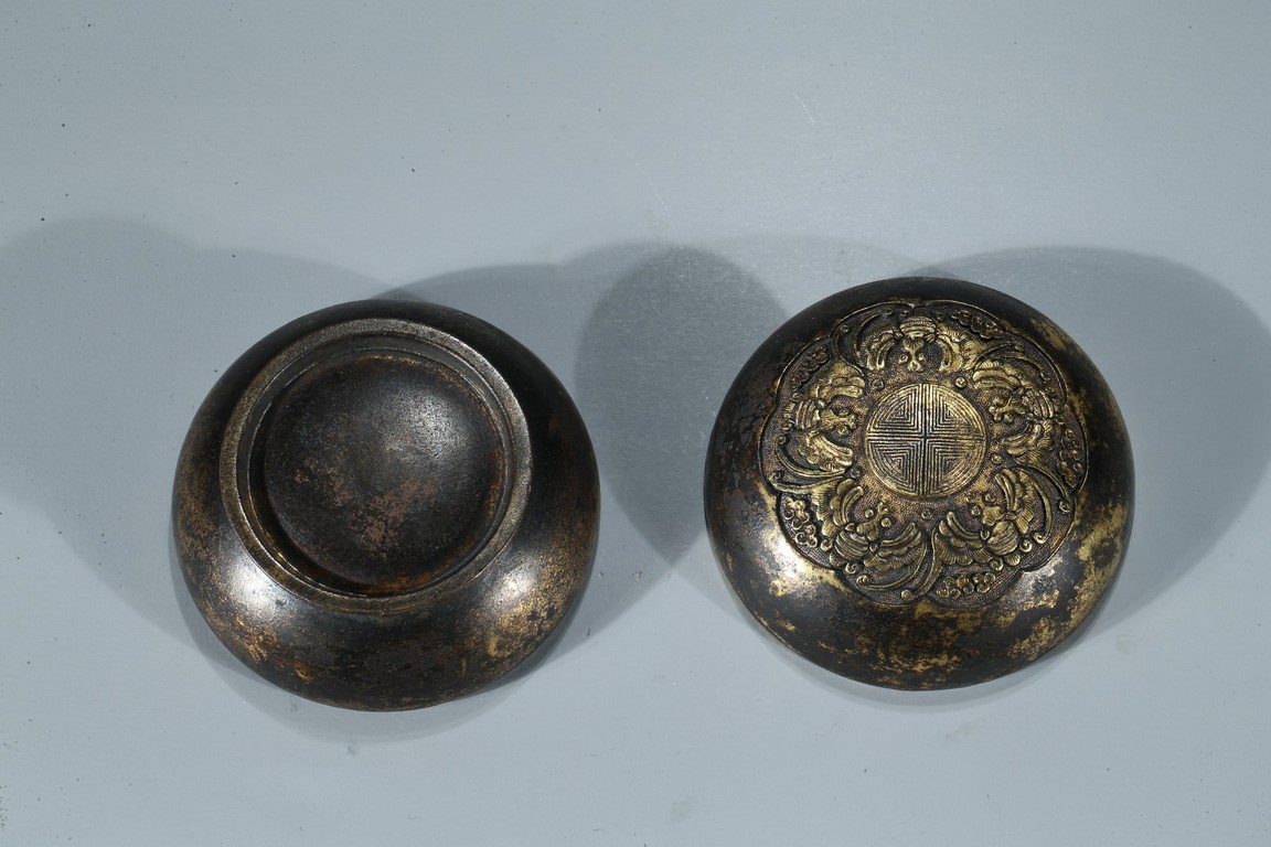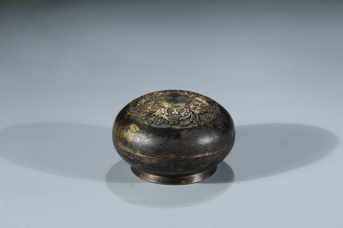 Of compressed form, the cover decorated with a shaped cartouche in relief with five bats in flight flanking a stylized shou medallion. Mid Qing Dynasty period.