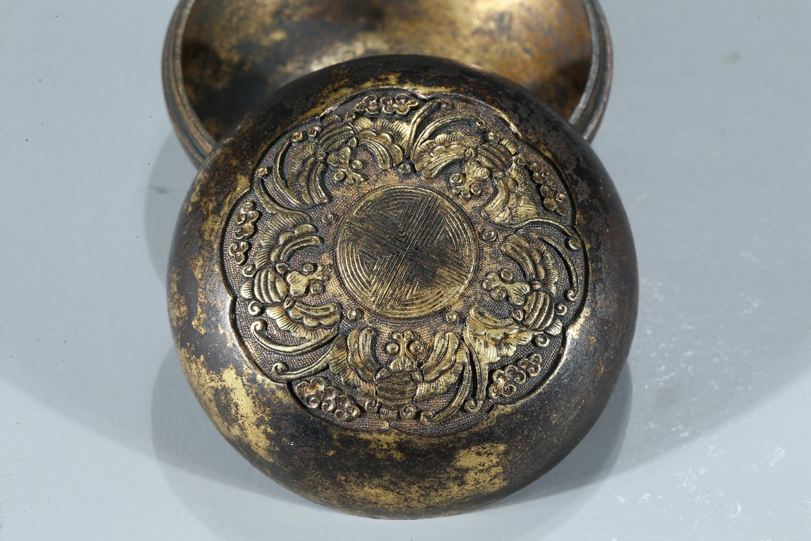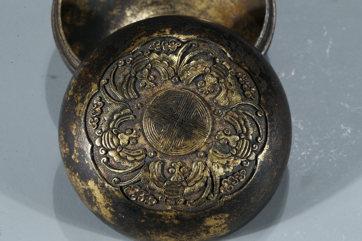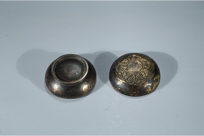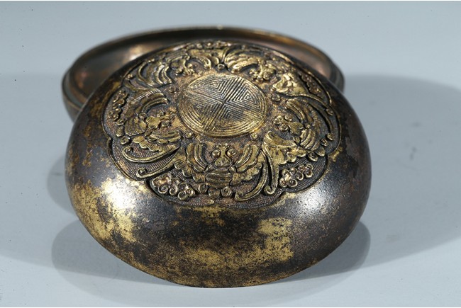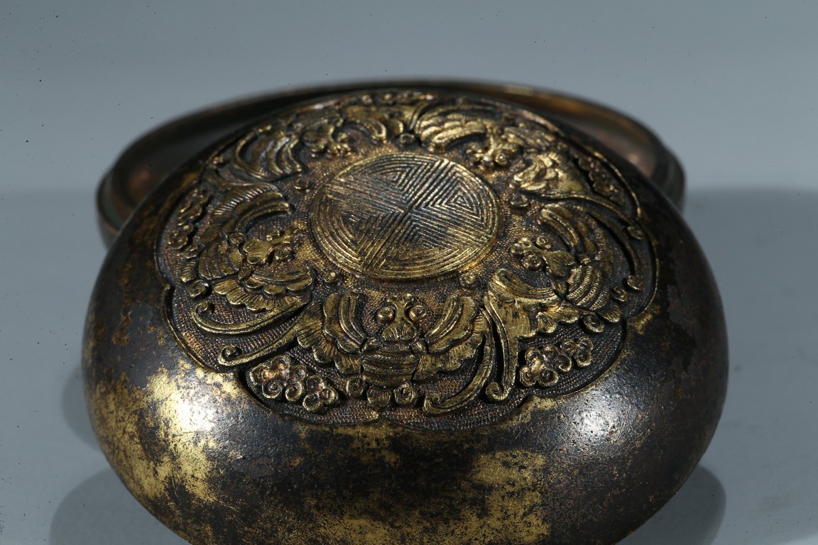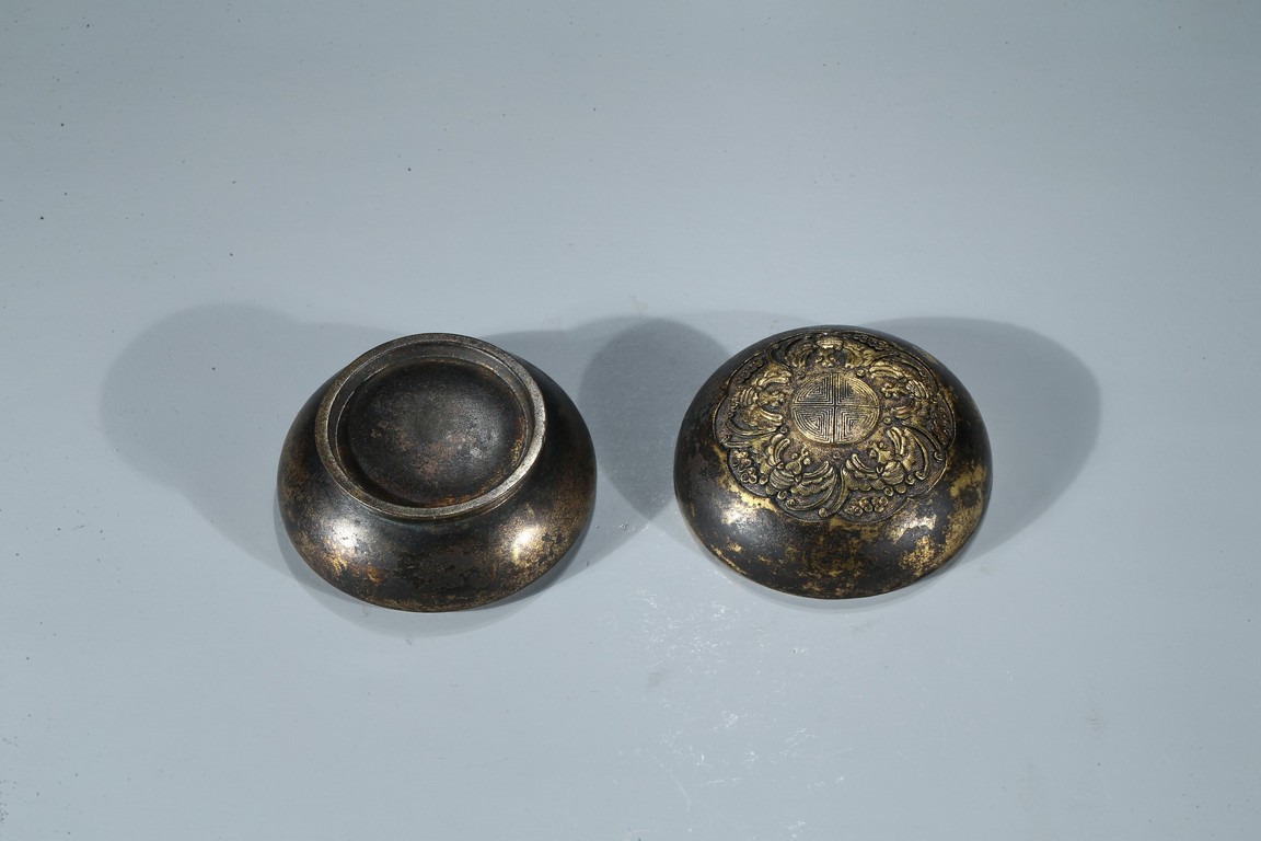 Of compressed form, the cover decorated with a shaped cartouche in relief with five bats in flight flanking a stylized shou medallion. Mid Qing Dynasty period.