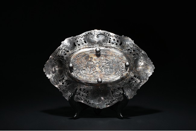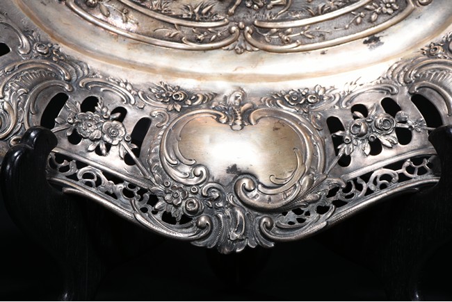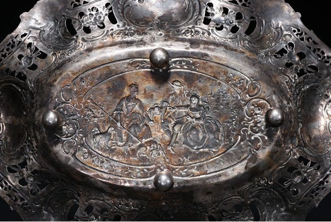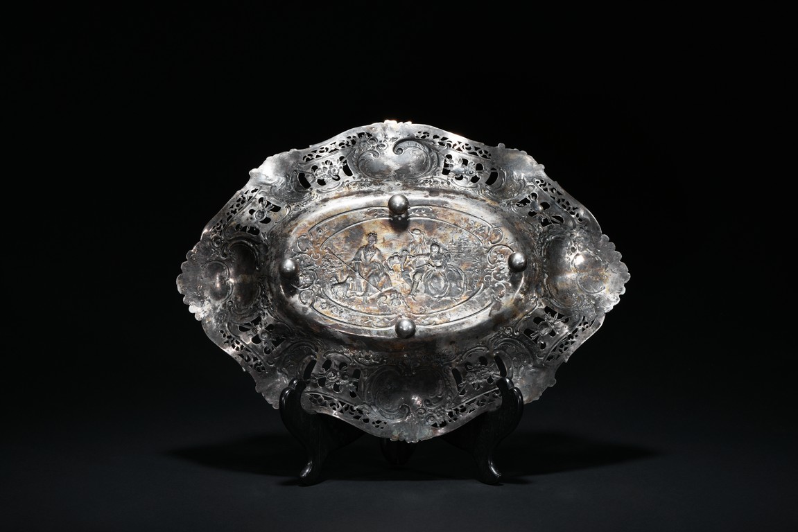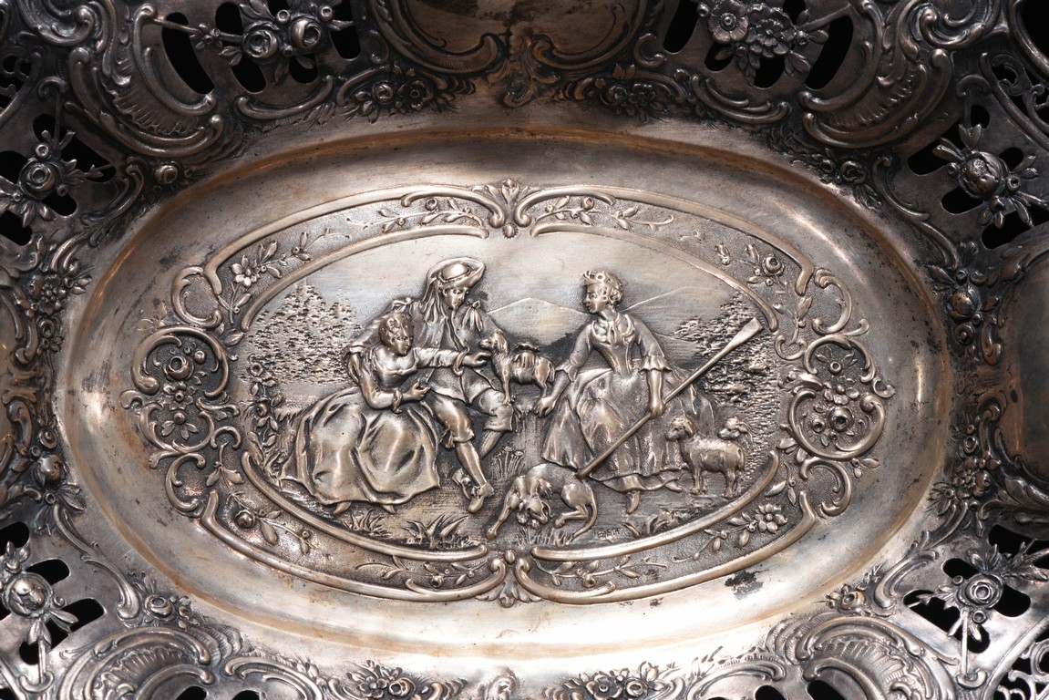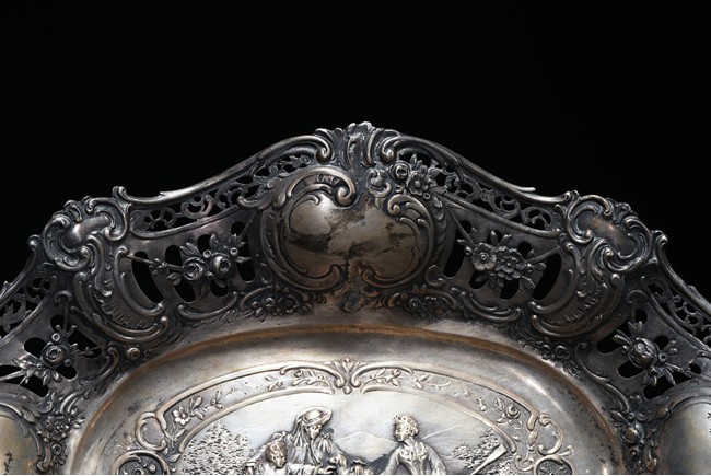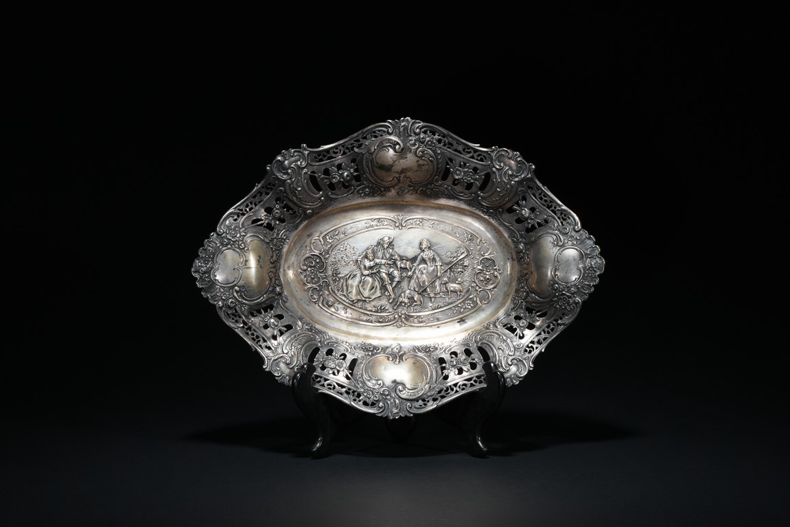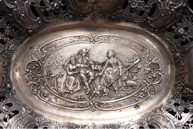 German. The silver repousse' bonbon dish with reticulated sides and an central oval depicting European nobles in forest setting. 19th Century.