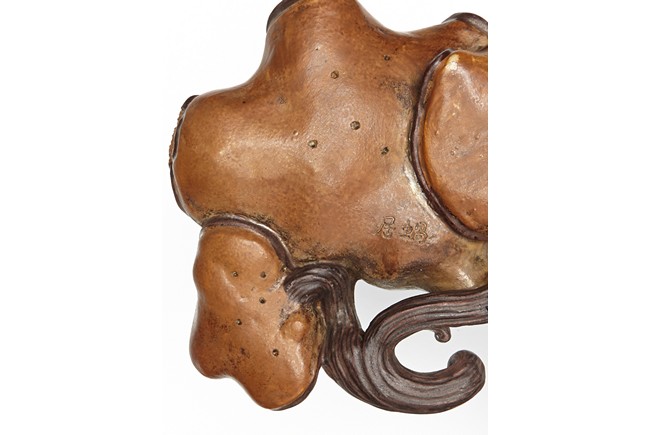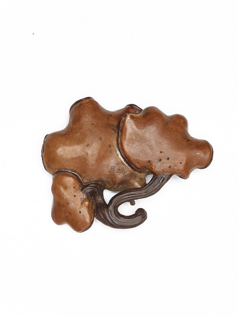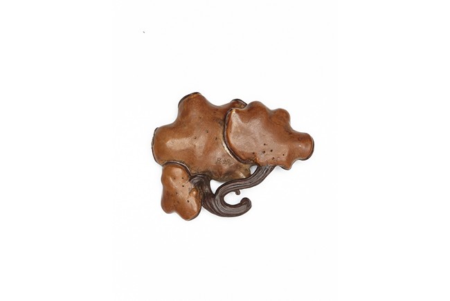 Realistically carved as three Lingzhi mushrooms heads of various sizes from a single branch,the base with two incised character 'Wo Ju'. Qing Dynasty period.