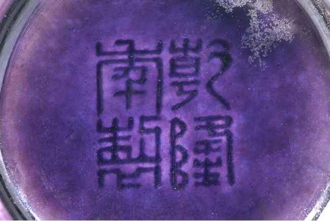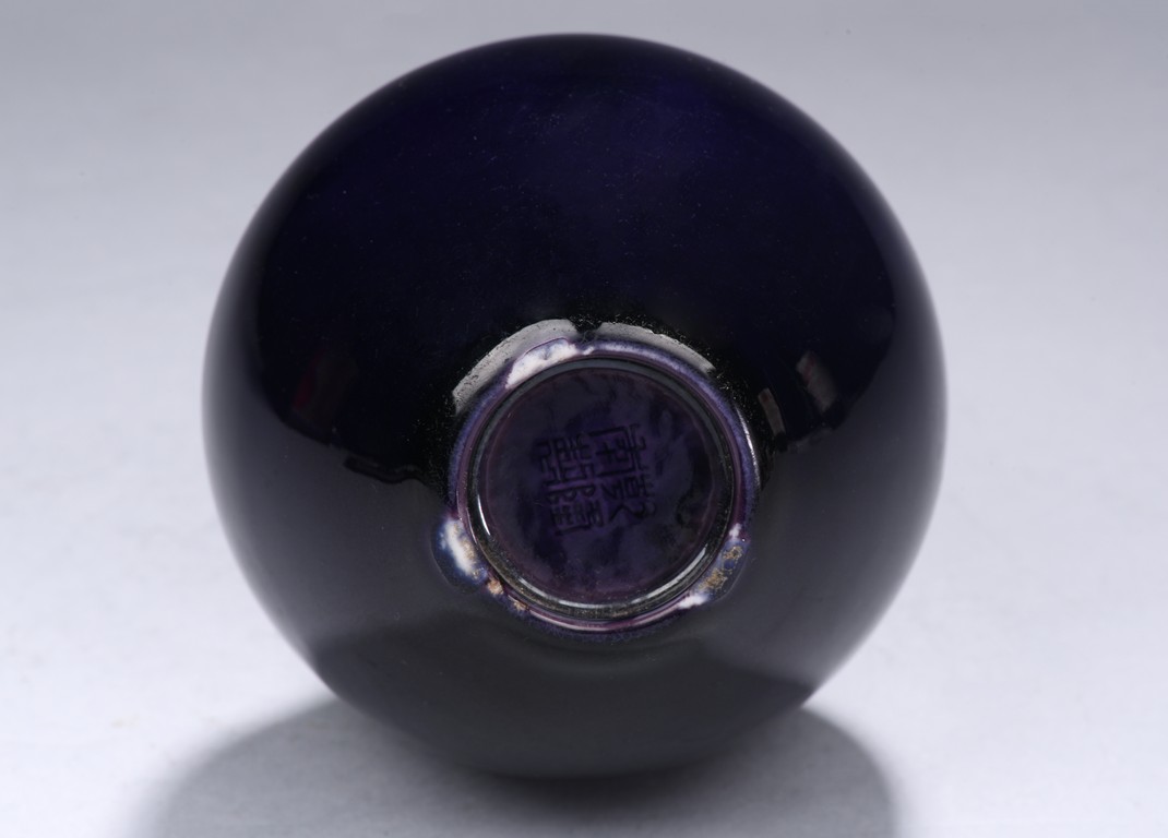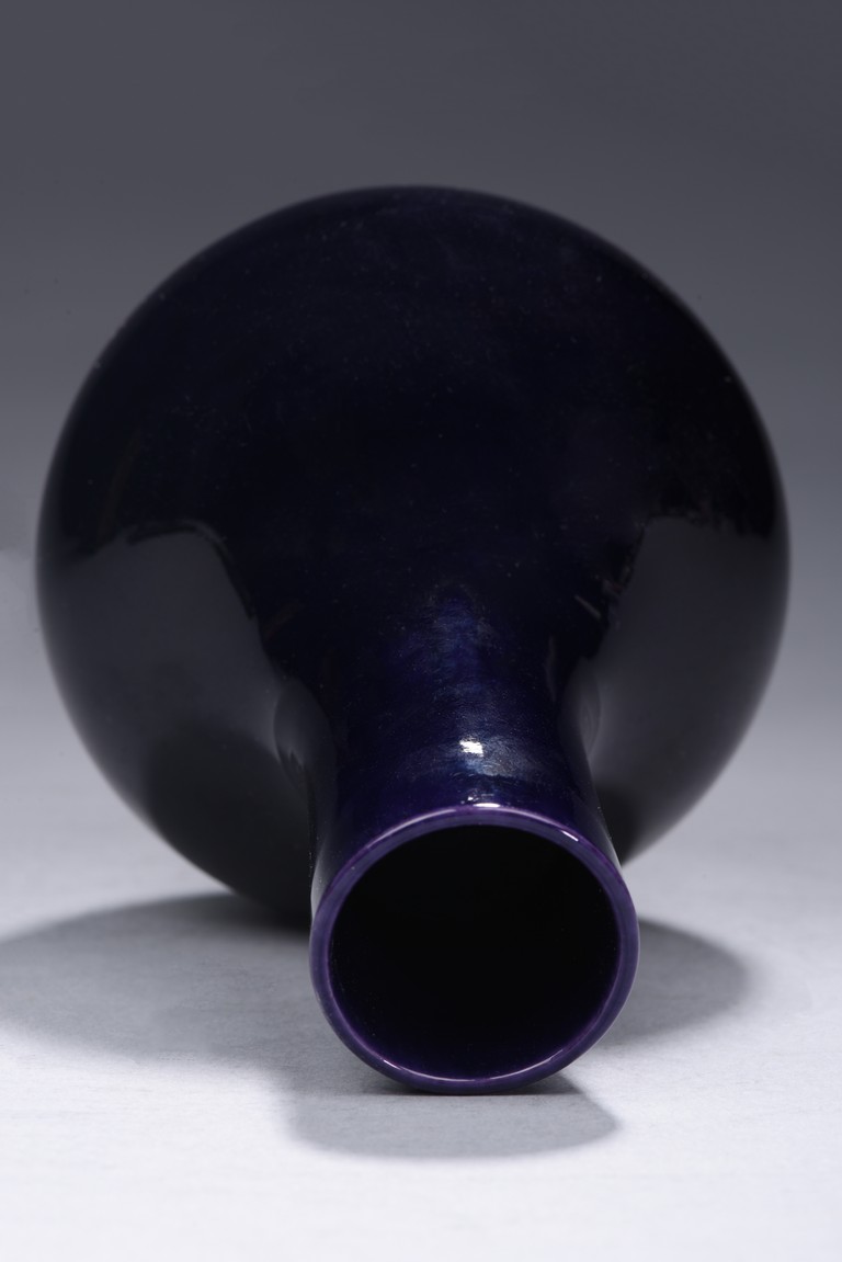 The globular body rising from a recessed base to a tall cylindrical neck,covered overall with a polished dark blue glaze,the base inscribed with the four character mark,original hardwood box. Qing Dynasty period.