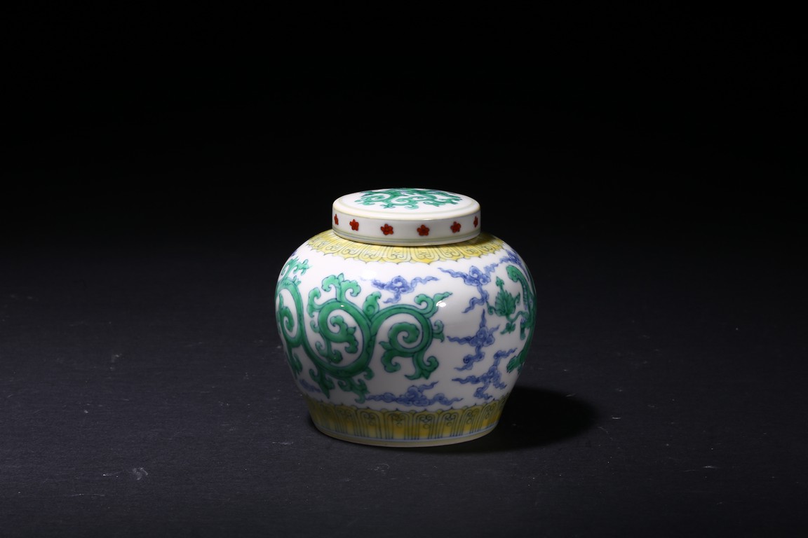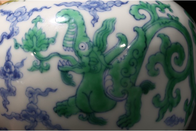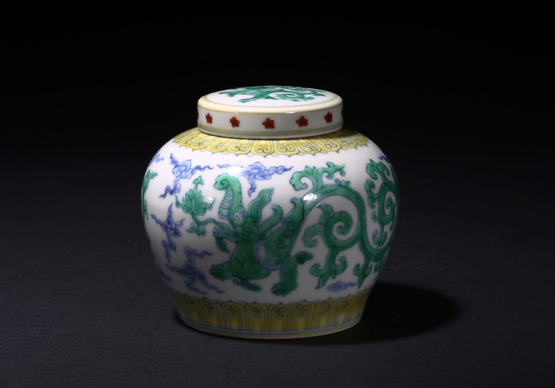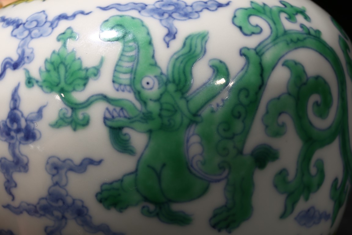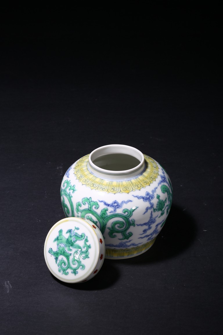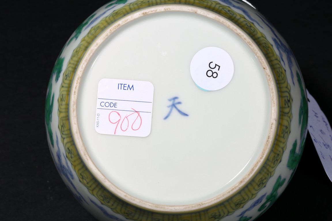 Of compressed globular form,the jar is decorated with two mythical dragon in green enamel striding through clouds in underglaze blue enamel between petal lappet borders painted in yellow. The countersunk base is inscribed with a Tian,'Heaven',character. Qing Dynasty period.