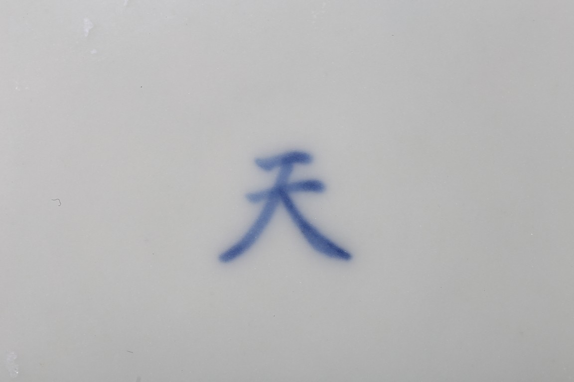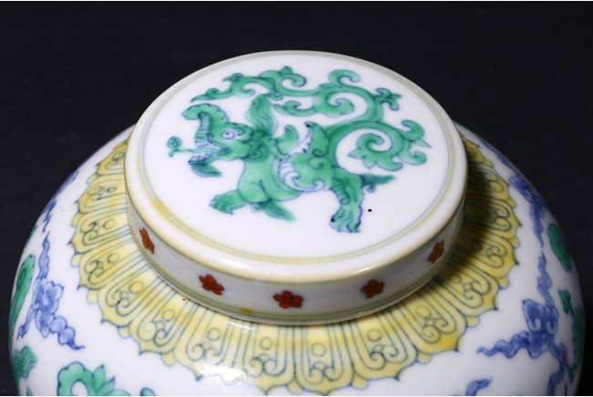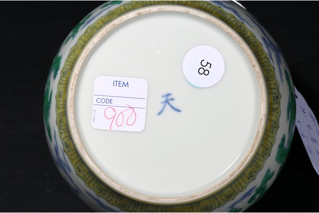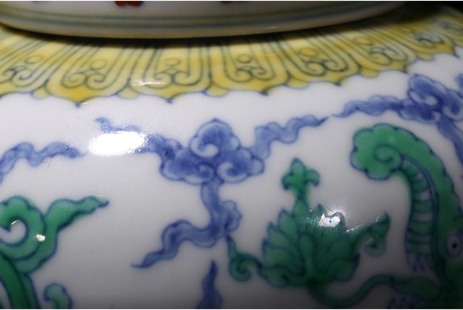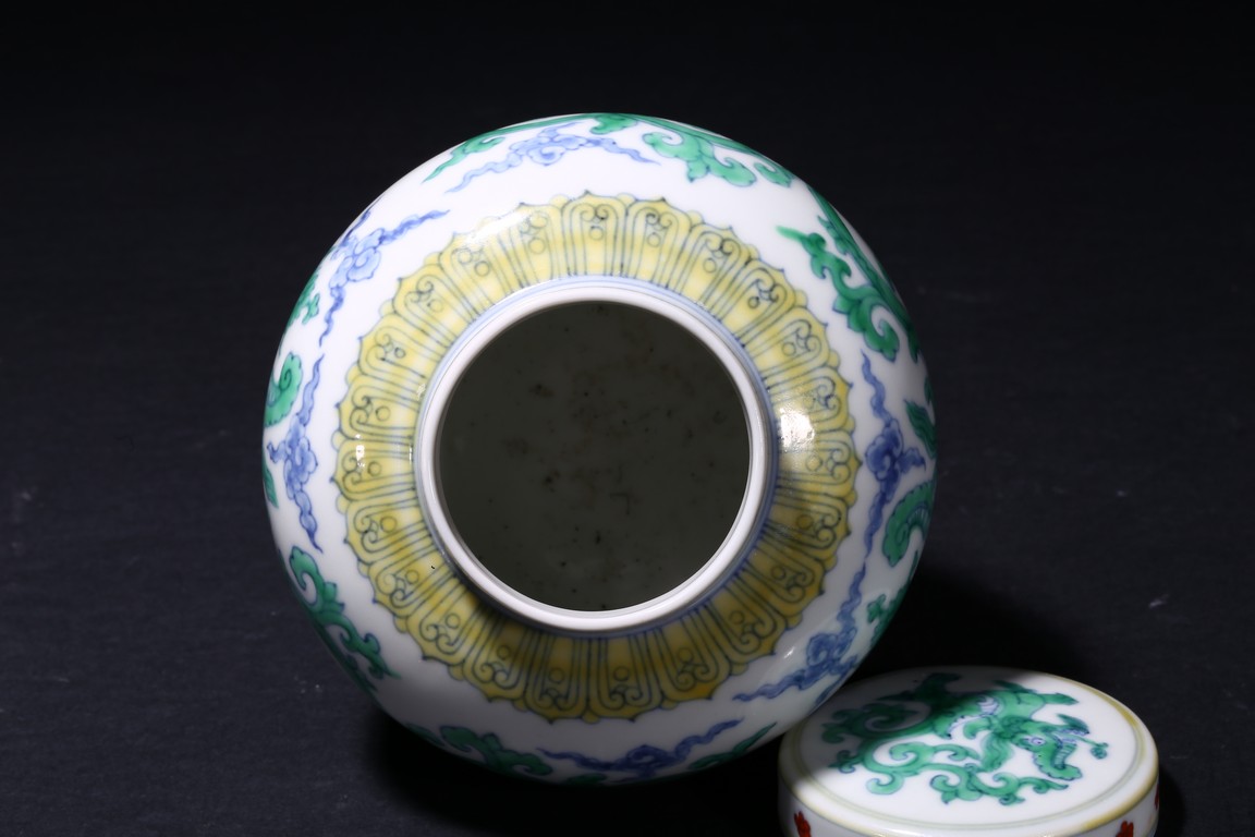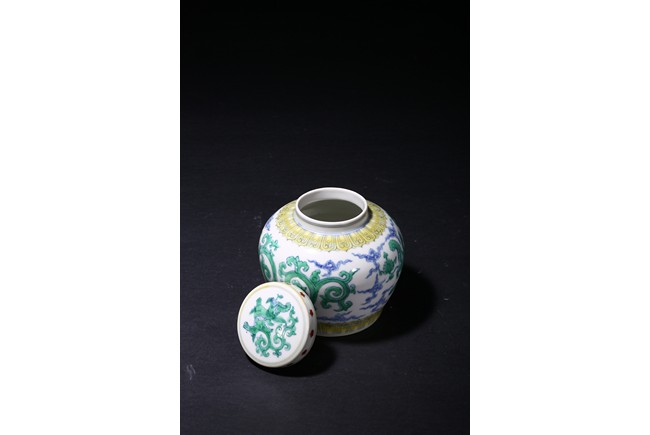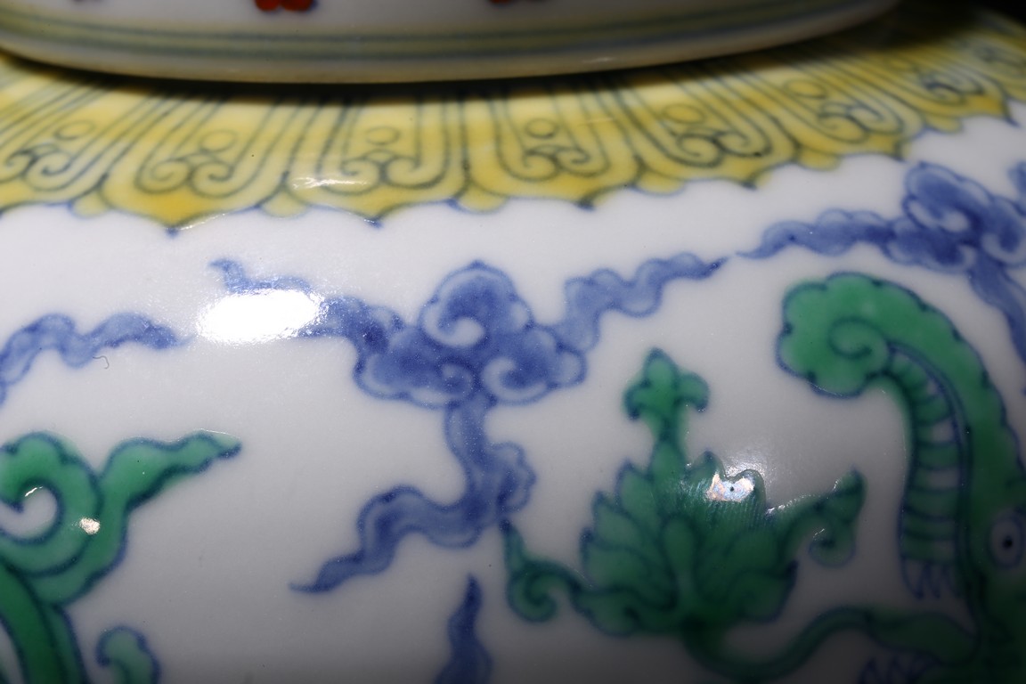 Of compressed globular form,the jar is decorated with two mythical dragon in green enamel striding through clouds in underglaze blue enamel between petal lappet borders painted in yellow. The countersunk base is inscribed with a Tian,'Heaven',character. Qing Dynasty period.