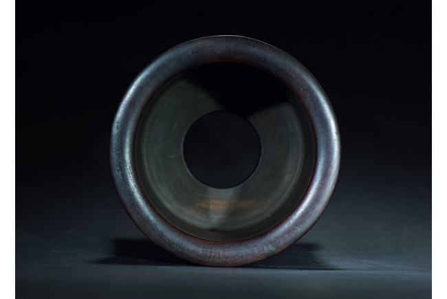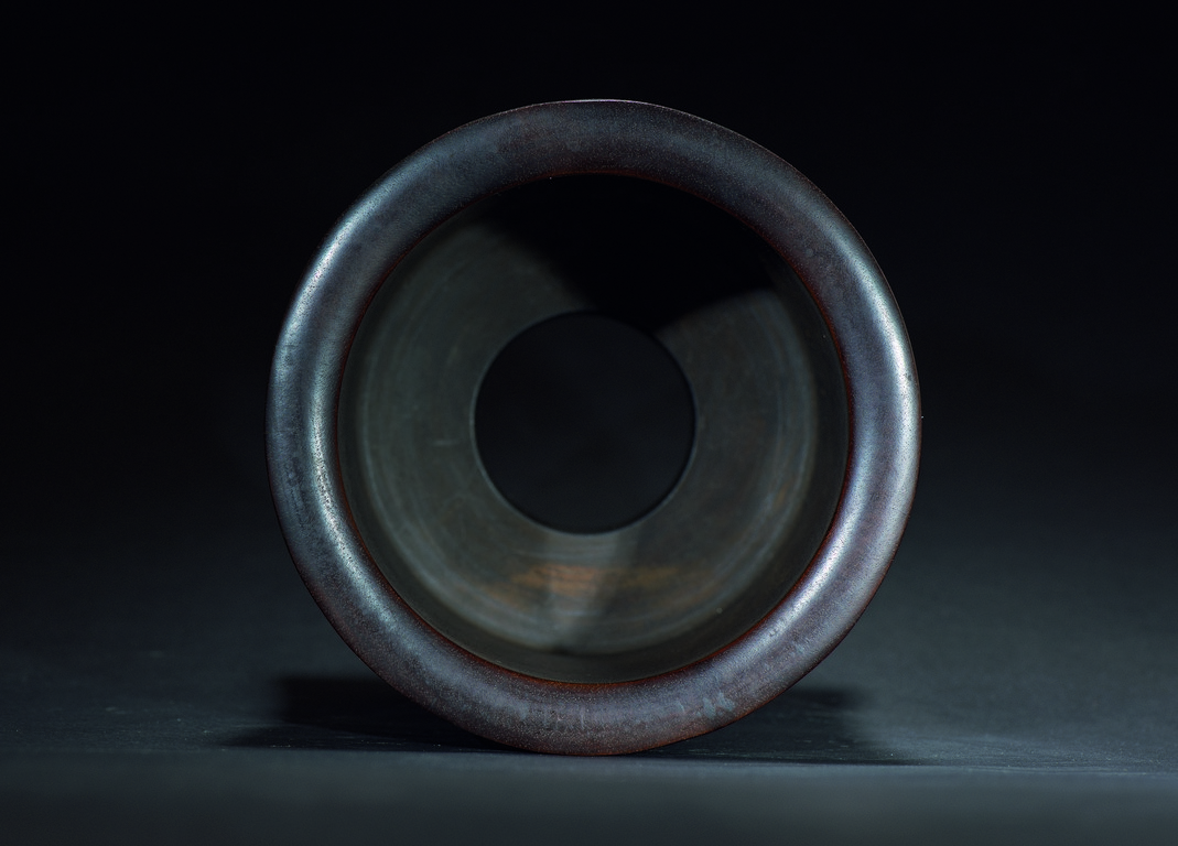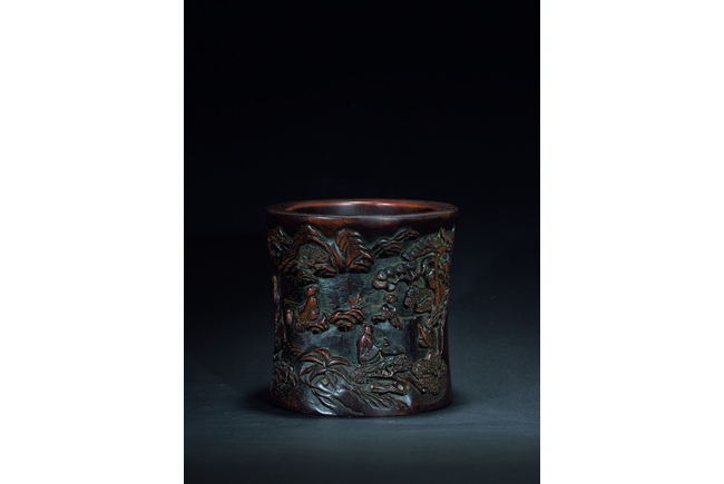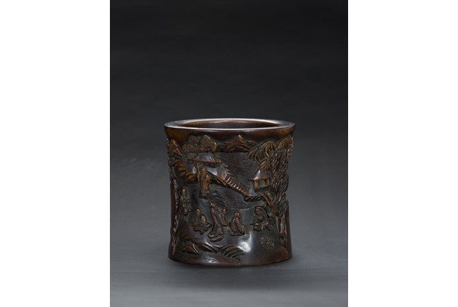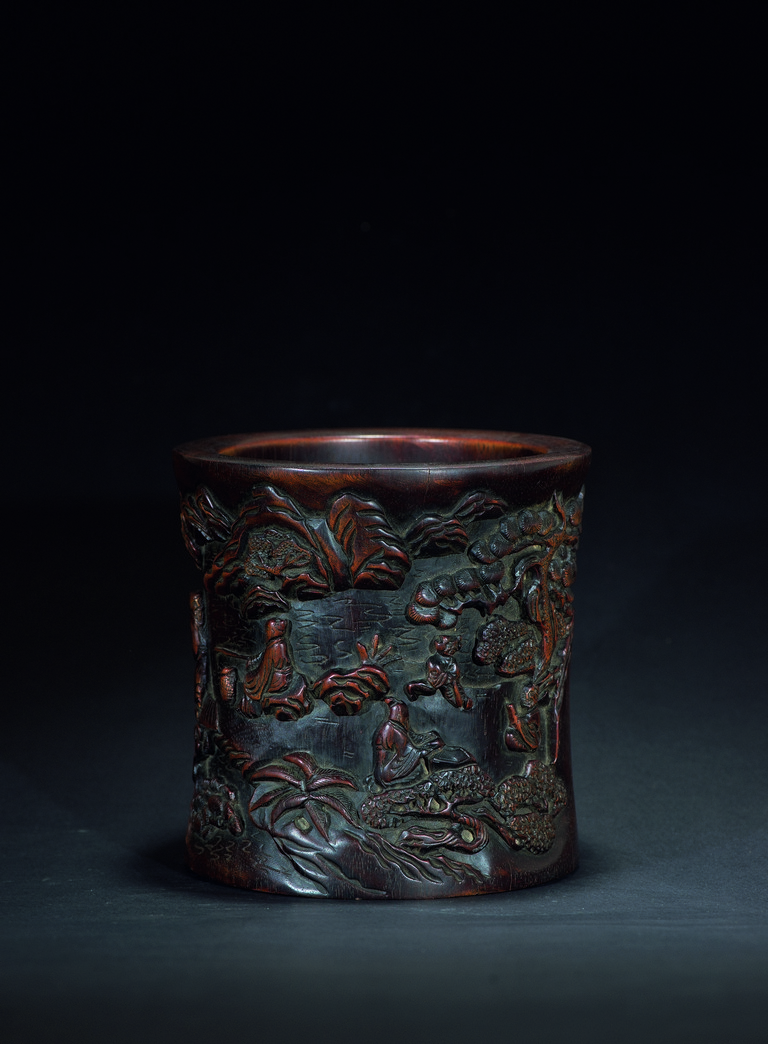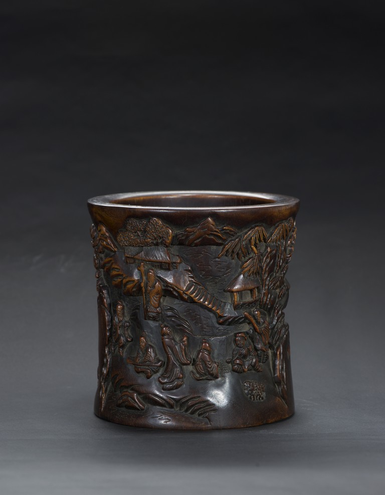 The brush pot is carved with a continuous scene of elderly figures sitting around engaging in leisurely activities within a riverside landscape.