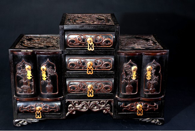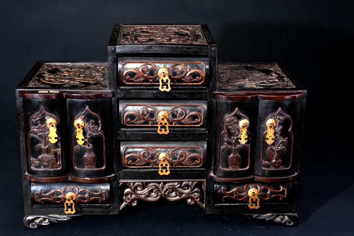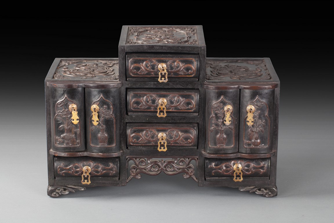 The box was intricately carved from Zitan wood,with five drawers and two storage spaces. Each surface is intricately carved with different patterns,such as vine,flowers,bats,coins,mythical beasts,and others. All drawers and doors have bronze hanging handle. Qing Dynasty period.