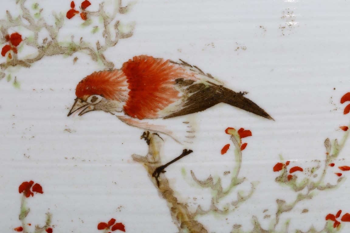 Of large cylindrical form,delicately enamelled with blossoming chrysanthemum issuing from grassy rockwork,one red and black bird standing on the rock peak turn its head back look at another bird perching on the gnarled plum flower branch,the reverse with an poem inscription in stylized script,signed Xu Dasheng. Republic period.