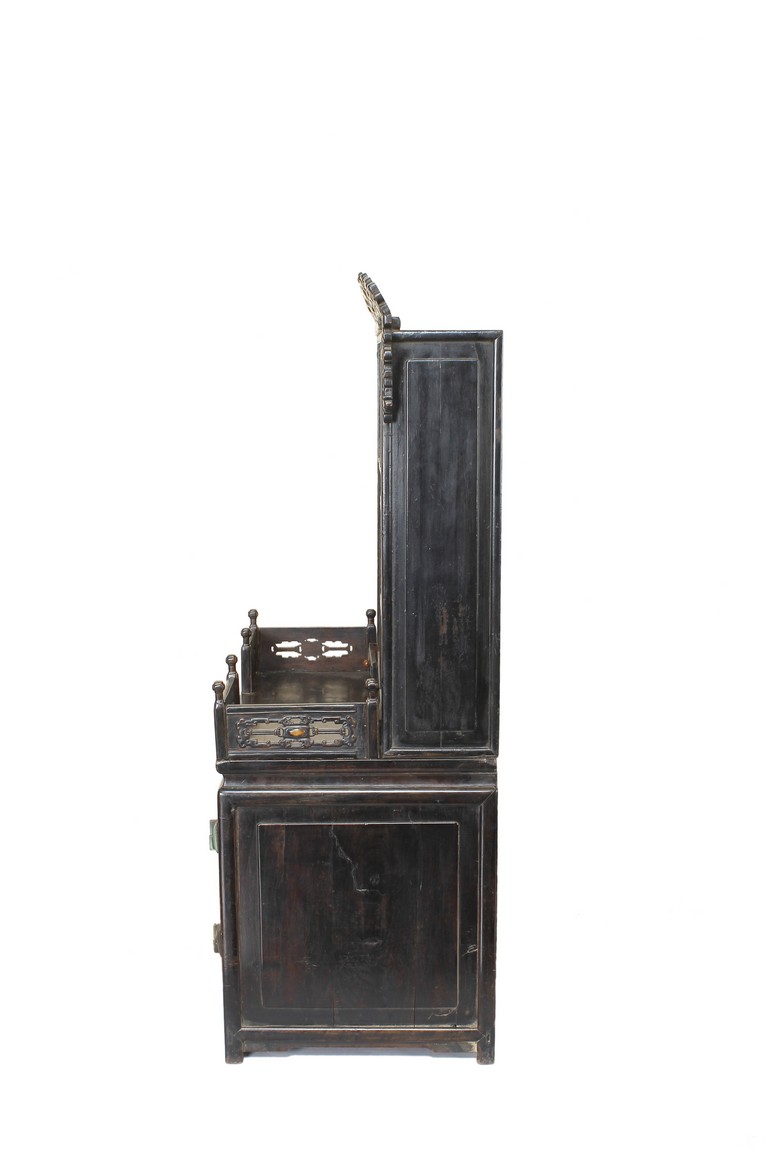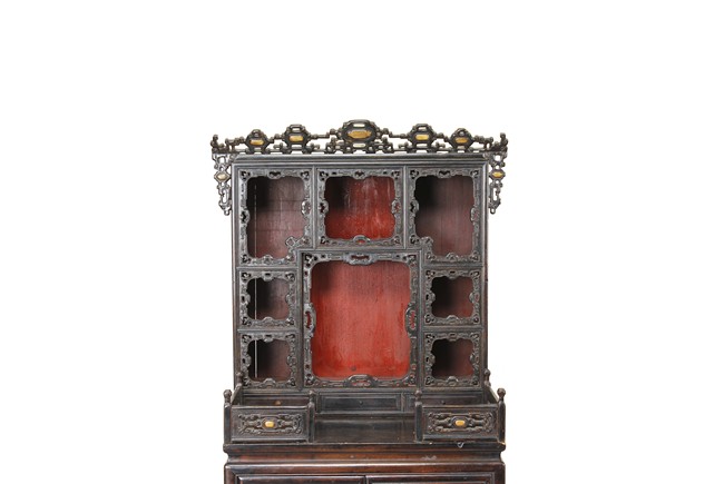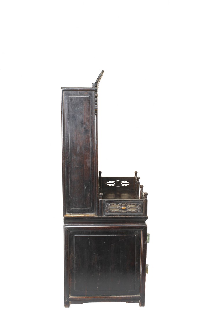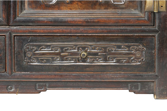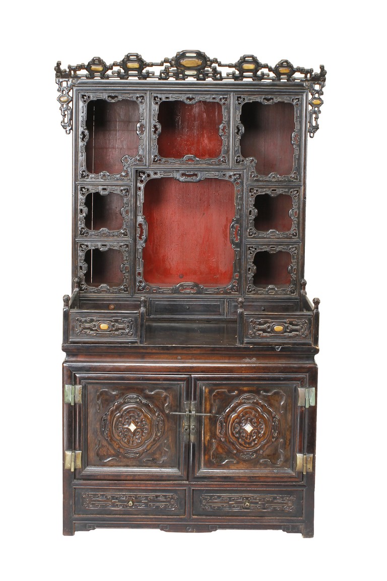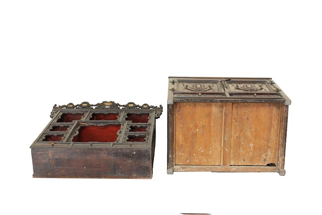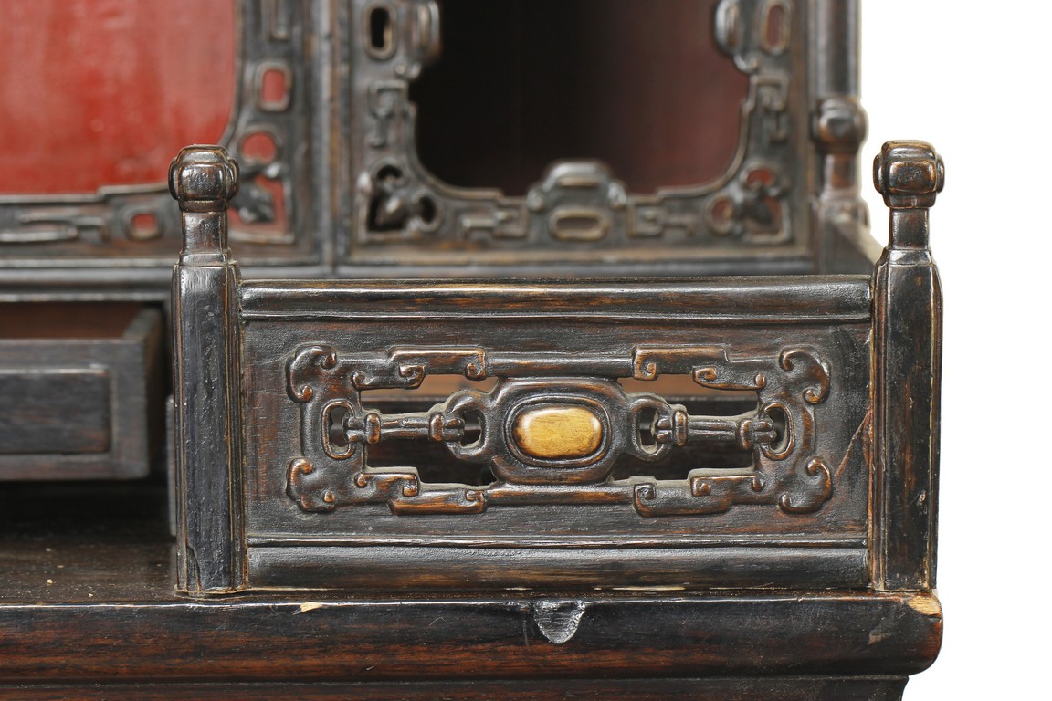 Of rectangular form,the wooden altar's center is to hold and display the Buddha figure,seven smaller openings surrounds the larger center opening,each with pierce carved skirt,three small drawers right below,with rail and space reserved for offerings,additional cabinet space and drawers below,carved with flower and other stylized patterns,with bronze hinges and lock. Wood with natural color and grain,some age related wear and damage. Qing Dynasty period.