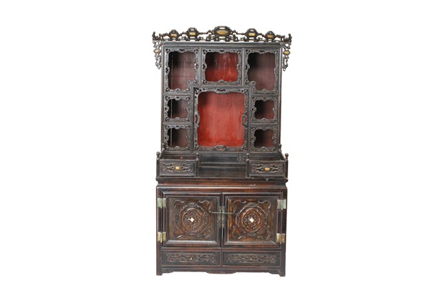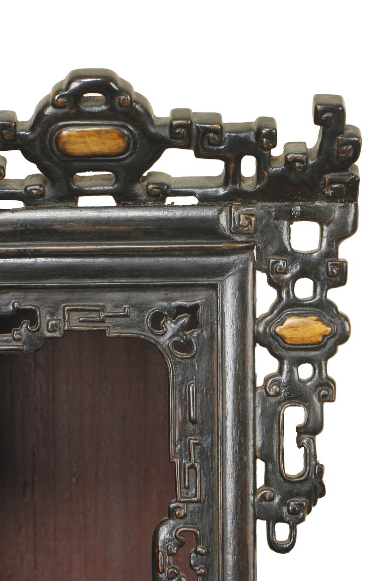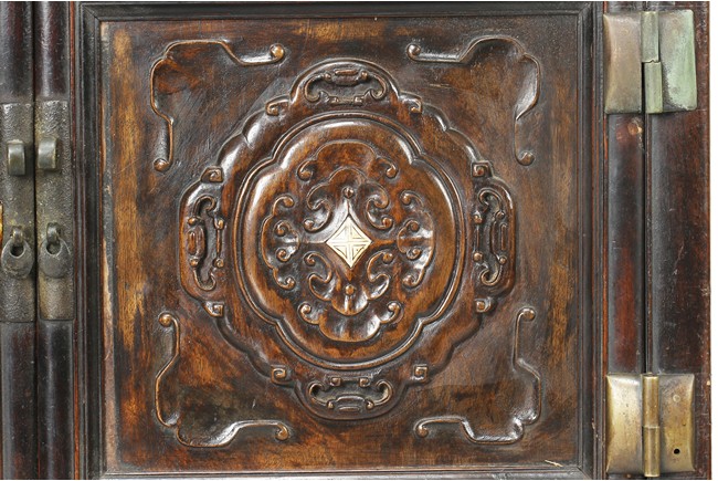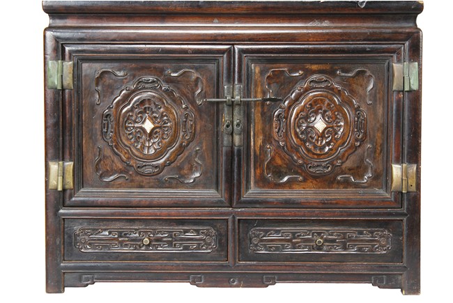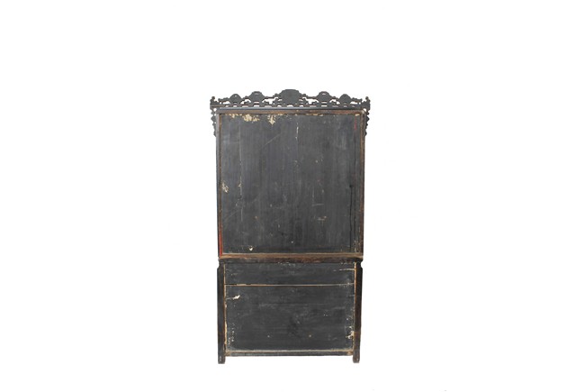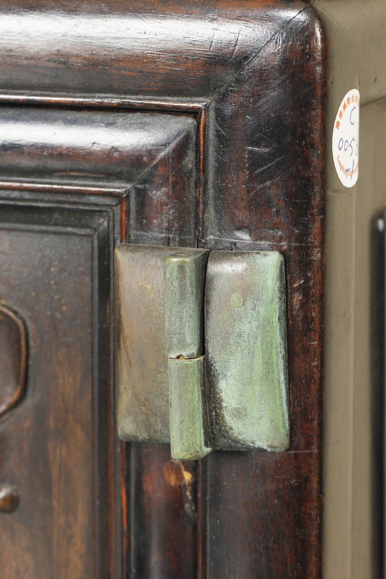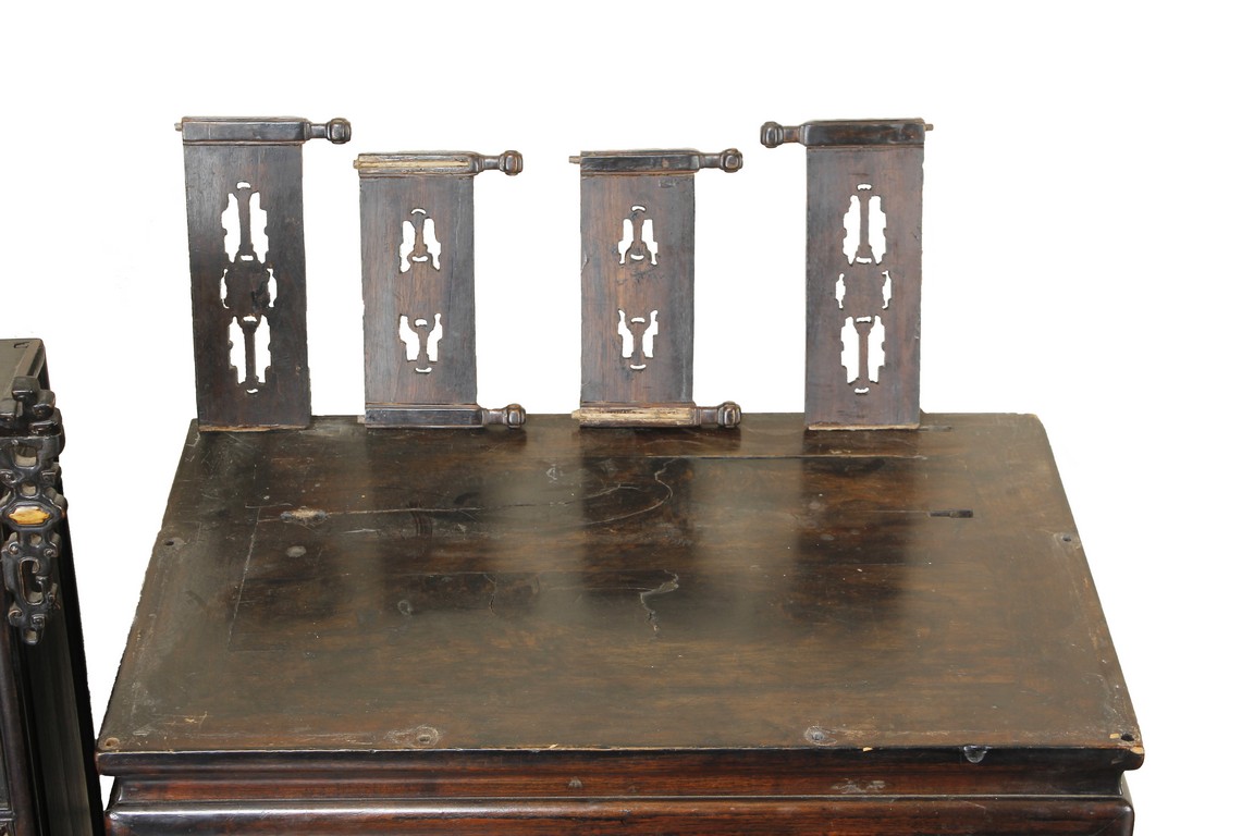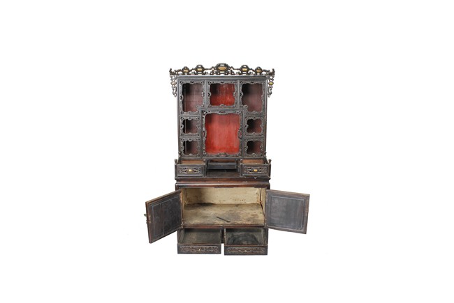 Of rectangular form,the wooden altar's center is to hold and display the Buddha figure,seven smaller openings surrounds the larger center opening,each with pierce carved skirt,three small drawers right below,with rail and space reserved for offerings,additional cabinet space and drawers below,carved with flower and other stylized patterns,with bronze hinges and lock. Wood with natural color and grain,some age related wear and damage. Qing Dynasty period.