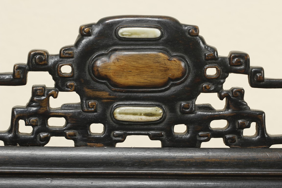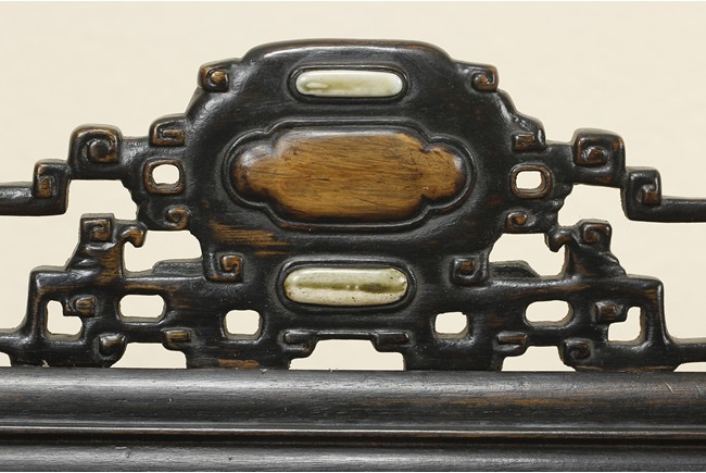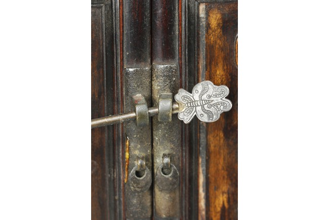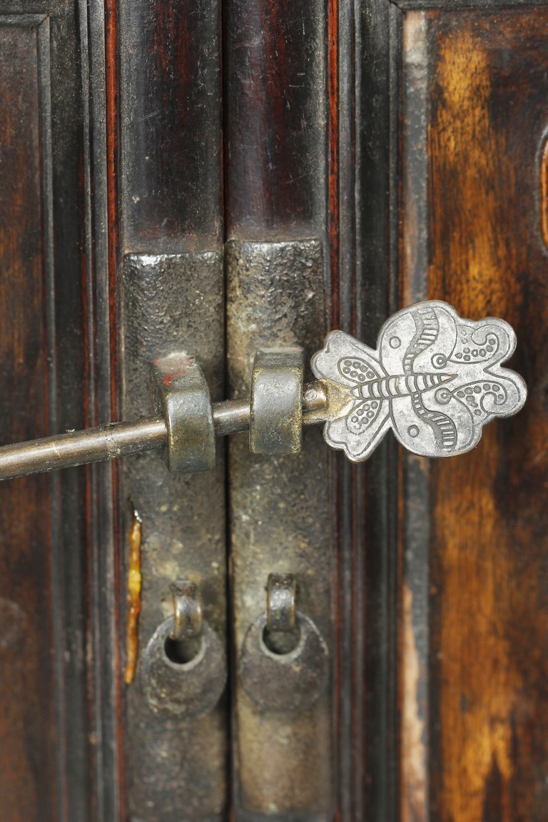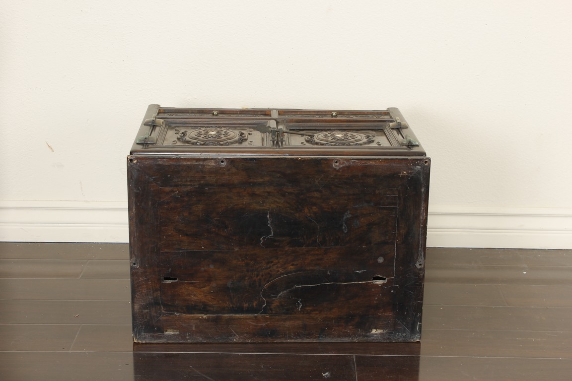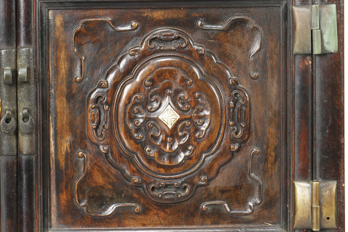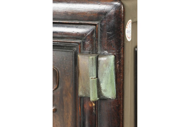 Of rectangular form,the wooden altar's center is to hold and display the Buddha figure,seven smaller openings surrounds the larger center opening,each with pierce carved skirt,three small drawers right below,with rail and space reserved for offerings,additional cabinet space and drawers below,carved with flower and other stylized patterns,with bronze hinges and lock. Wood with natural color and grain,some age related wear and damage. Qing Dynasty period.