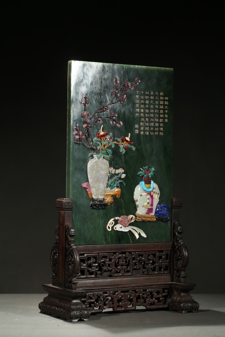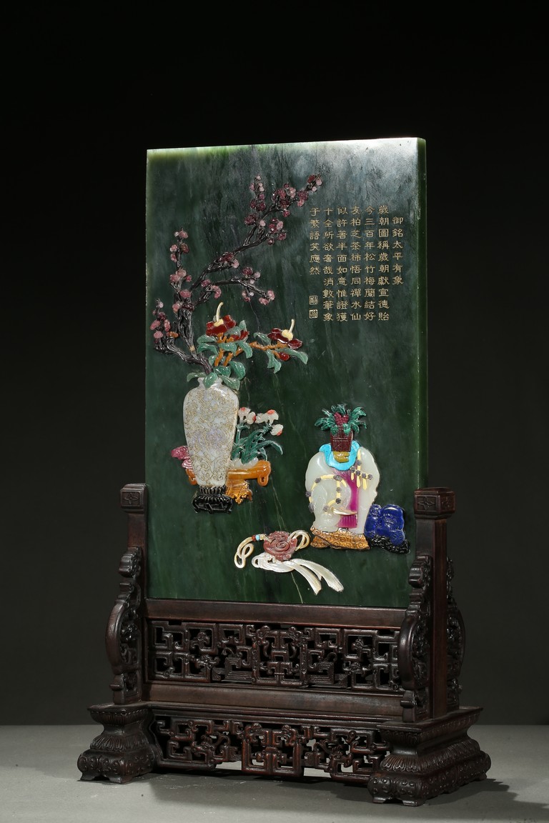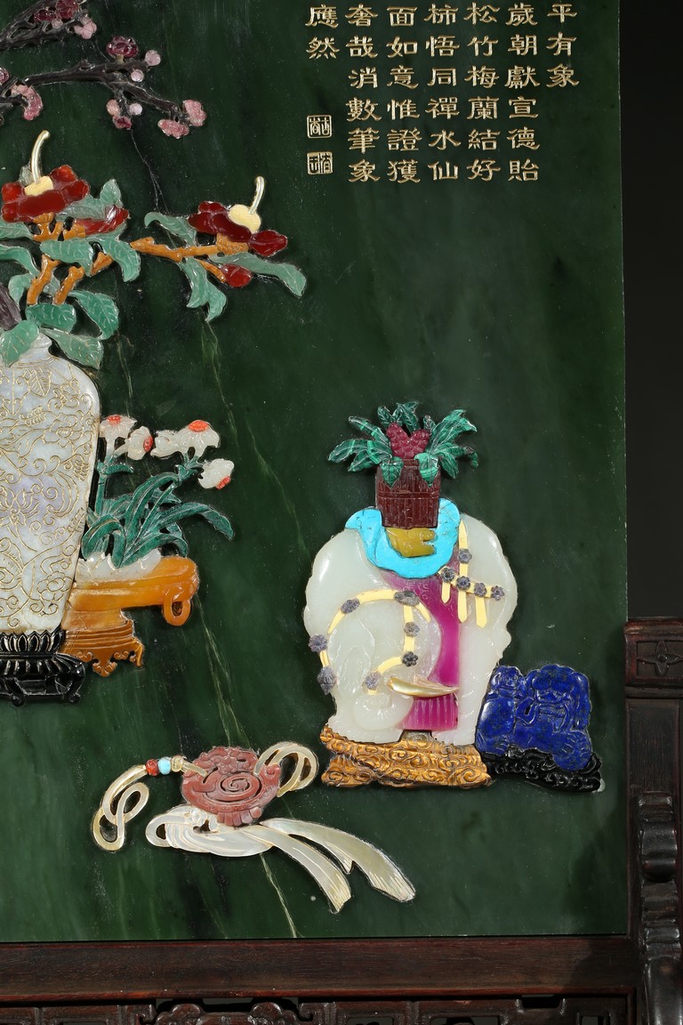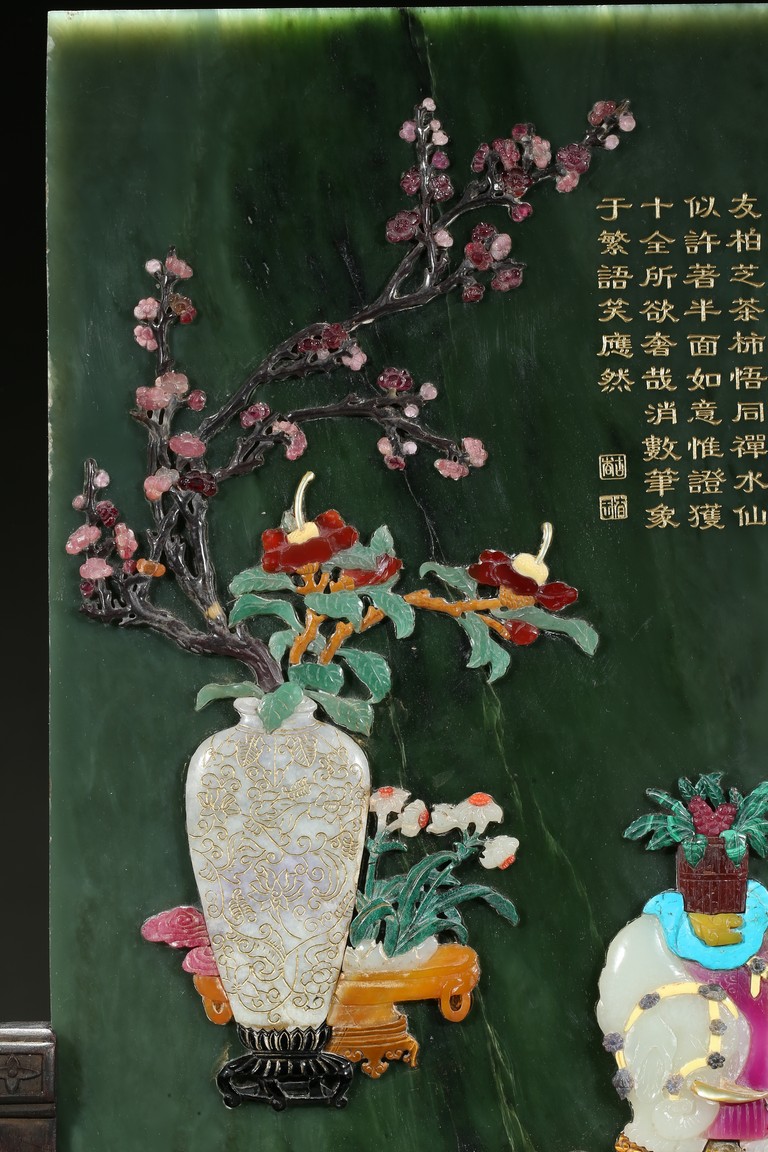 Of upright rectangular shape,the spinach jade finely embellished with pink quartz,white jade,turquoise,malachite,red agate,yellow agate,mother-of-pearl,lapis lazuli,and other gems to depict scholar's objects including a vase containing plum blossoms branches,a round dish containing leafy flowers,and an elephant carving,the upper right corner inscribed in gilt-inscription of Imperial poem.