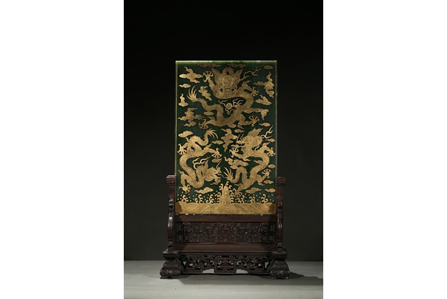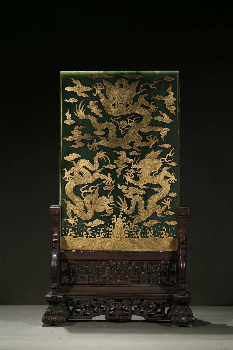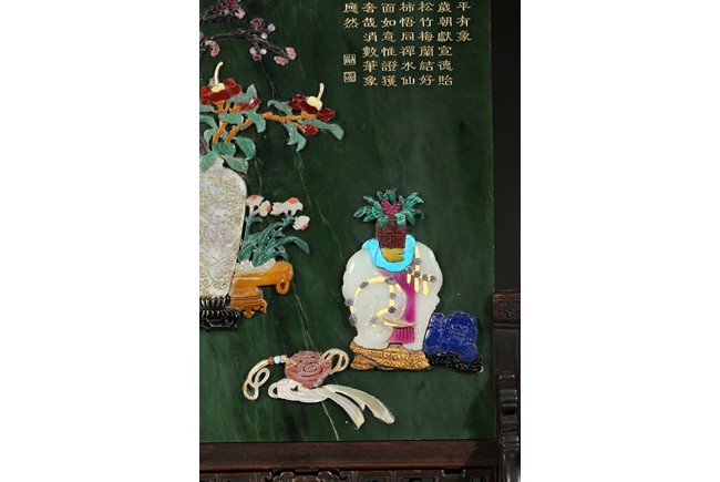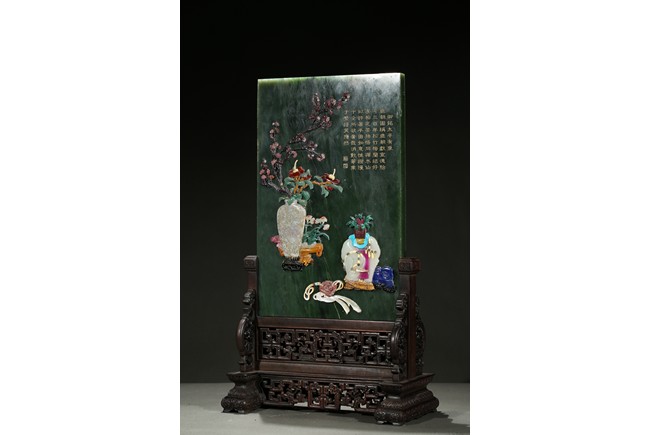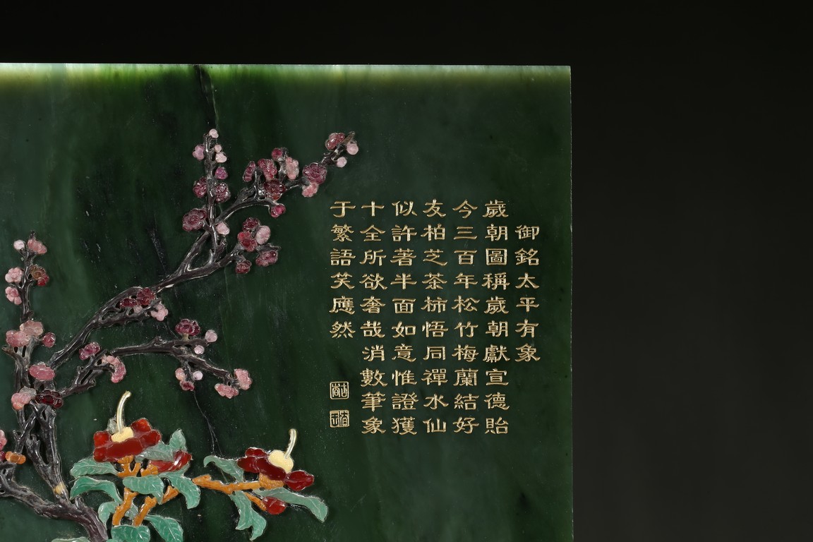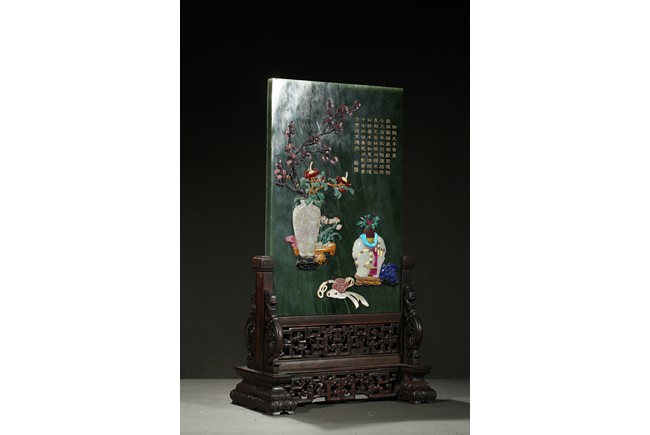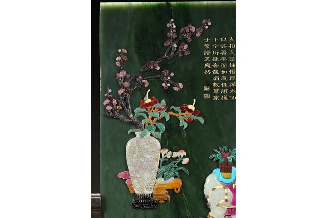 Of upright rectangular shape,the spinach jade finely embellished with pink quartz,white jade,turquoise,malachite,red agate,yellow agate,mother-of-pearl,lapis lazuli,and other gems to depict scholar's objects including a vase containing plum blossoms branches,a round dish containing leafy flowers,and an elephant carving,the upper right corner inscribed in gilt-inscription of Imperial poem.