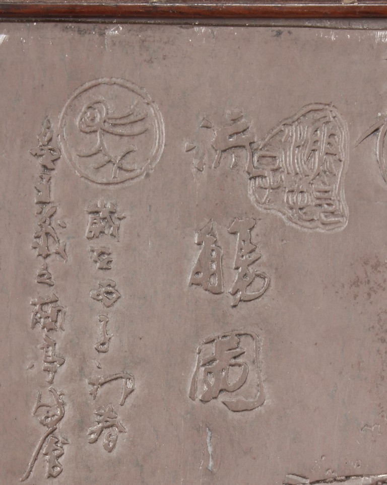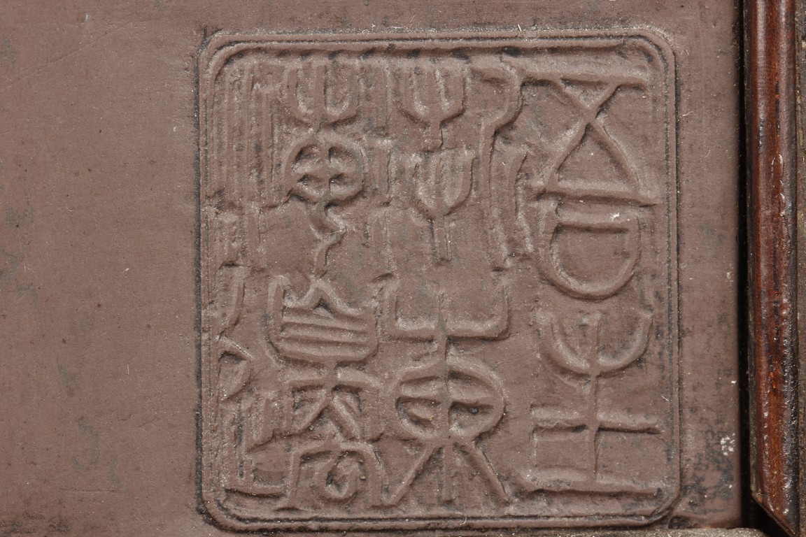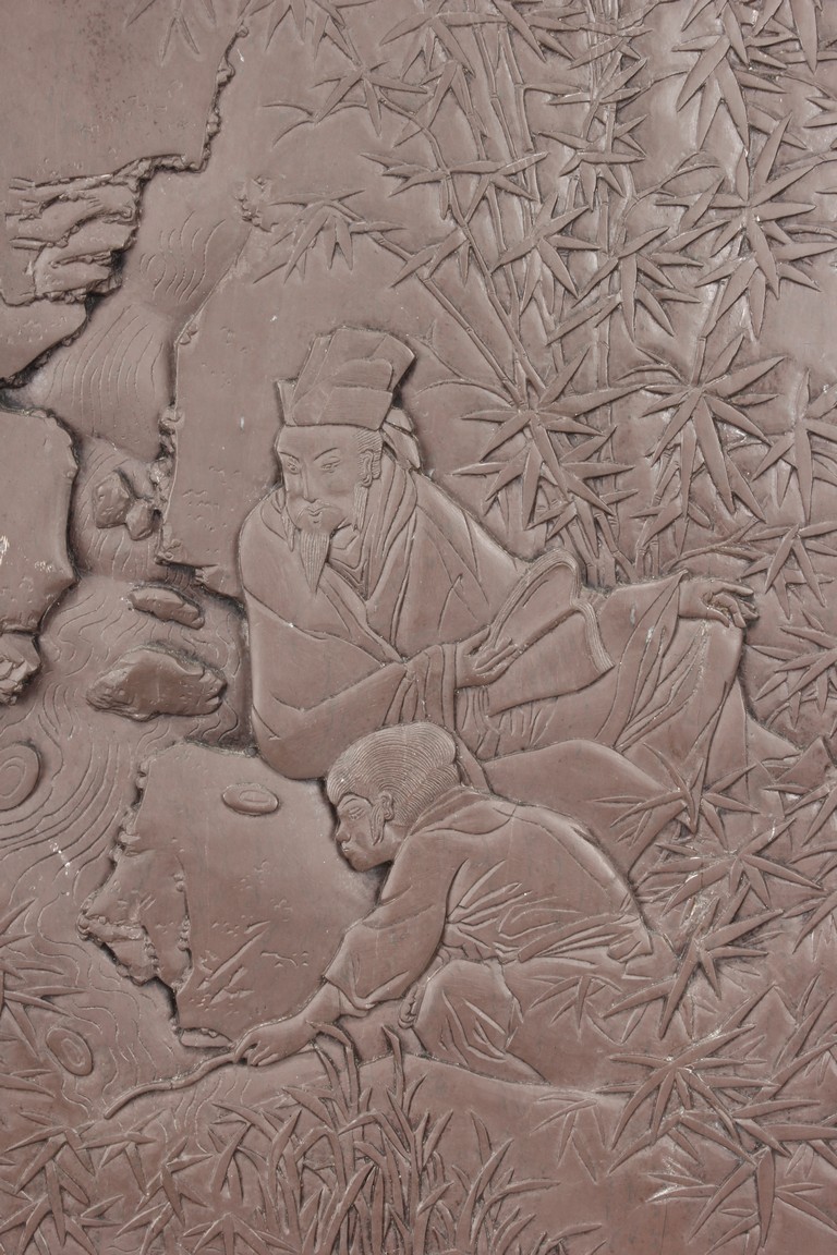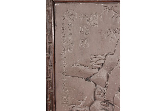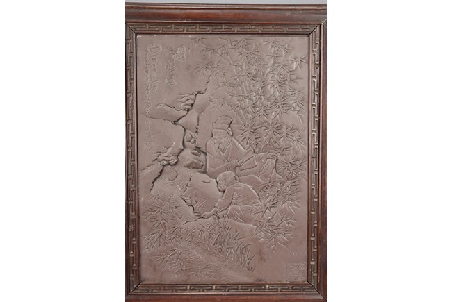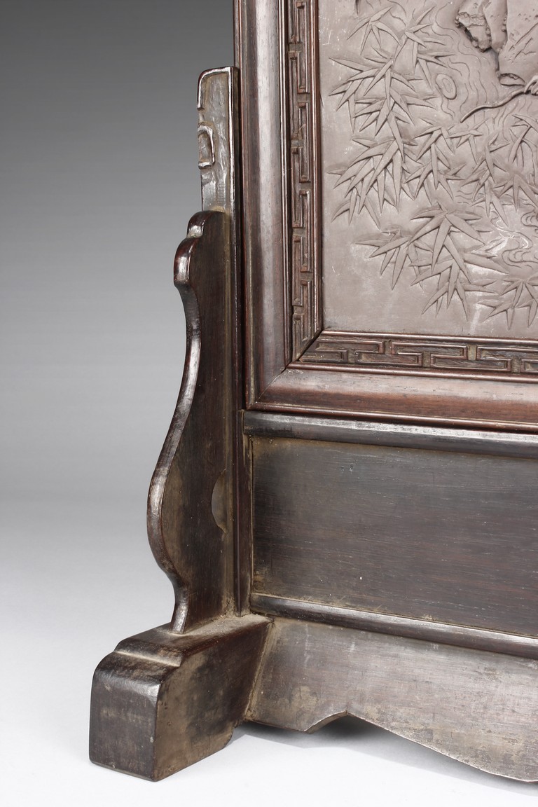 Of rectangular from,the Duan stone plaque depicts an elder and child in an riverside setting,resting near bamboo trees close to downstream ,with poetry calligraphy and artist signature on top left,all enclosed in carved wooden frame,inset in original wooden stand,the front low relief carved with lotus flower and plants,the reverse in plain design. Qing Dynasty period.