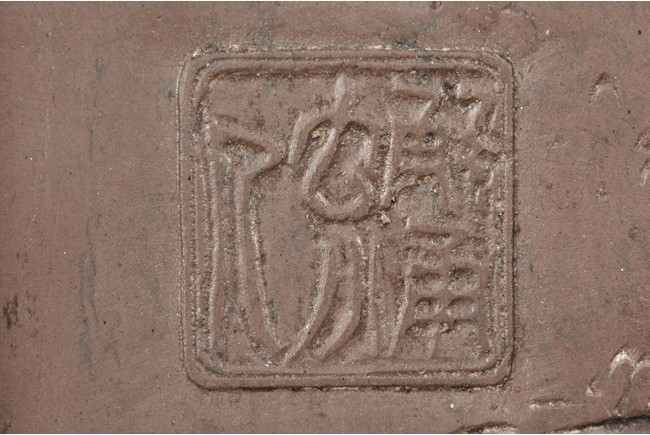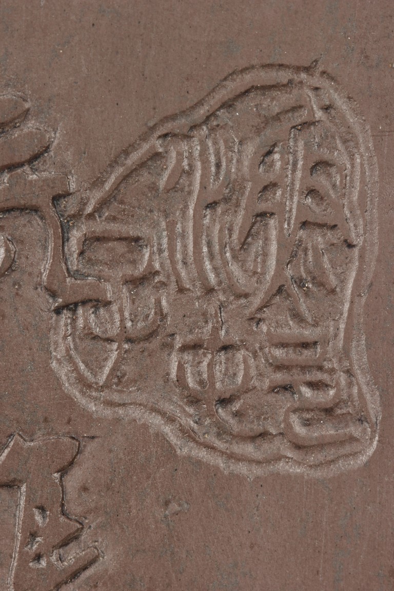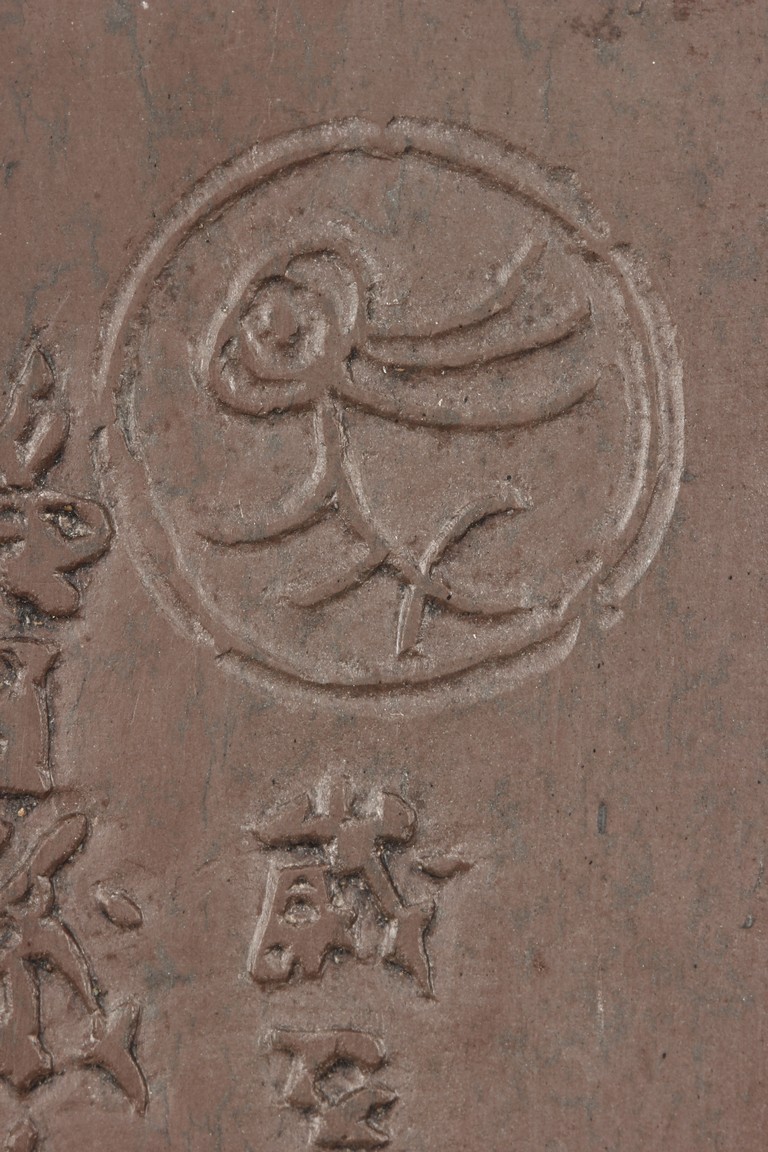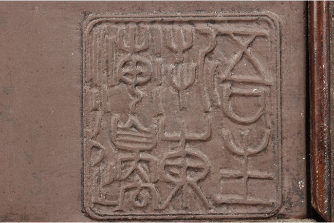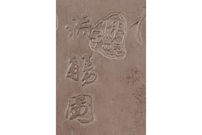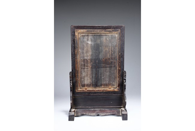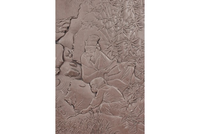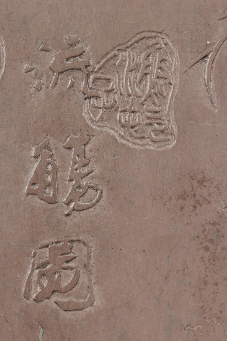 Of rectangular from,the Duan stone plaque depicts an elder and child in an riverside setting,resting near bamboo trees close to downstream ,with poetry calligraphy and artist signature on top left,all enclosed in carved wooden frame,inset in original wooden stand,the front low relief carved with lotus flower and plants,the reverse in plain design. Qing Dynasty period.
