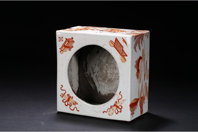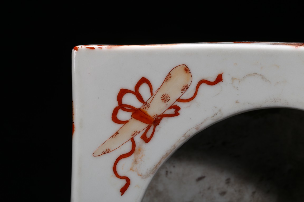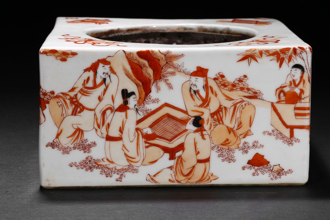 Of square section,the rectangular washer painted in famille rose,with a continuous figural scene depicting one group of scholars playing chess game,while others are playing instrument. Qing Dynasty period.