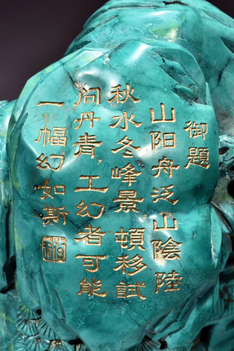Modelled in the form of ovoid boulder,it is carved with a deep mountain setting with an elderly gentleman riding a donkey accompanied by an attendant walking along a rocky cliff pathway,above him with an ascending stair path leading to a residence,with an elderly figure holding a staff standing nearby. The top left is incised in gilt with an imperial poem on the rock surface. The reverse is carved with similar setting with a pavilion on cliff below a crane in flight,above a deer with head turned back looking over the crane.