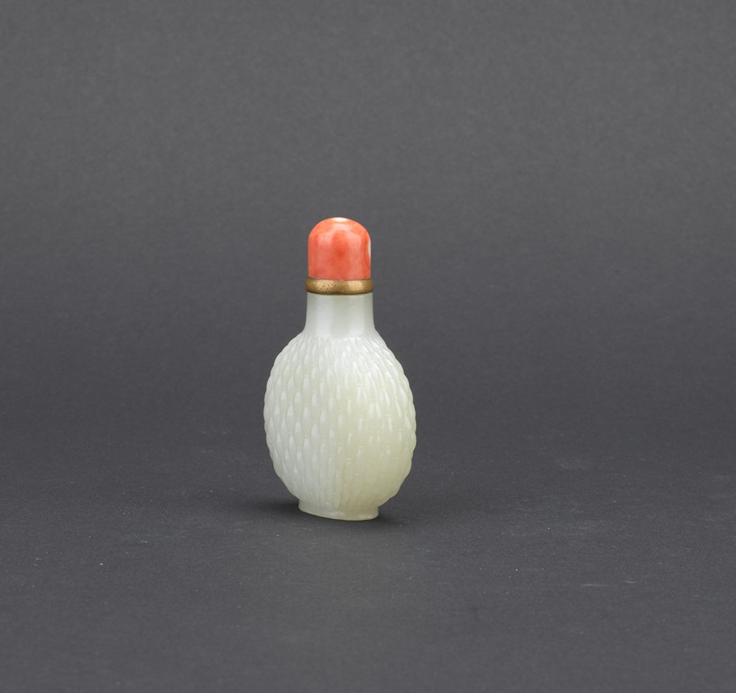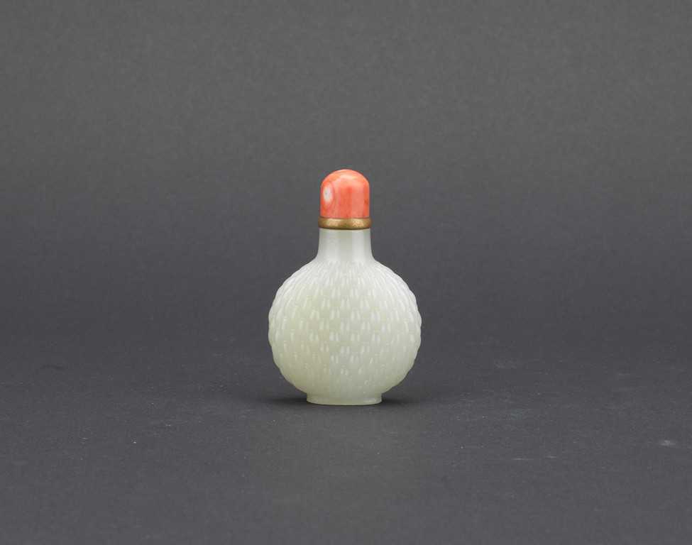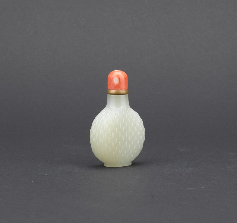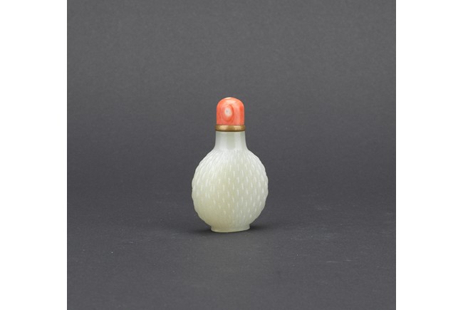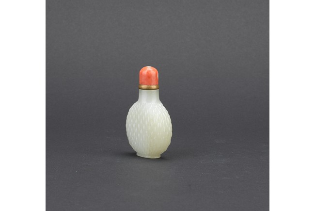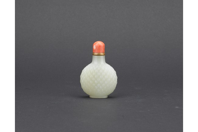 The flattened body rising to a straight neck, overall finely worked to simulate a basket-weave pattern, accompanied with a coral stopper. The stone is of smooth even white tone.Qing Dynasty period.