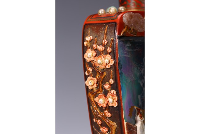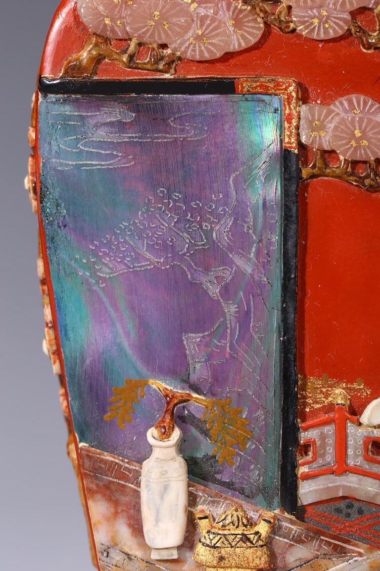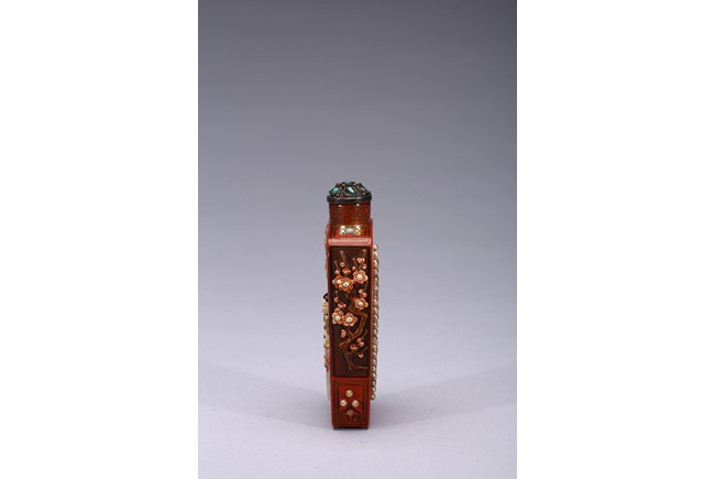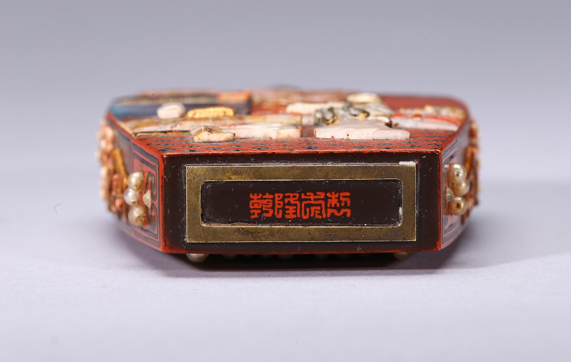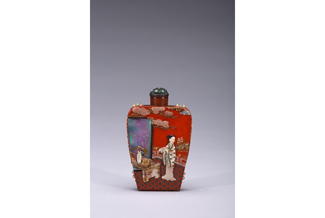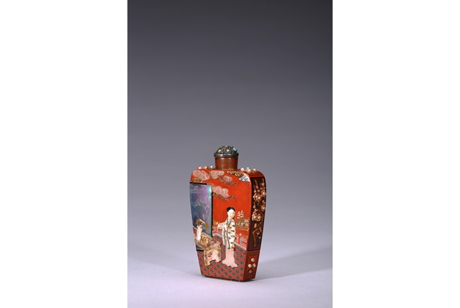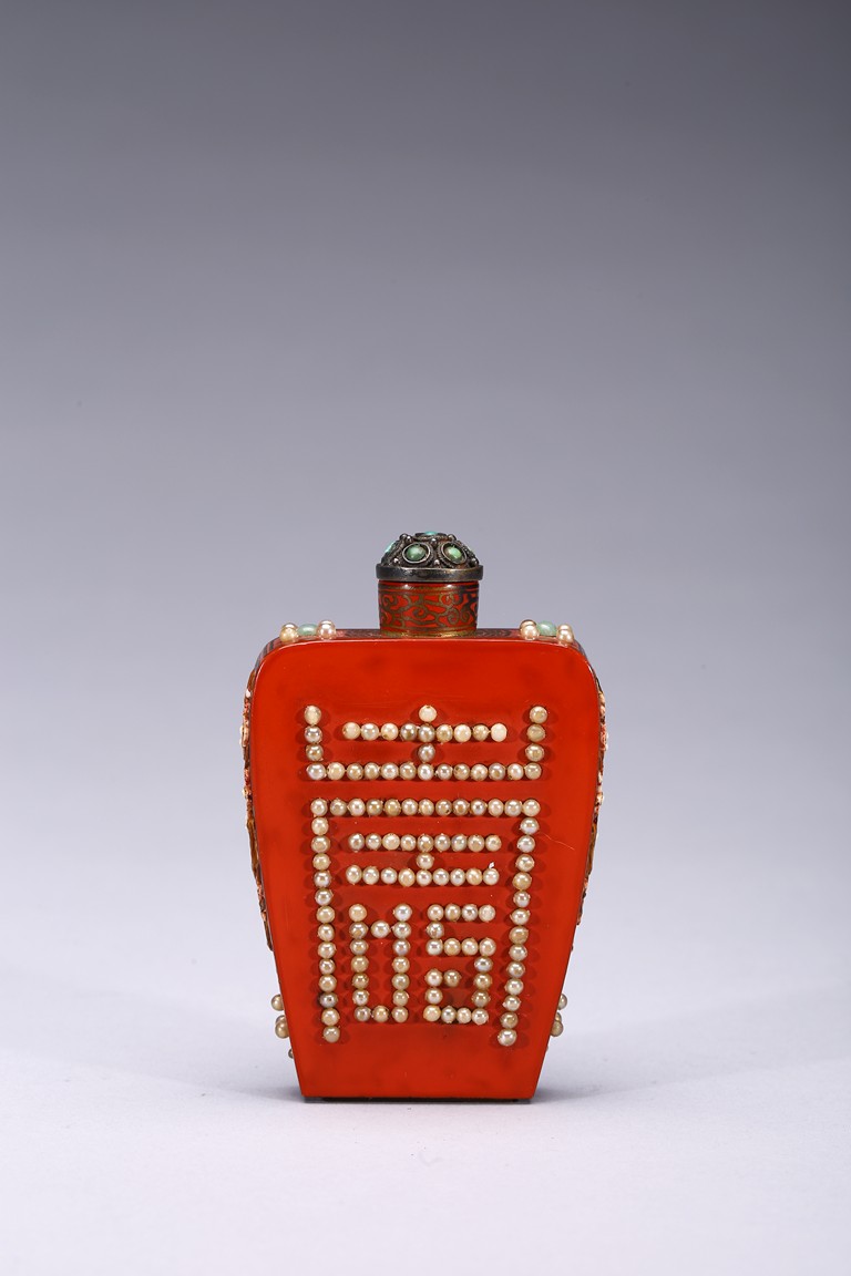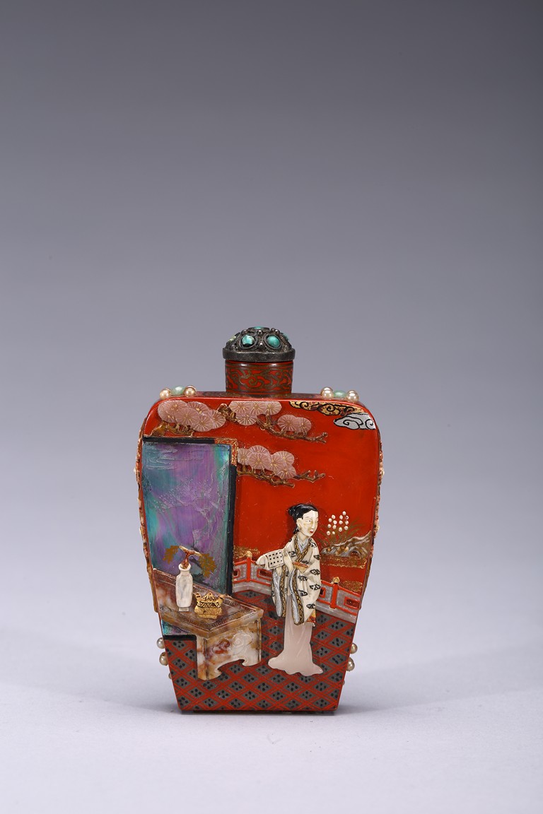 Provenance:.Sotheby's New York, Lot 243, October 1997 清代漆制煙壺極為少見,大多為黑漆嵌螺鈿為之,此煙壺通體修紅漆為地,上嵌百寶並漆畫,側面黑地繪紅網紋。正面一面為仕女圖,一面為珍珠嵌壽字。嵌料為大小各異的珍珠、象牙,壽山石,螺鈿,瑪瑙,翡翠,玉等,嵌工精細非常,人物眉目栩栩如生。整器造型獨特,工藝繁復,品相完好,誠為罕見。來源:紐約蘇富比 1997年10月 拍品號243 洛杉磯Chino Hills 私人多年收藏