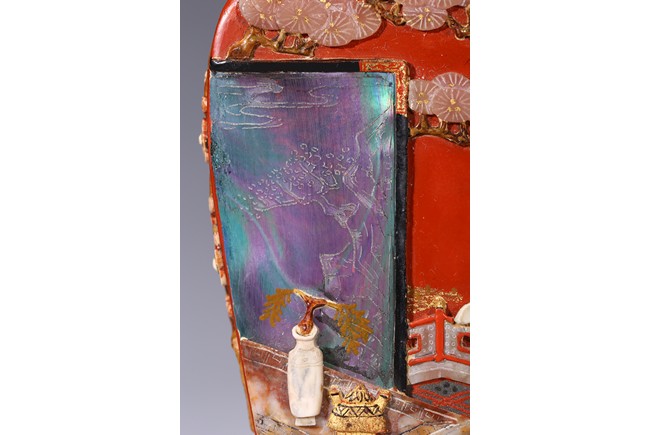 The flattened shield form body coated with layer of red lacquer, richly decorated in carnelian, mother-of-pearl, soapstone, pearl, gold, and lacquer with a graceful lady chanting poems in front of massive painted screen, set in a fenced garden terrace on one side, the reverse with numerous even-sized pearls forming a stylized shou character, each of the narrow shoulders with a panel of prunus blossoms, the base inscribed in red lacquer with four character Qianlong mark. Qing Dynasty period.