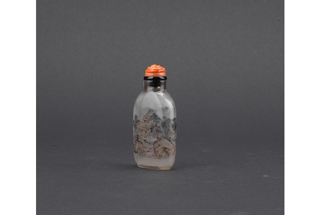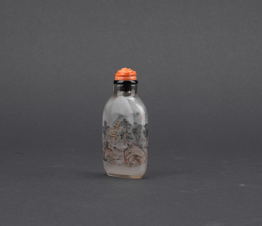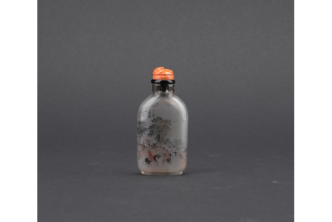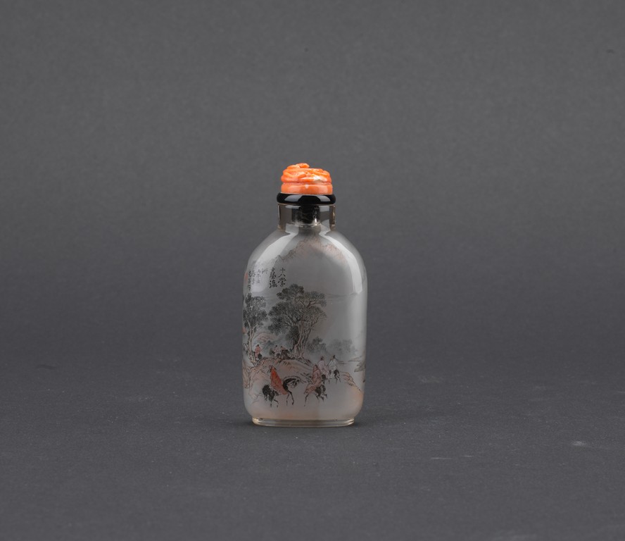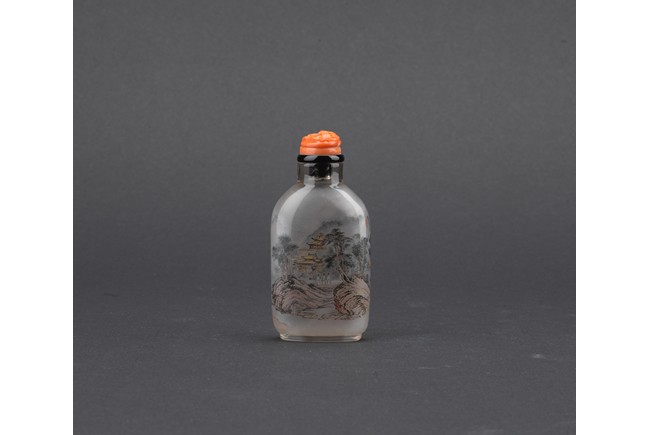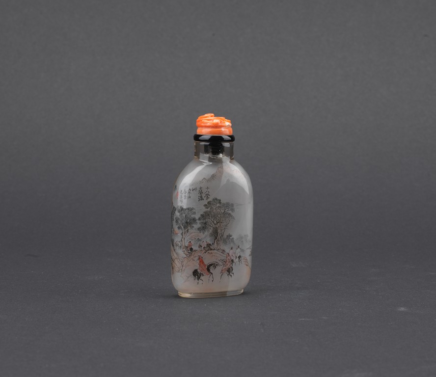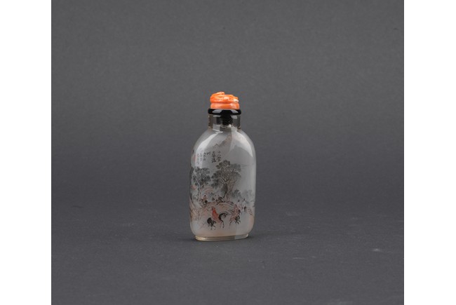 Of flattened baluster form, the transparent glass inside-painted with eighteen scholars on a trip to Yingzhou, one face with an inscription signed Kechang, dated to the year of 1966, the reverse with riverscape scene with palaces and buildings on a cliff with trees.