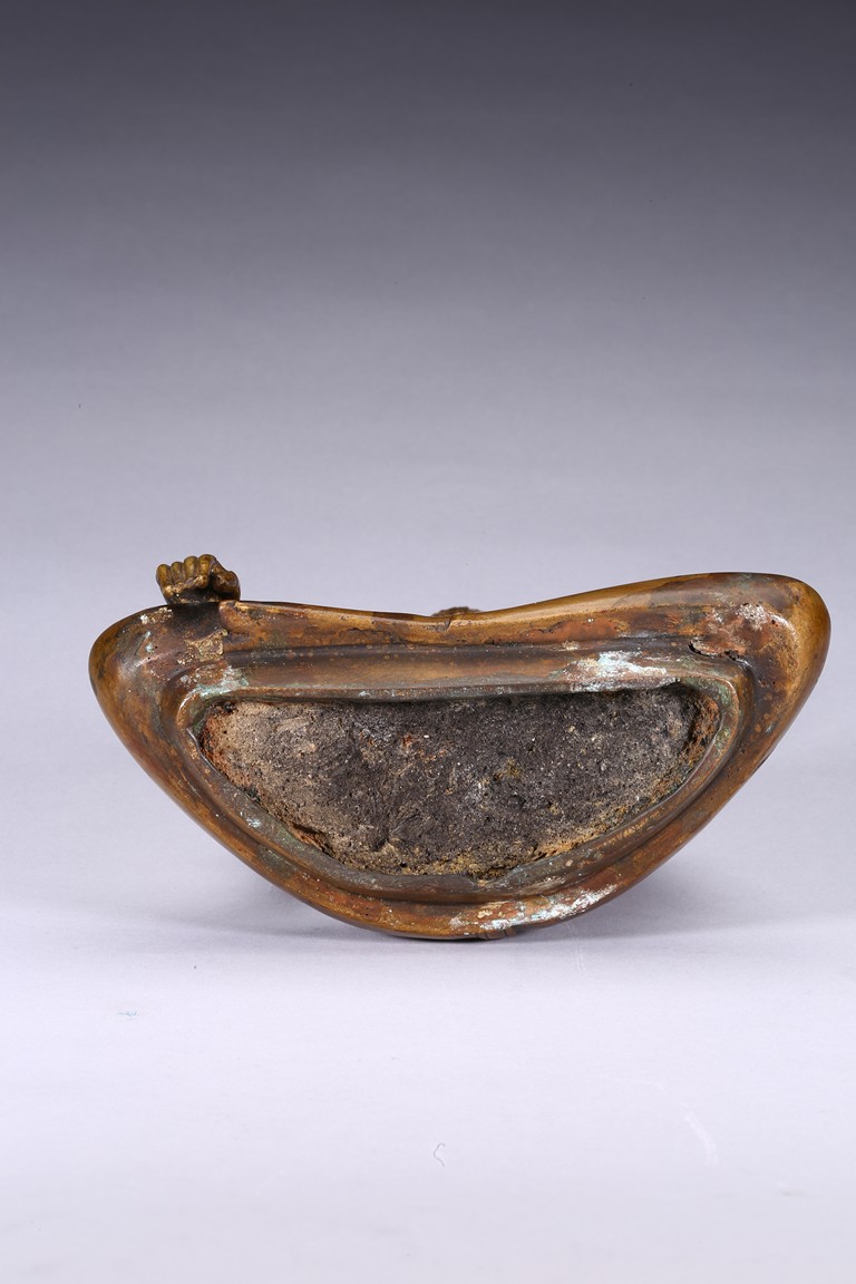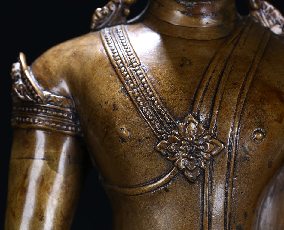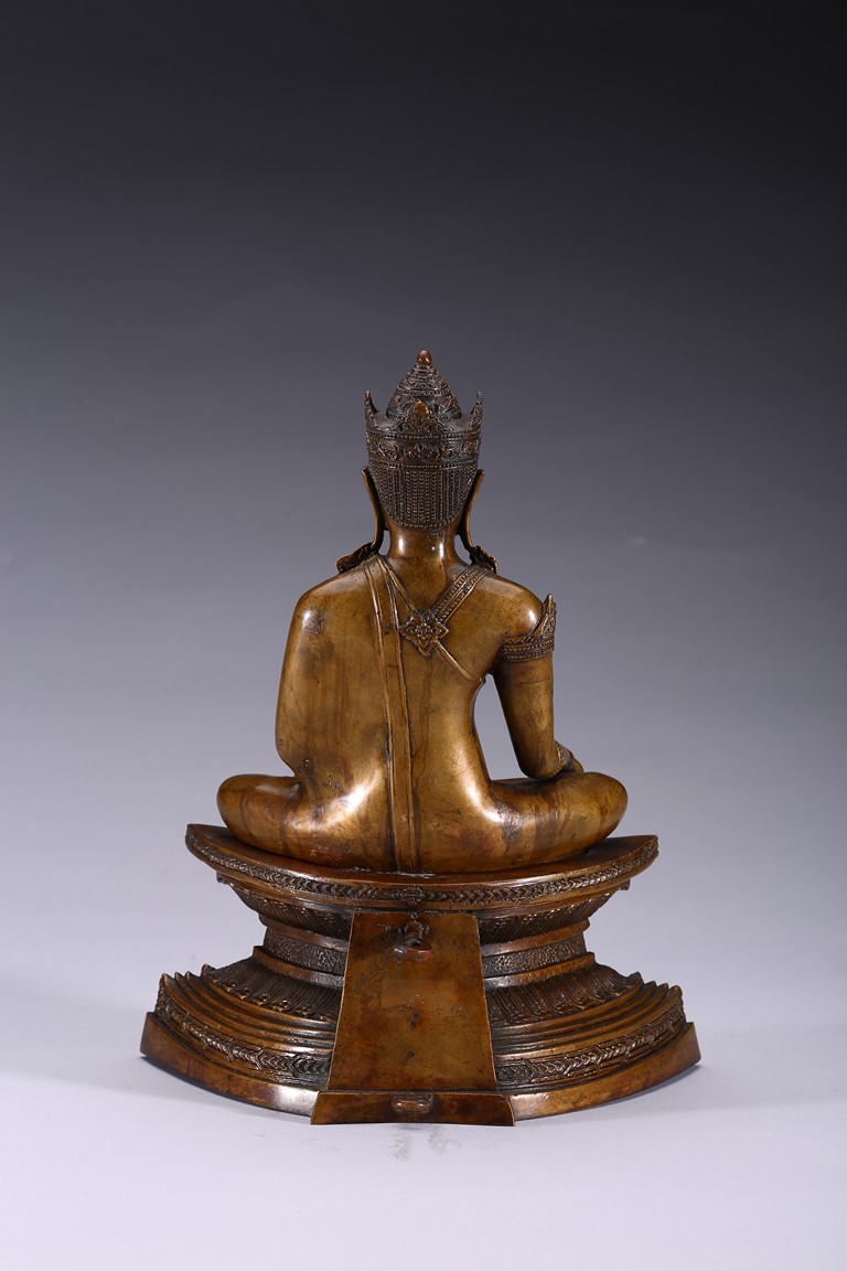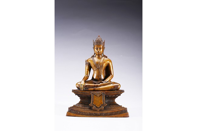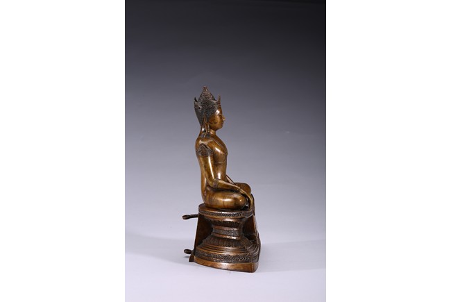 The figure is shown seated in dhayanasa on a concave plinth, the hands in bhumisparshamudra and dhyanamudra, wearing dhoti with incised hem, the face with a serene expression and head framed by an elaborate crown.17th century.