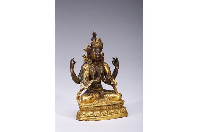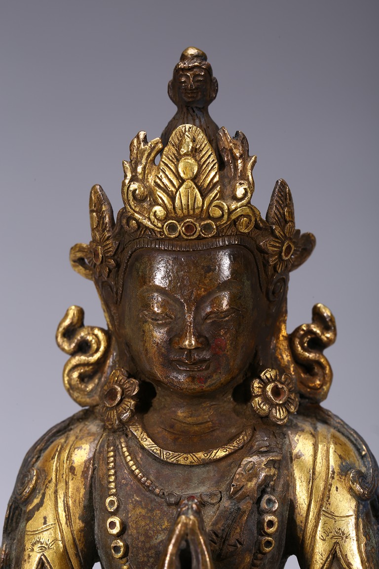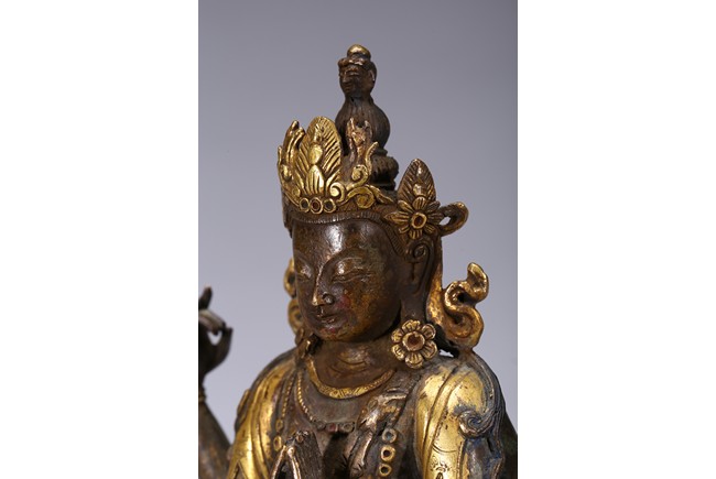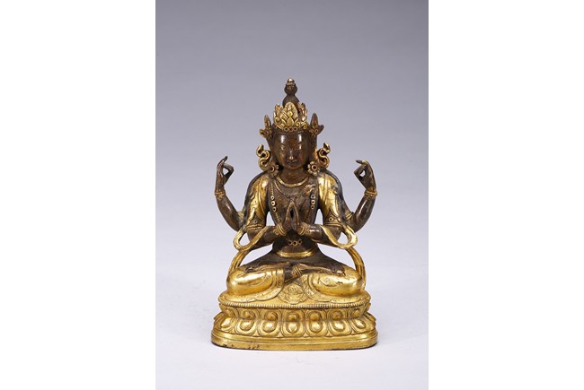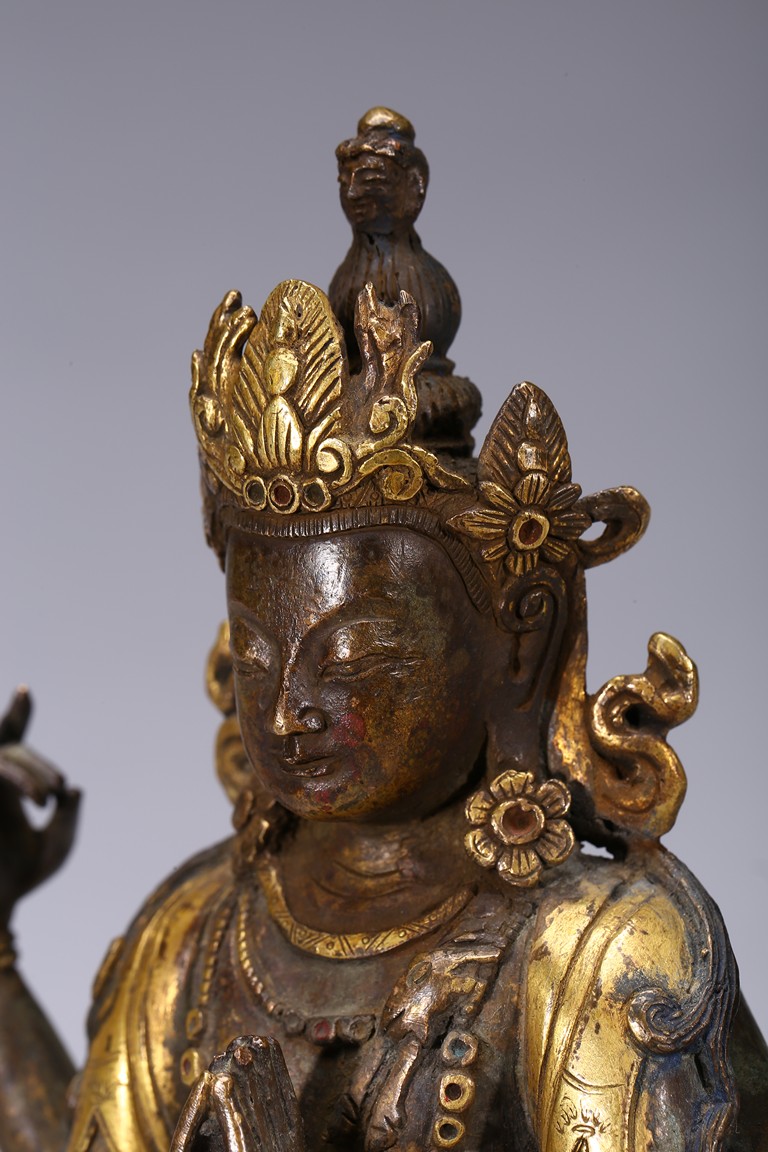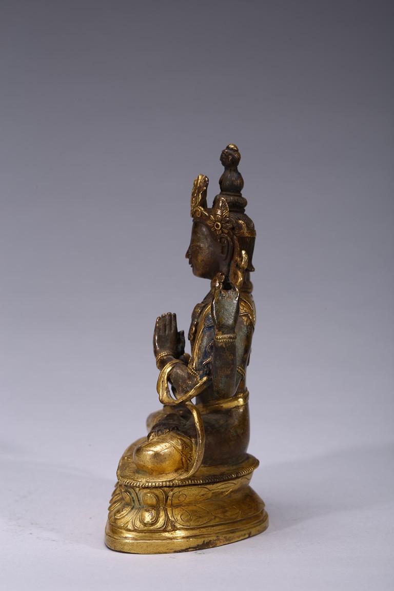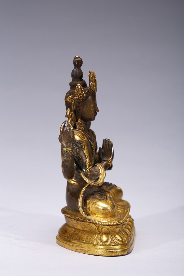 The bodhisattva is shown seated in dhayanasa upon double lotus throne, with primary hands clasped together in front of chest and two arms raised in mutra, wearing beaded jewellry and scarves around arms, face with meditative expression and with hair pulled into a chigon framed with pointed crown. Qing Dynasty period.