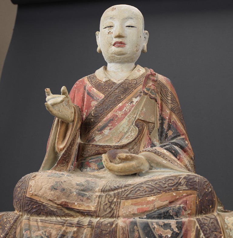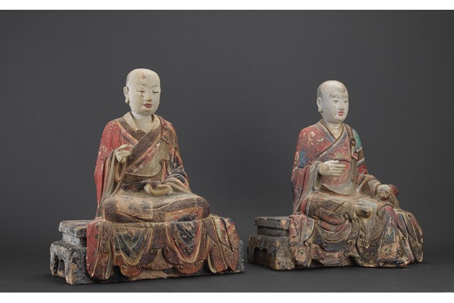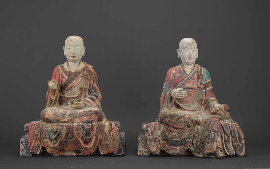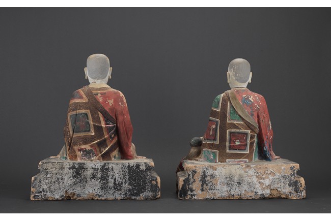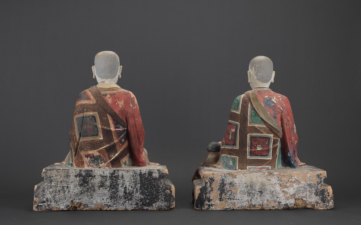 Each of different posture and expression, both wearing folded robe, the face painted white with calm expression, each is polychromed in various pigments, including red, green, blue, brown,yellow, with traces of pigment loss. Both are shown seated upon a large square plinth. Ming Dynasty period.