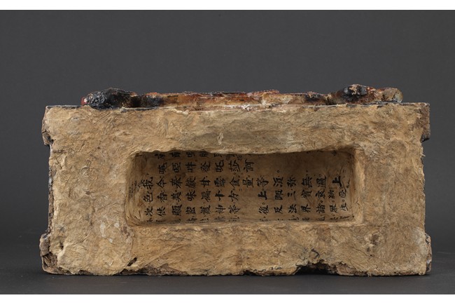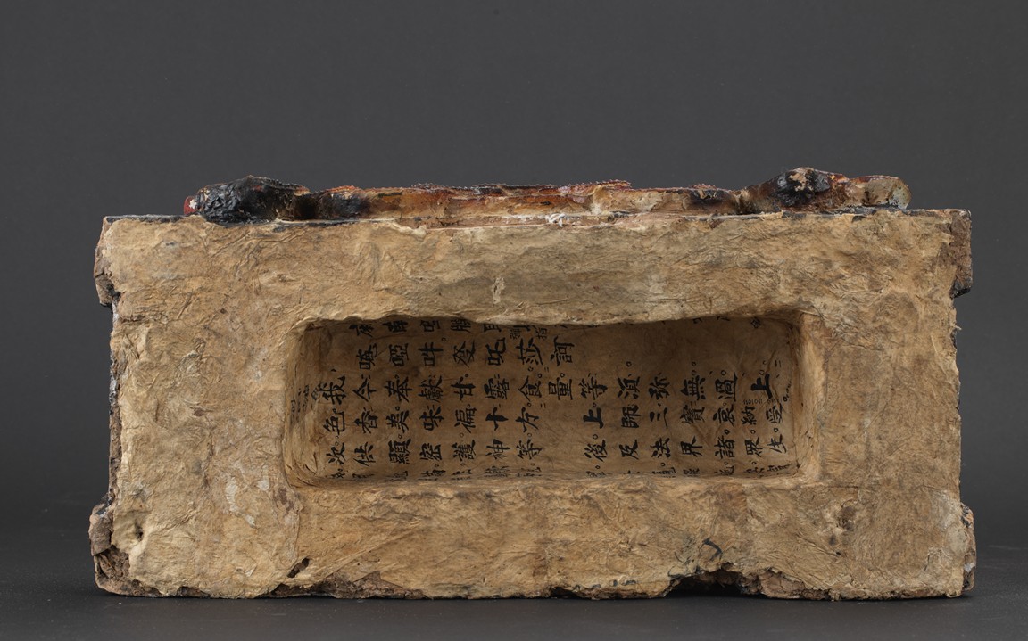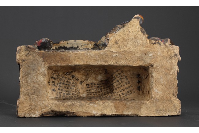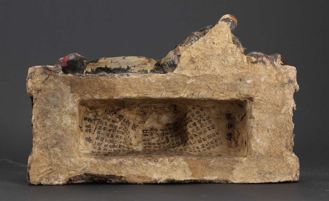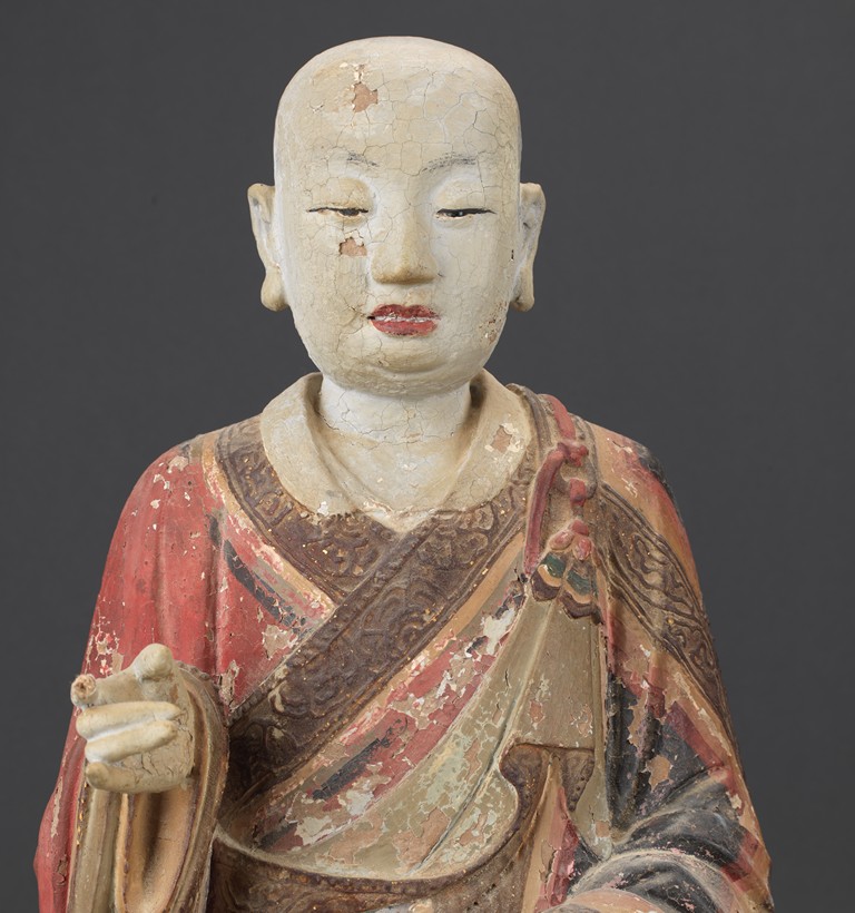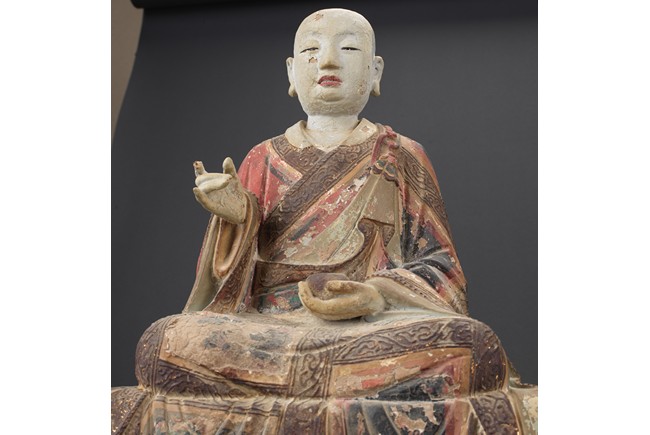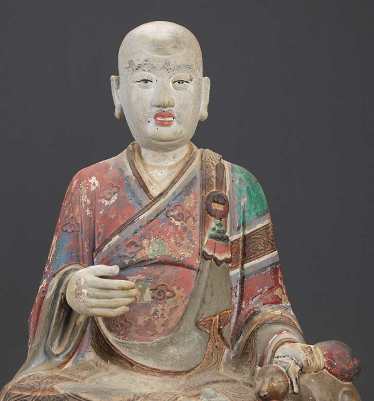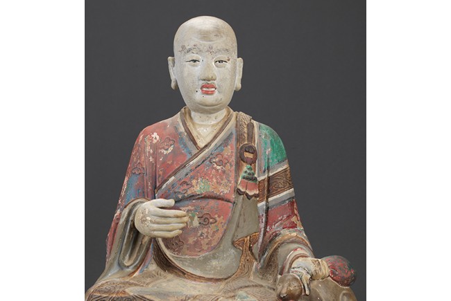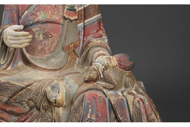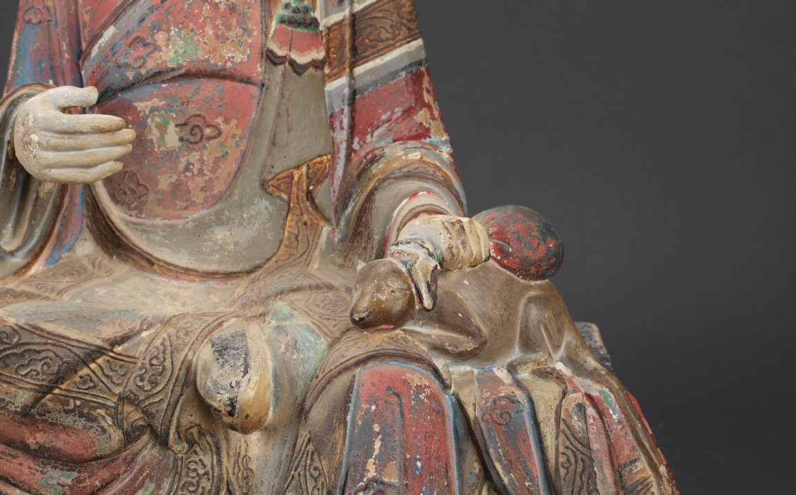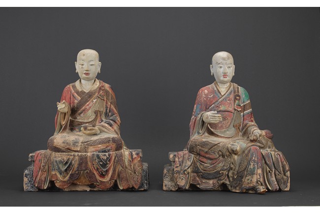 大乘佛教寺院中常供奉有十六羅漢、十八羅漢。唐代<<法住記>>載,謂偉大的佛陀臨涅盤時,囑付十六大阿羅漢,自延壽量,常住世間,遊化說法,作眾生福田,故佛寺叢林裏常雕塑羅漢像,供養者眾。十八羅漢乃世人於十六羅漢外另加降龍、伏虎二羅漢。羅漢,是阿羅漢的簡稱。含有殺賊、無生、應供等義。殺賊是殺盡煩惱之賊,無生是解脫生死不受後有,應供是應受天上人間的供養。此件拍品為兩尊泥塑彩繪羅漢像,面向雕刻極為寫實,衣紋貼體垂落於臺座之上,彩繪色彩濃艷,一尊造像左手捏一吐寶鼠,遊戲坐姿坐於臺座。另一尊造像左手持缽放於身前,雙腳結跏趺坐坐於臺上,眼神微微俯視,氣場莊重,嚴肅。兩尊均品相完好,十分難得。