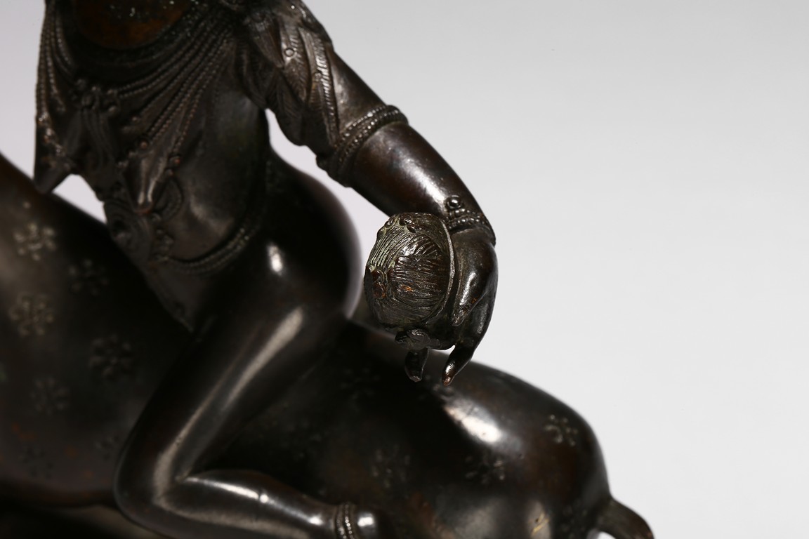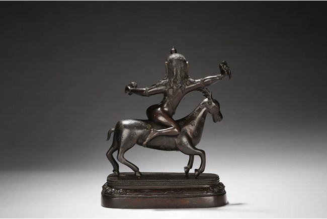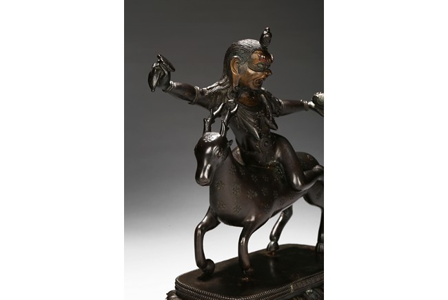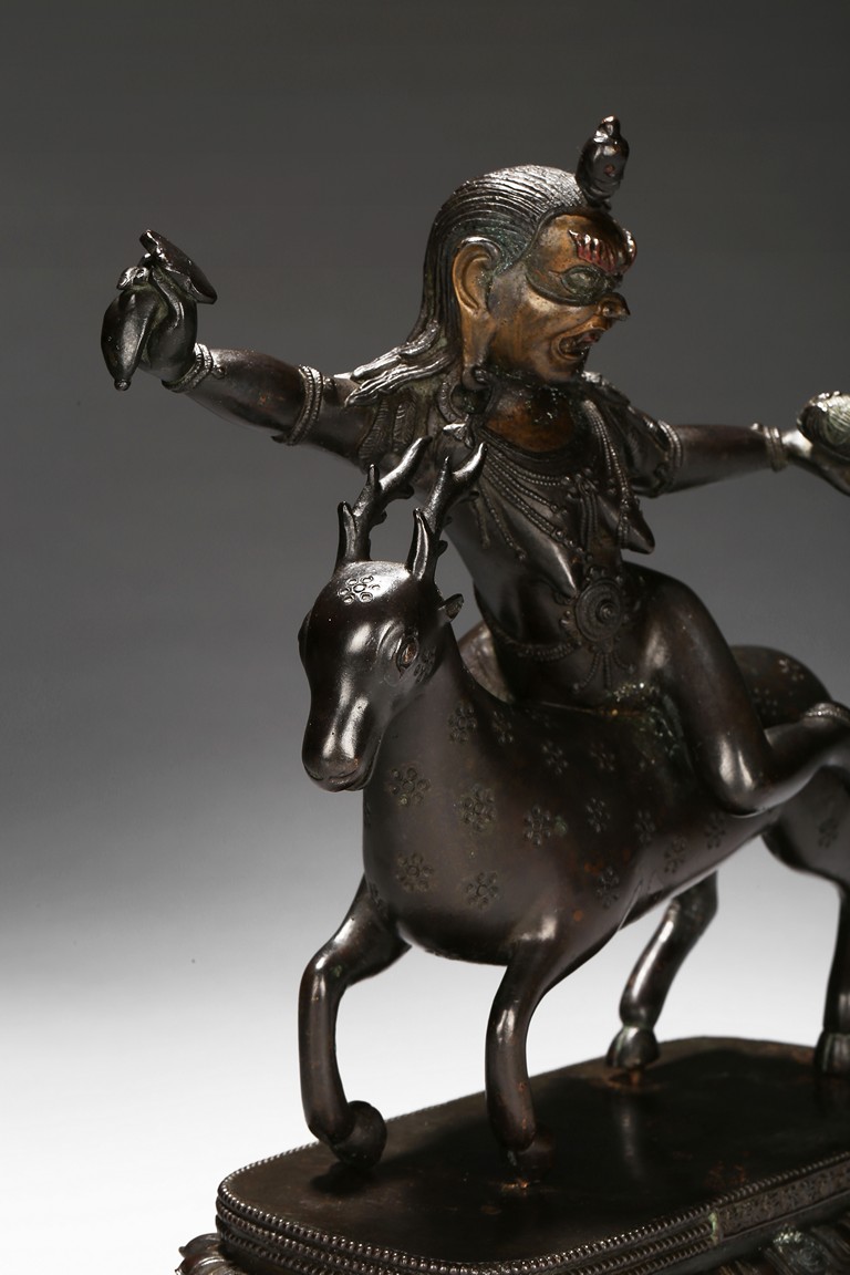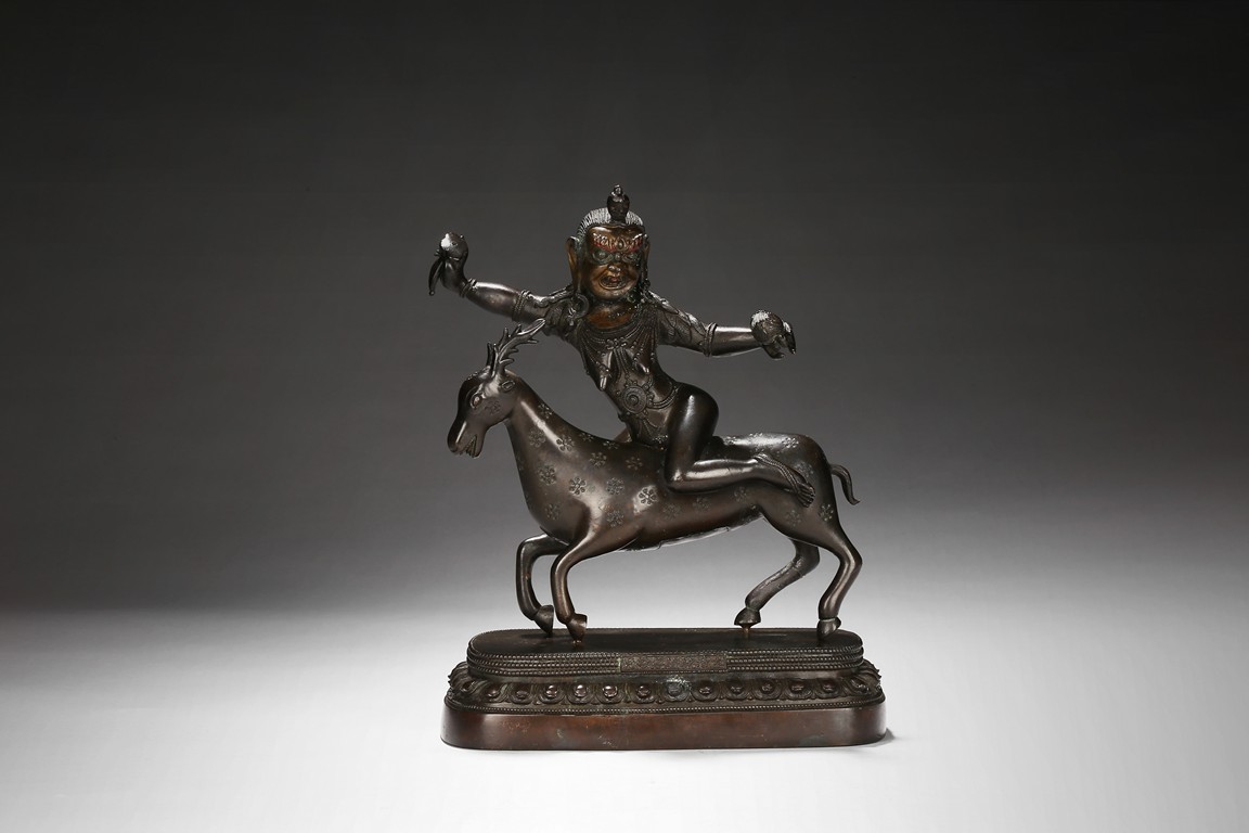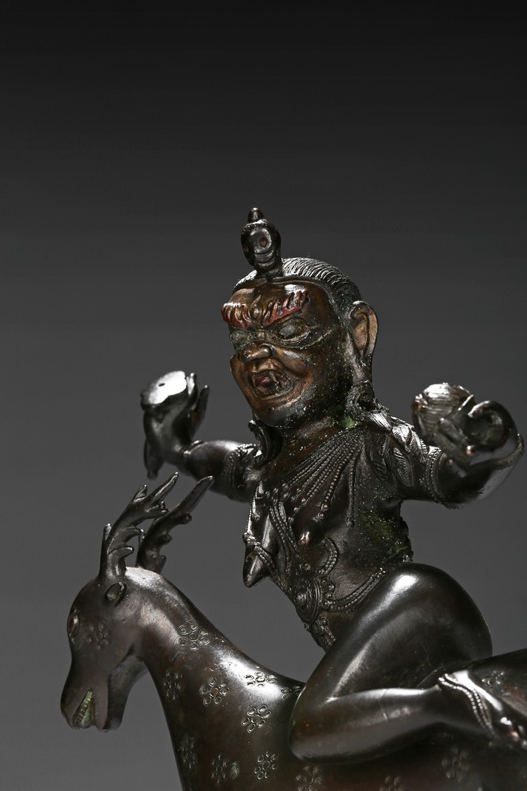 The deity is shown seated on a deer upon a lotus throne cast with six character reign mark , both hands outstretched holding a ritual object, face with ferocious expression, body adorned with beaded jewellry. Qing Dynasty period.
