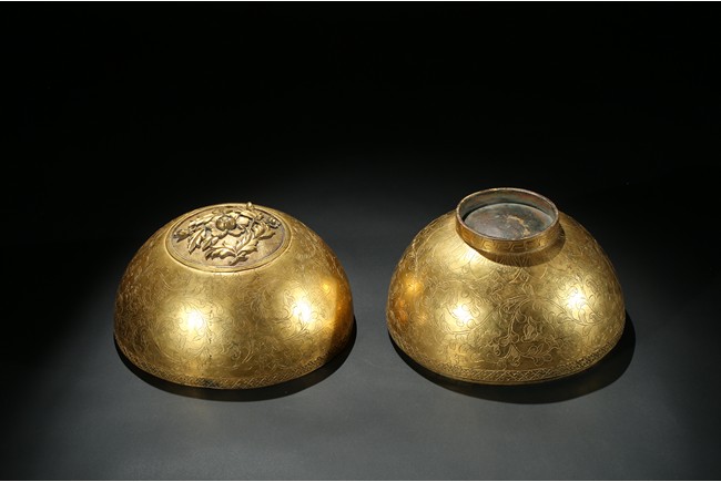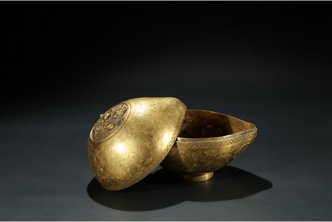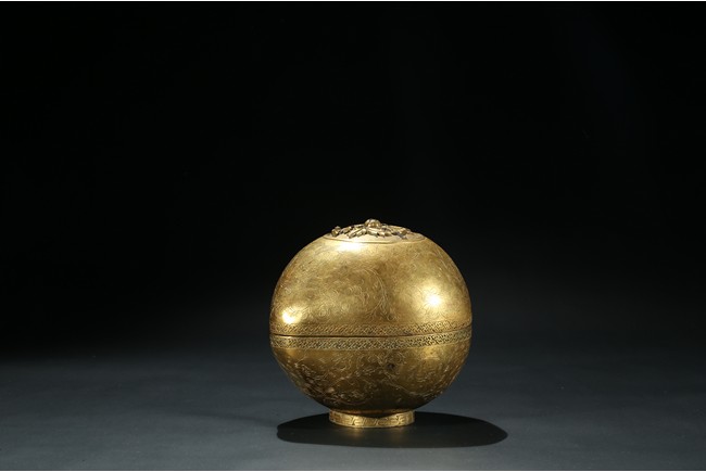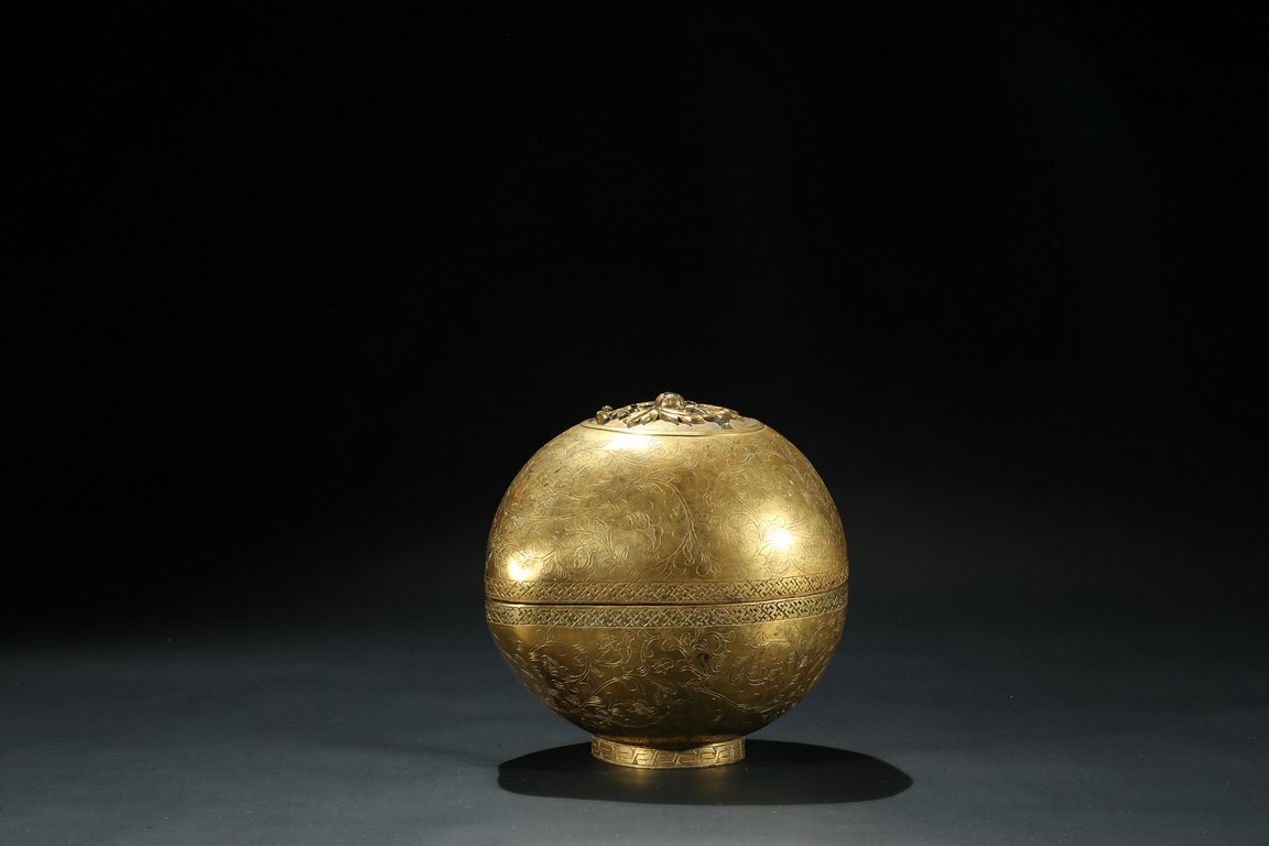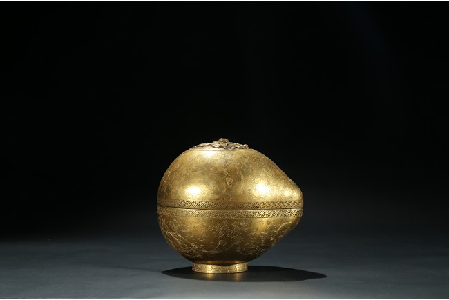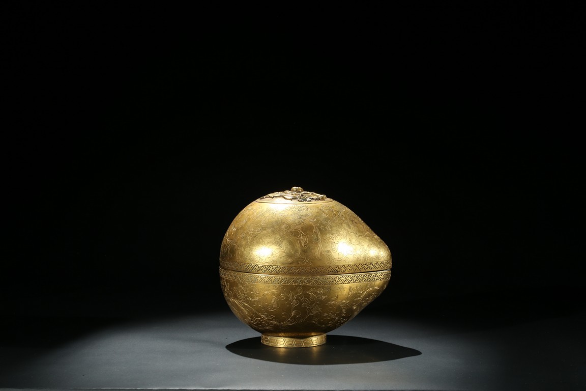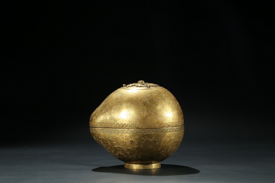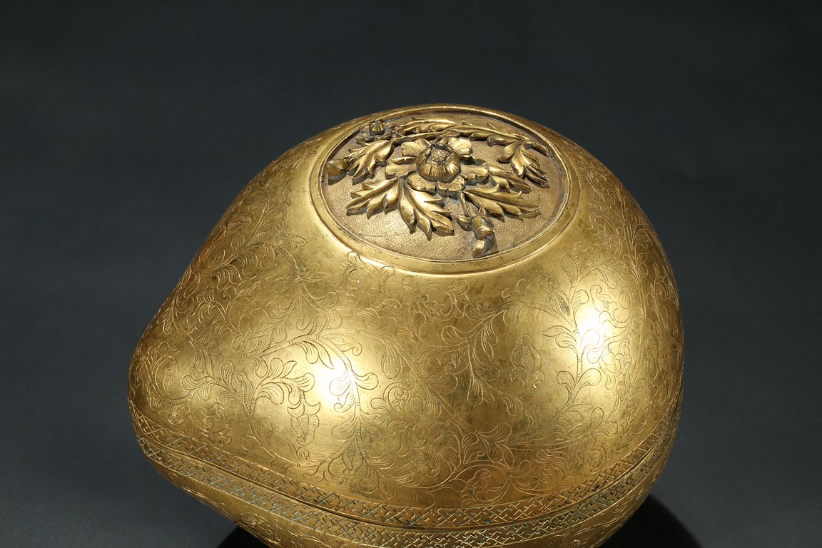 Modelled in the form of a peach and supported on a circular foot, the top cover finely decorated in relief with leafy flower braches within a roundel, overall finely incised with leafy flower scrolls. Qing Dynasty period.