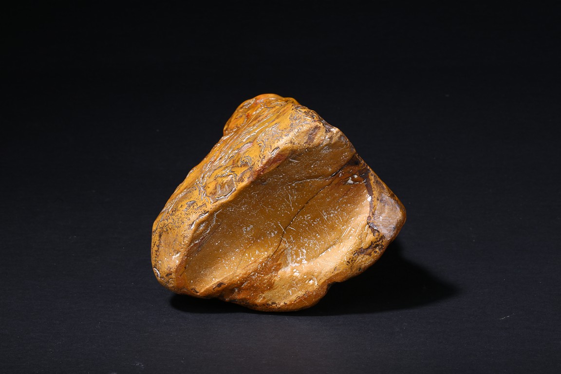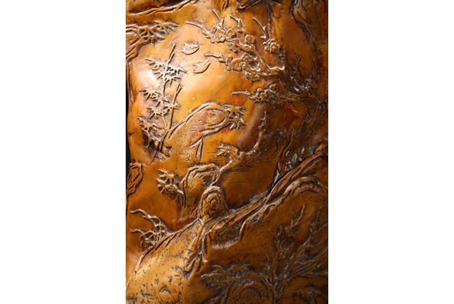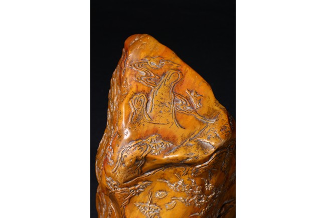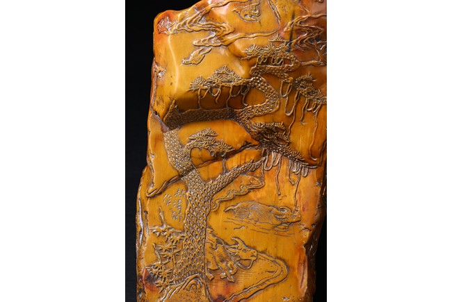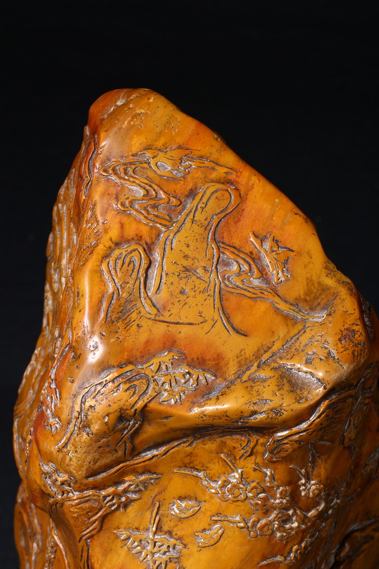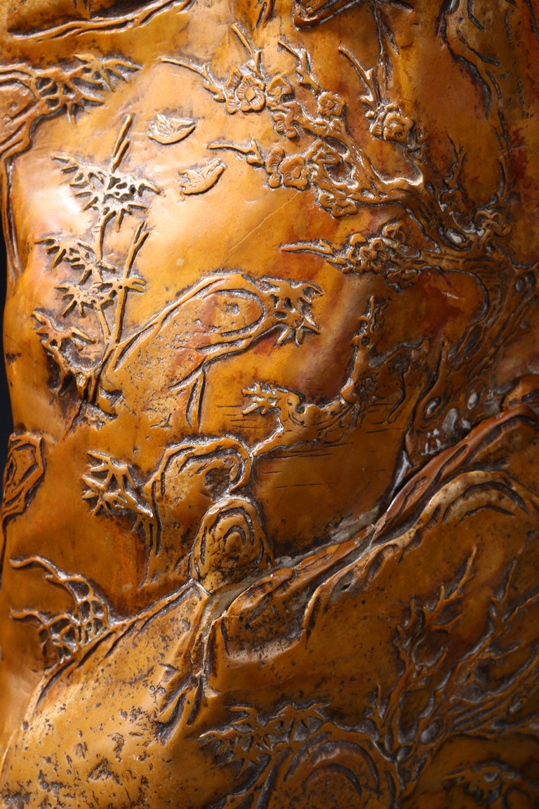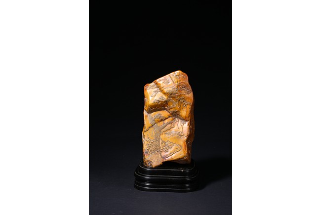 Of irregular upright form, the boulder carved in shallow relief to the exterior depicting a mountain landscape setting including deer, pine tree, river, ducks, and cliffs, with artist signature, all fitted in a hardwood stand, the stone is of opaque caramel tone. Late Qing Dynasty period.