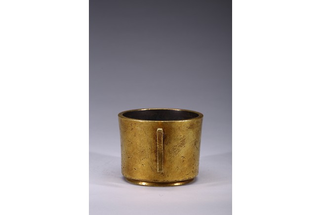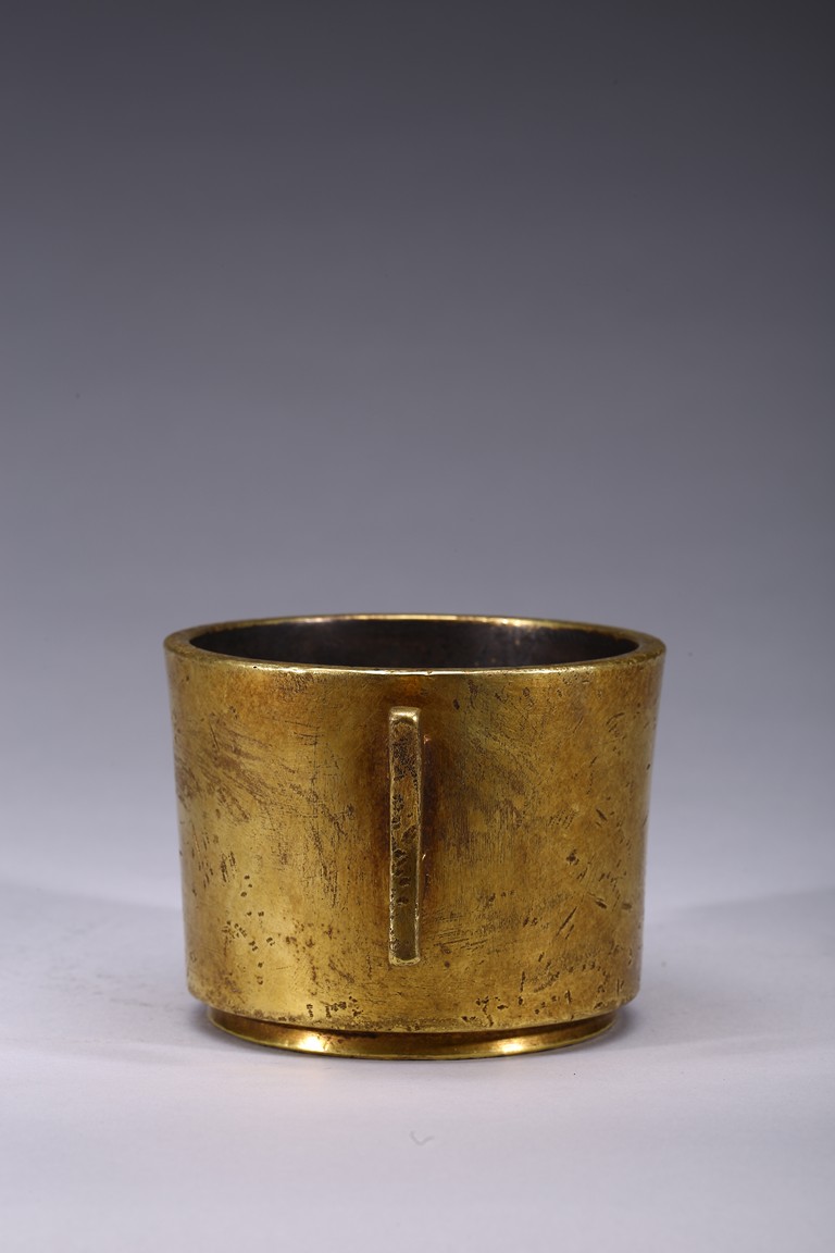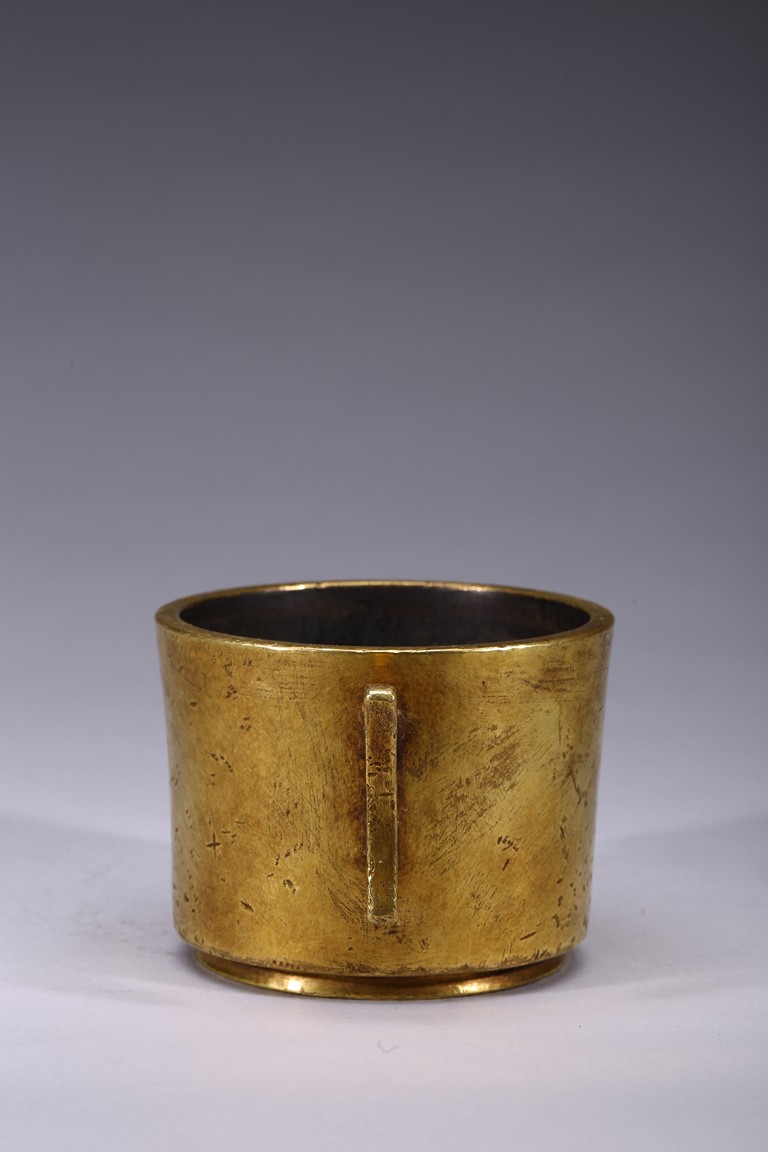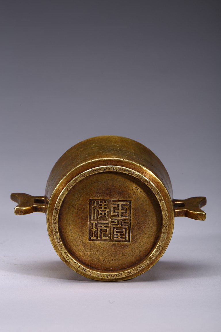Finely cast with cylindrical body resting on a short circular foot, flanked by a pair of yoke handles, the base cast with four character 'Yu Tang Jing Wan'. Qing Dynasty period.
