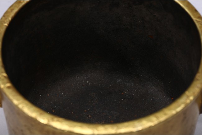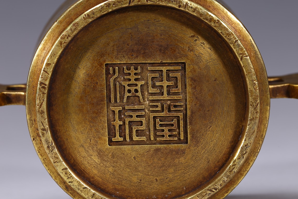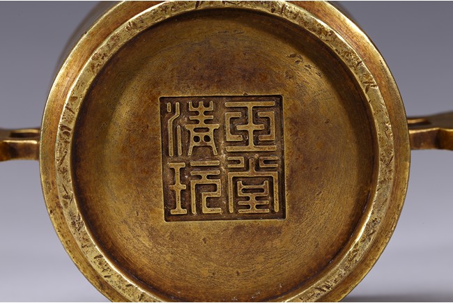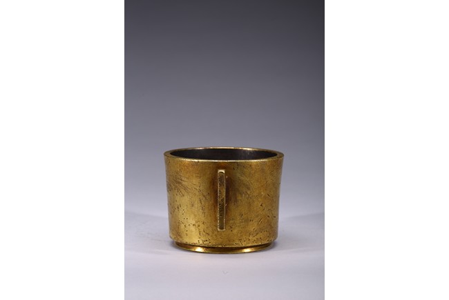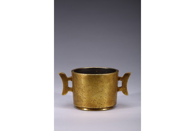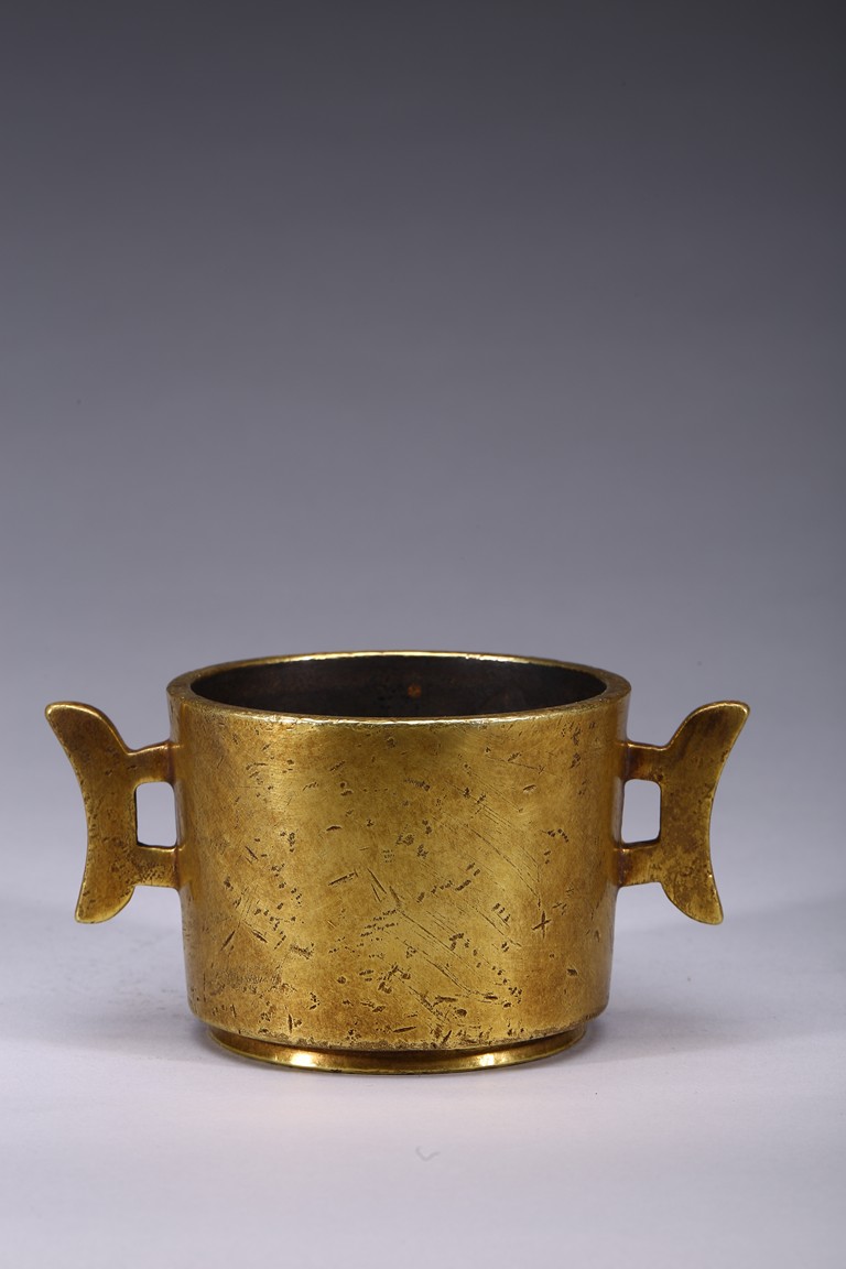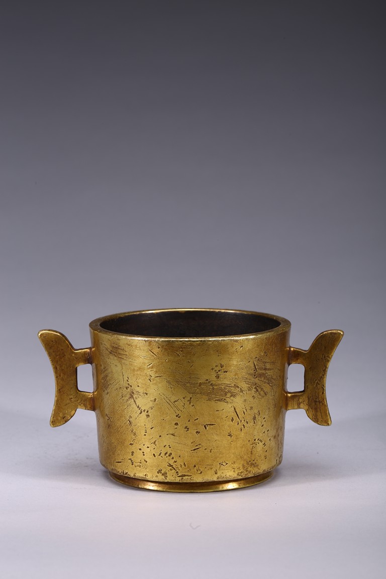 Finely cast with cylindrical body resting on a short circular foot, flanked by a pair of yoke handles, the base cast with four character 'Yu Tang Jing Wan'. Qing Dynasty period.