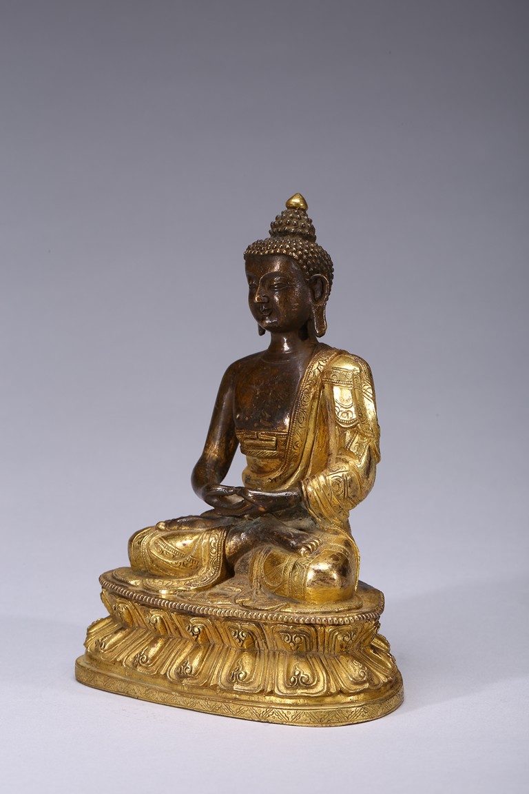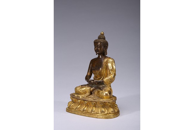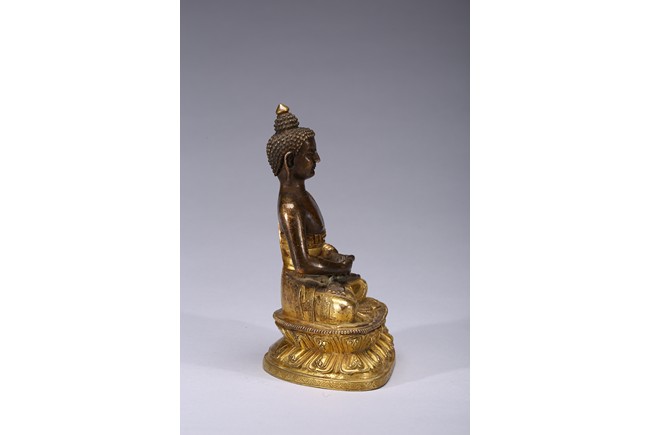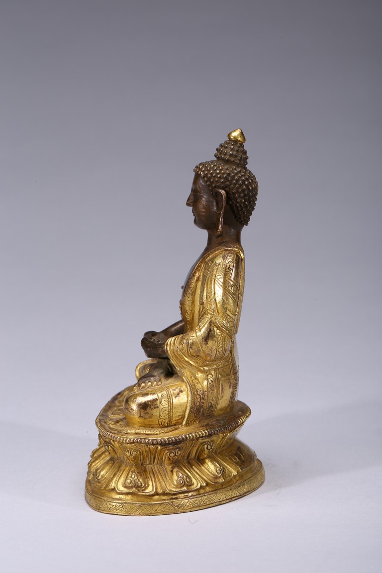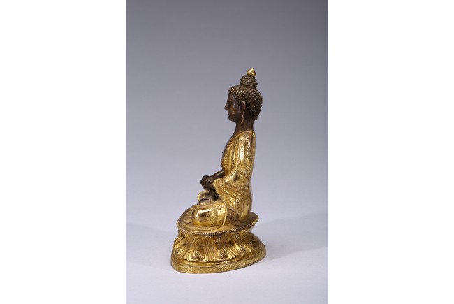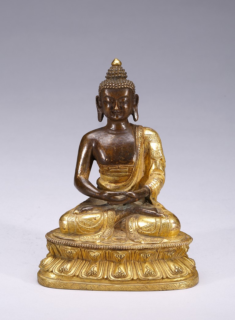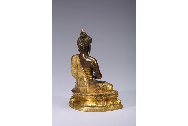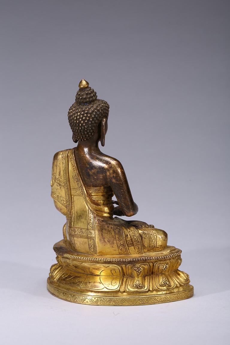 The bodhisattva is shown seated in dhayanasa upon double lotus throne, with both hands holding together before belly, wearing a tight dhoti with incised hem, the face with meditative expression and hair pulled into a high chignon. Qing Dynasty period.