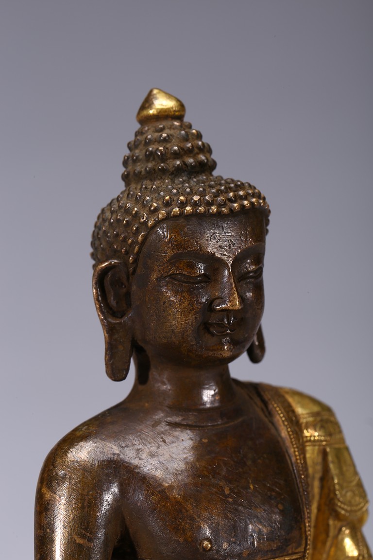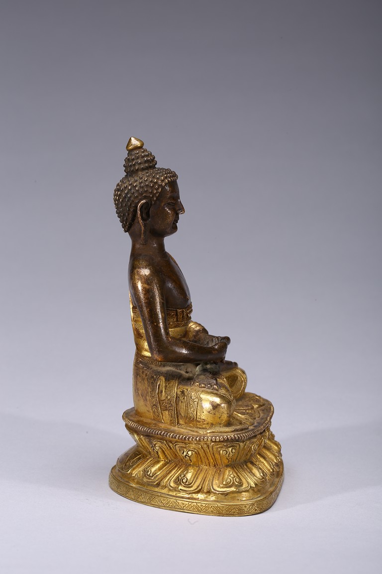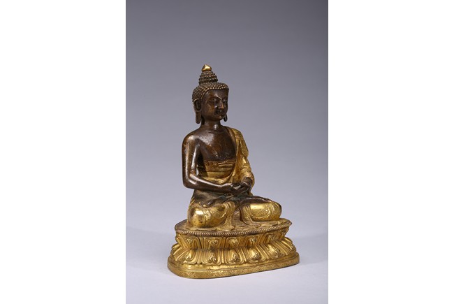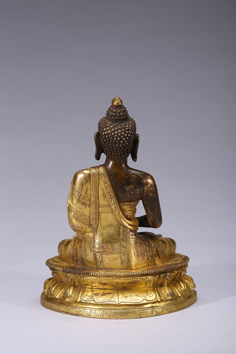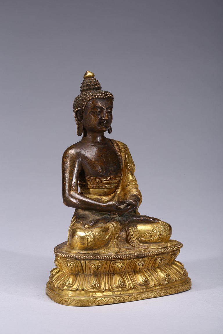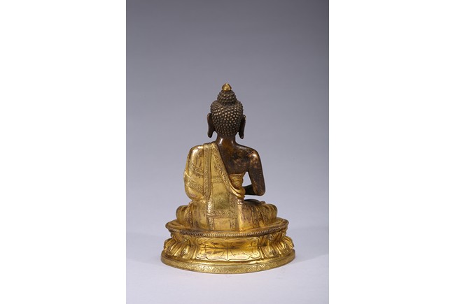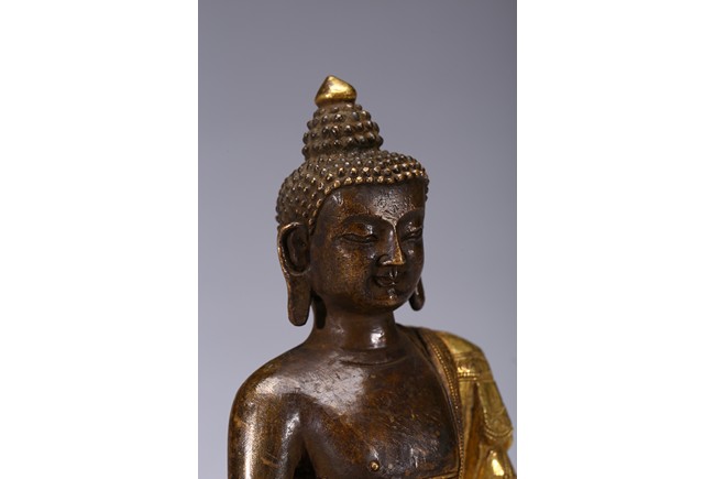 The bodhisattva is shown seated in dhayanasa upon double lotus throne, with both hands holding together before belly, wearing a tight dhoti with incised hem, the face with meditative expression and hair pulled into a high chignon. Qing Dynasty period.
