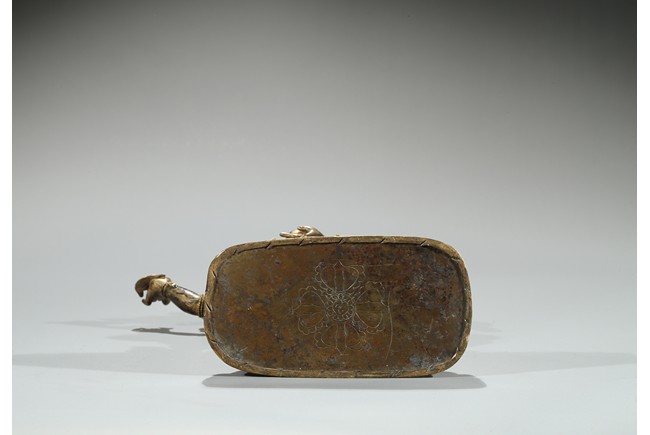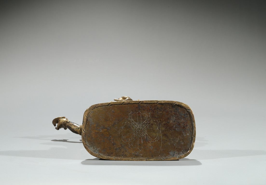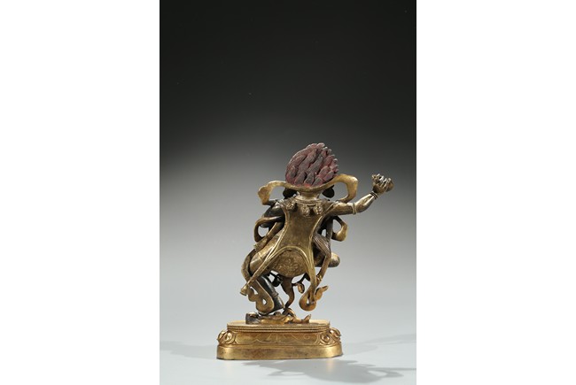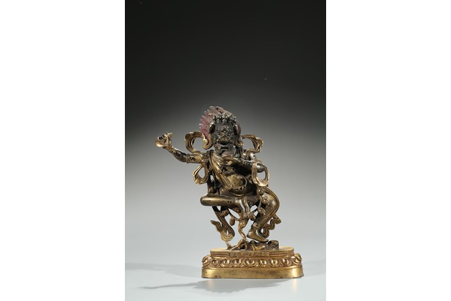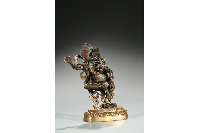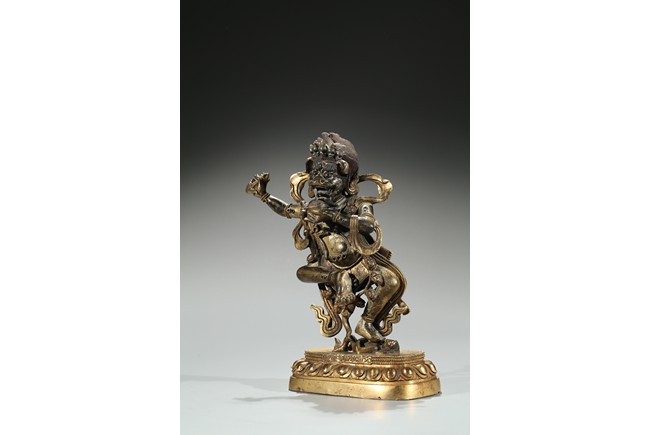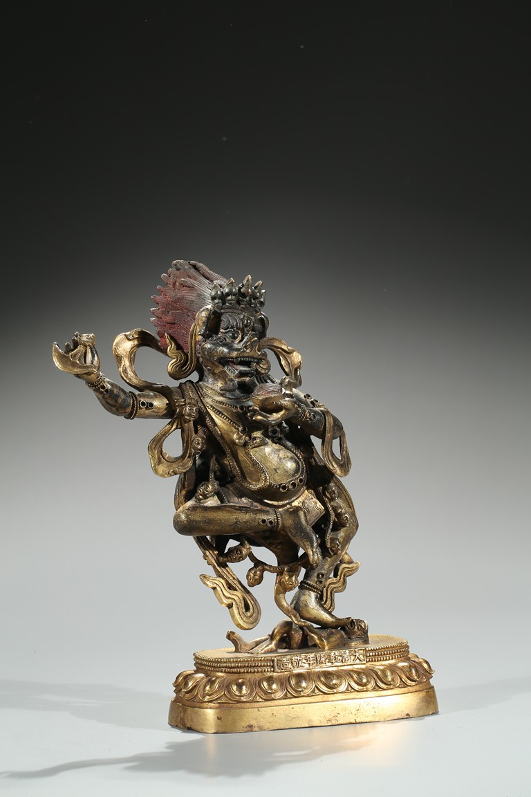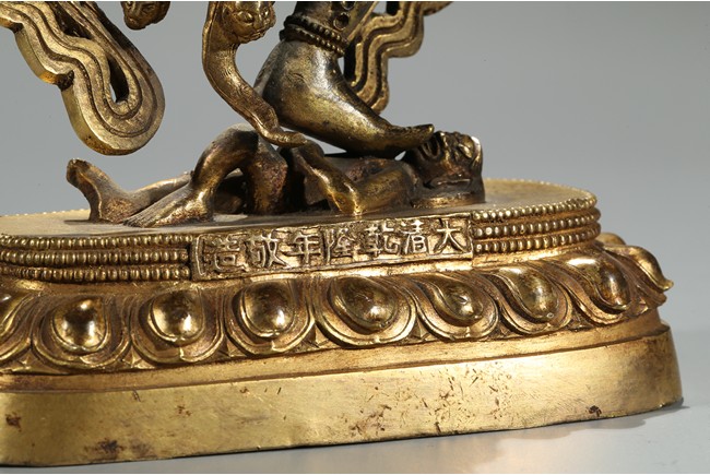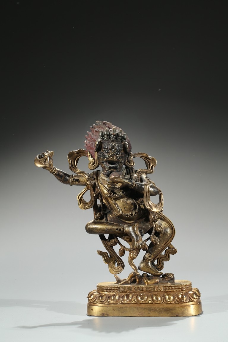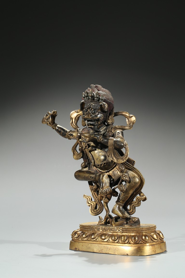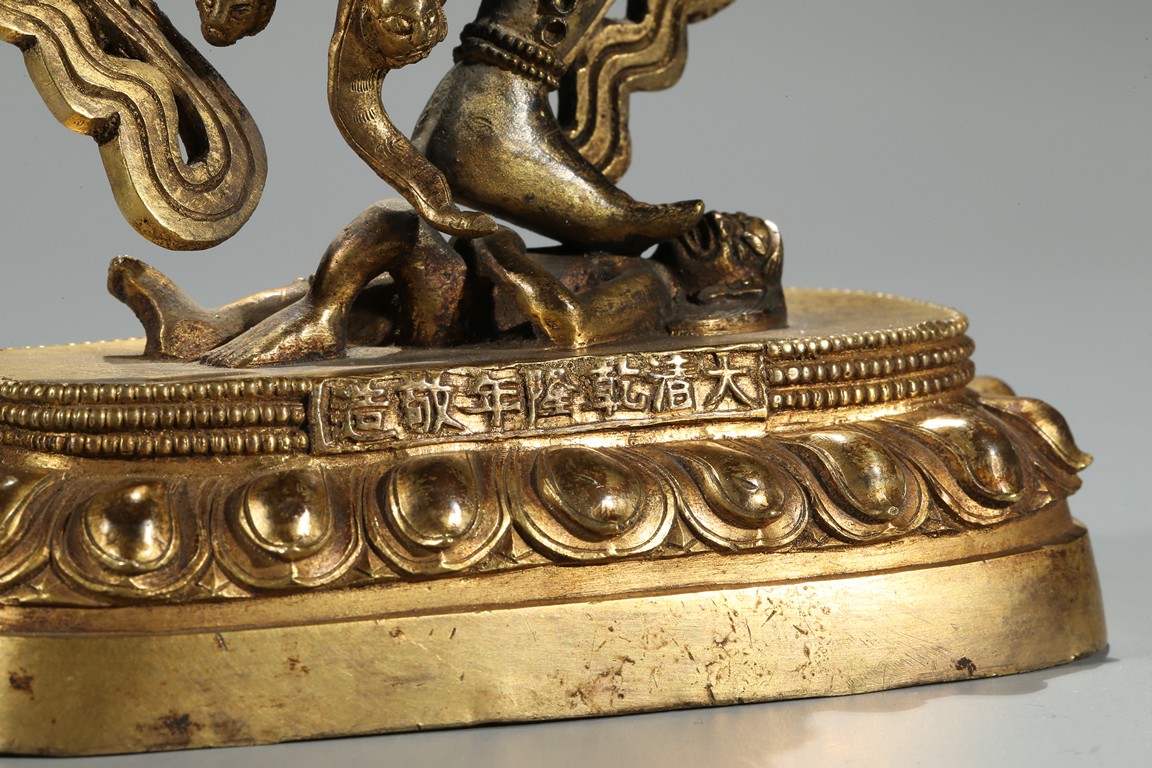 The lion-faced figure dancing in ardhaparyanka asana over a prostrated figure, holding a ritual chopper and skullcup, wearing garlands of severed heads and snakes, flayed human and tiger skins and windswept sashes, the face in a wrathful countenance with tongue bared, bulging eyes and flaming hair adorned by a skull tiara, the base with six character Qianlong mark. Qing Dynasty period.