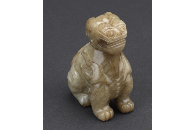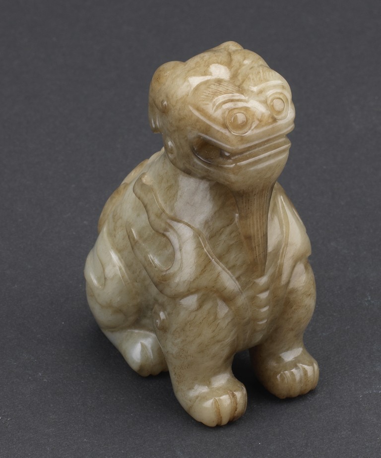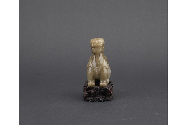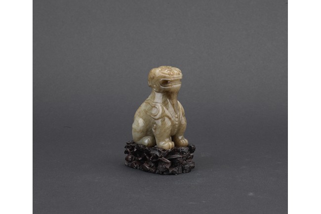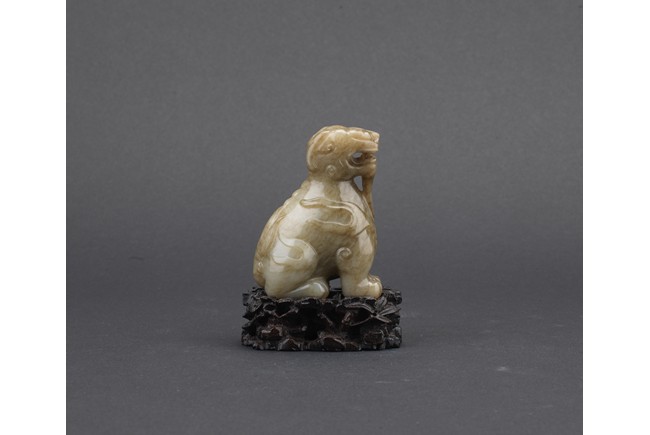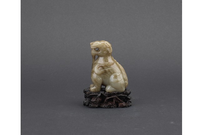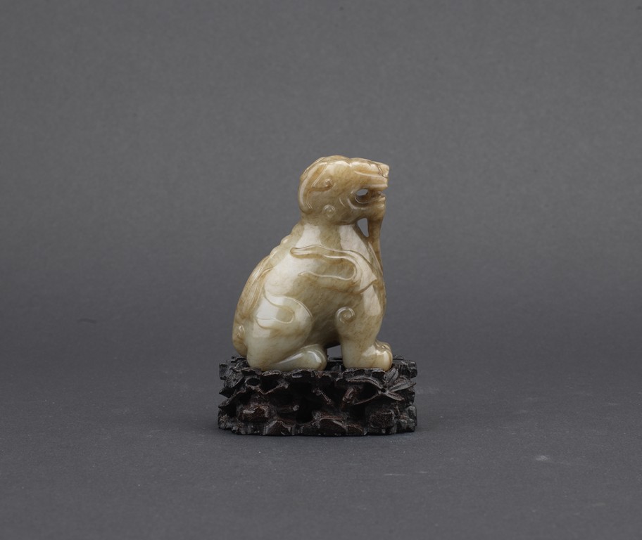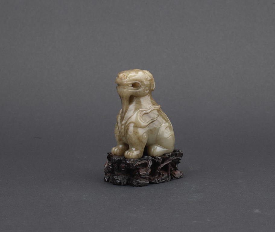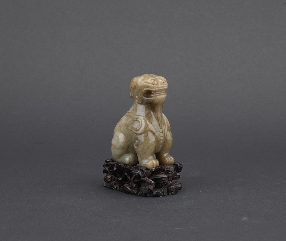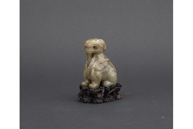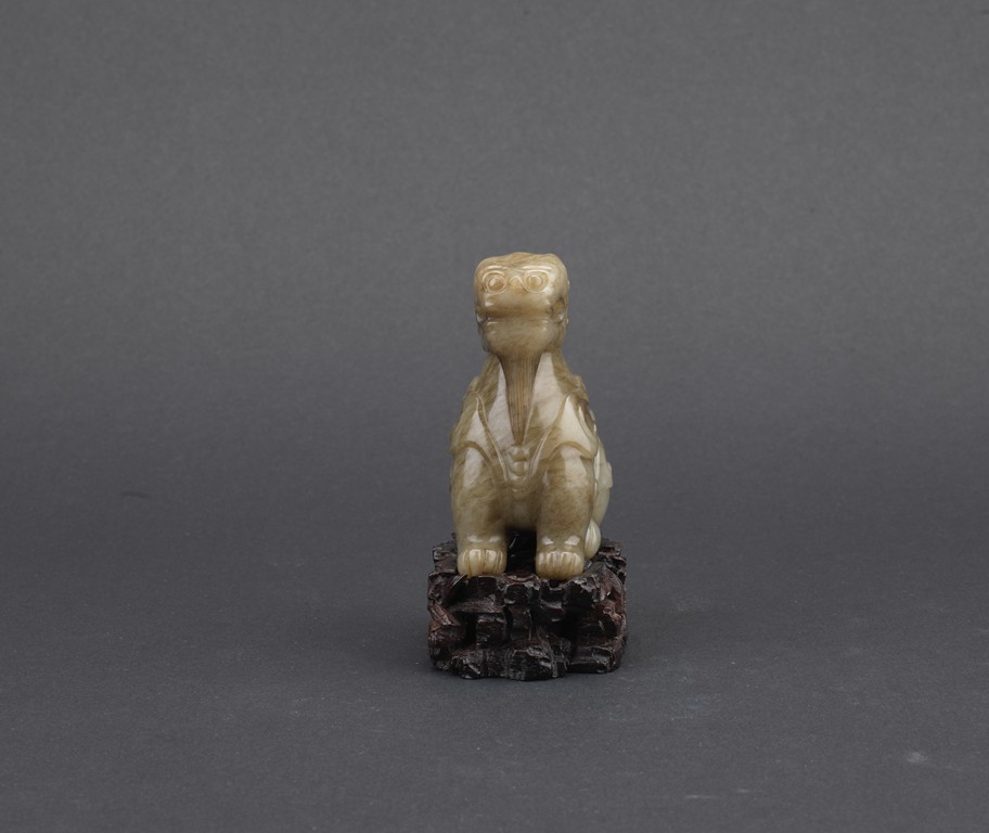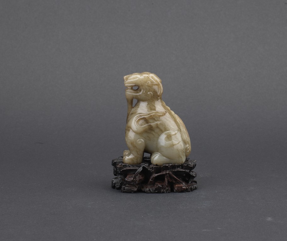 The mythical beast is shown seated on haunches, flanked by a pair of wings with a curled long tail, all supported on a zitan stand. Ming Dynasty period.