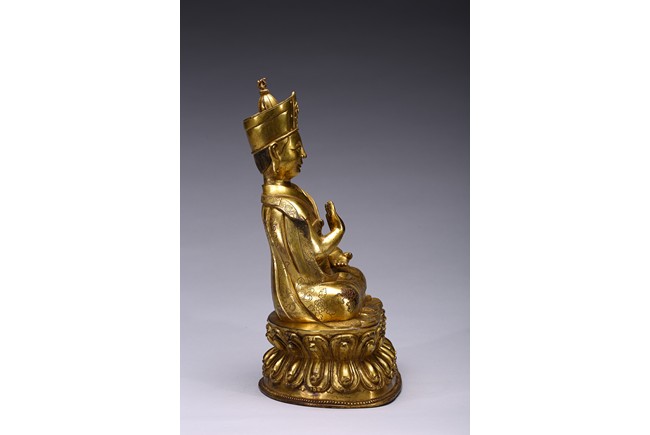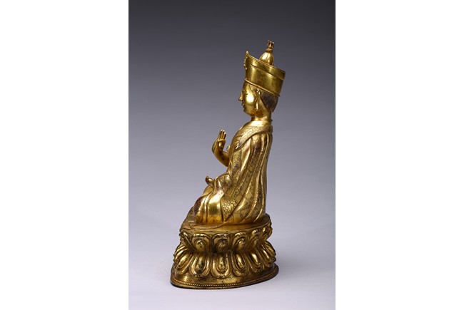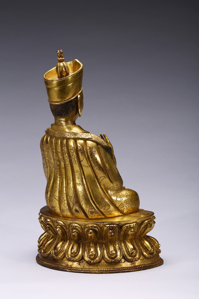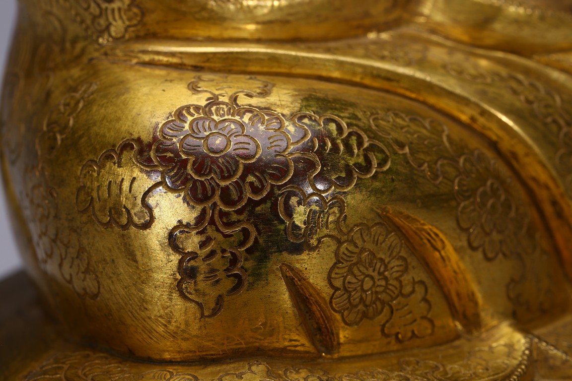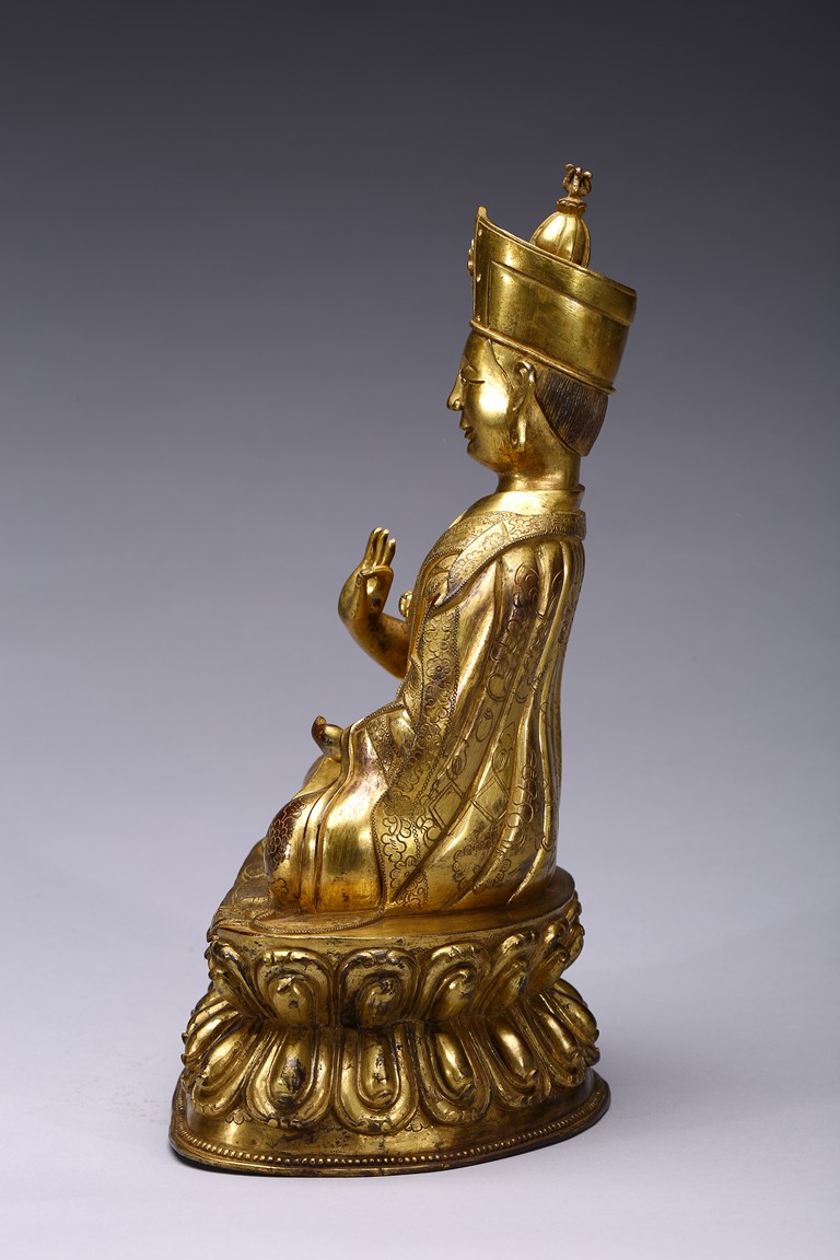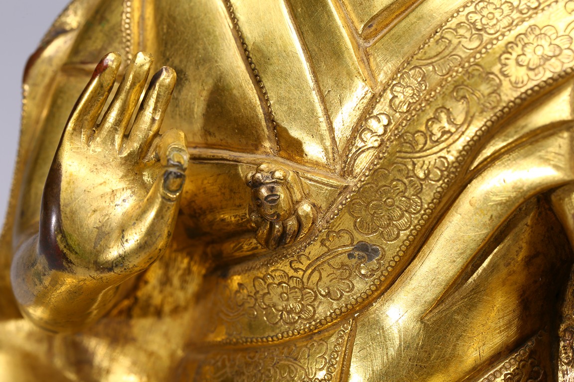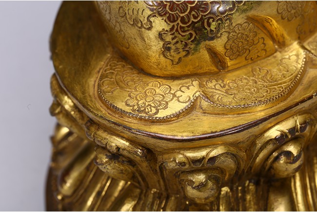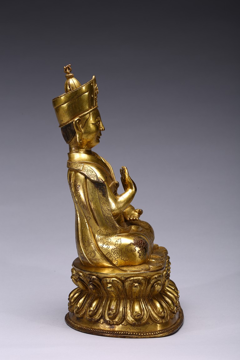 Cast seated on a double-lotus base, with left hand resting on his lap, and right hand raised in vitarka mudra before the chest, depicted with serene expression and downcast eyes, wearing a hat and dressed in loose robes incised floral borders. Qing Dynasty period.