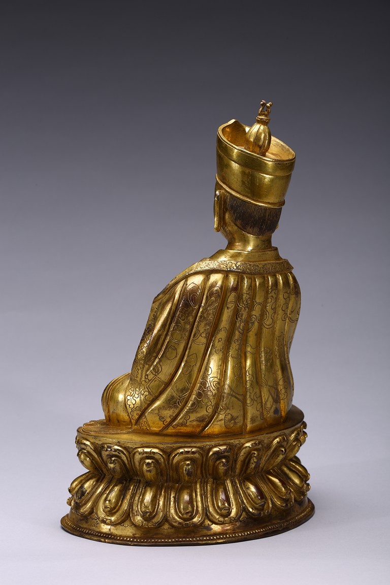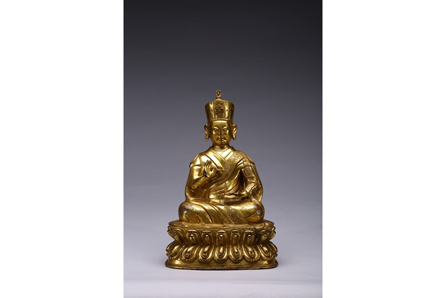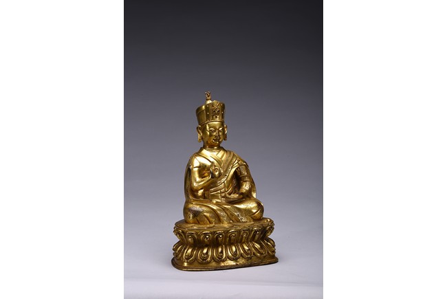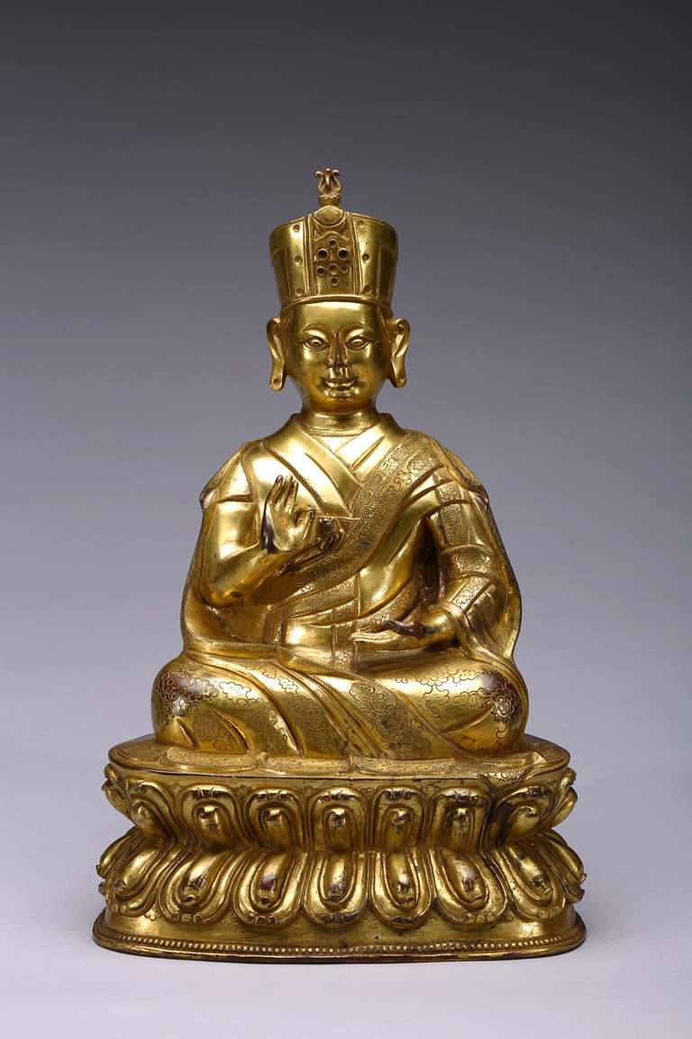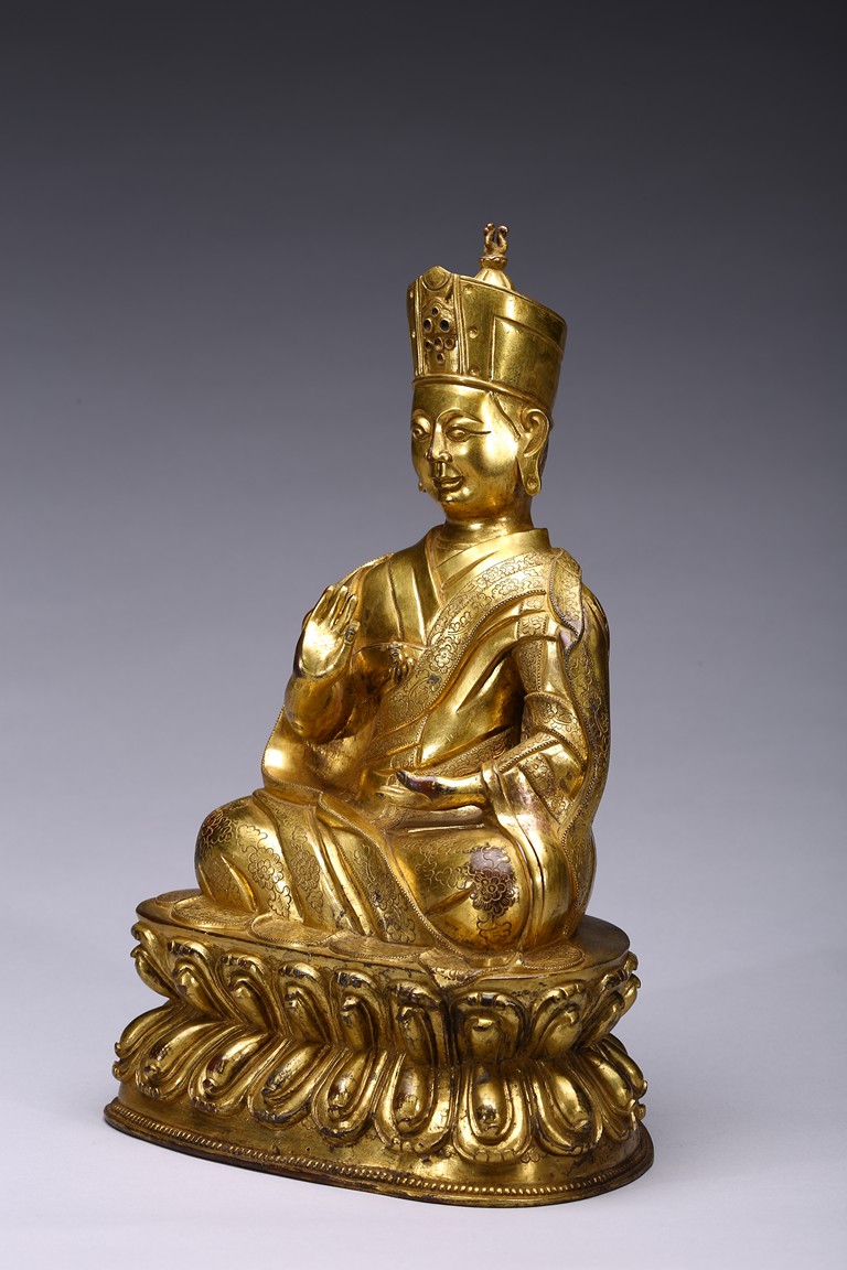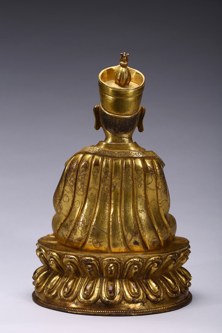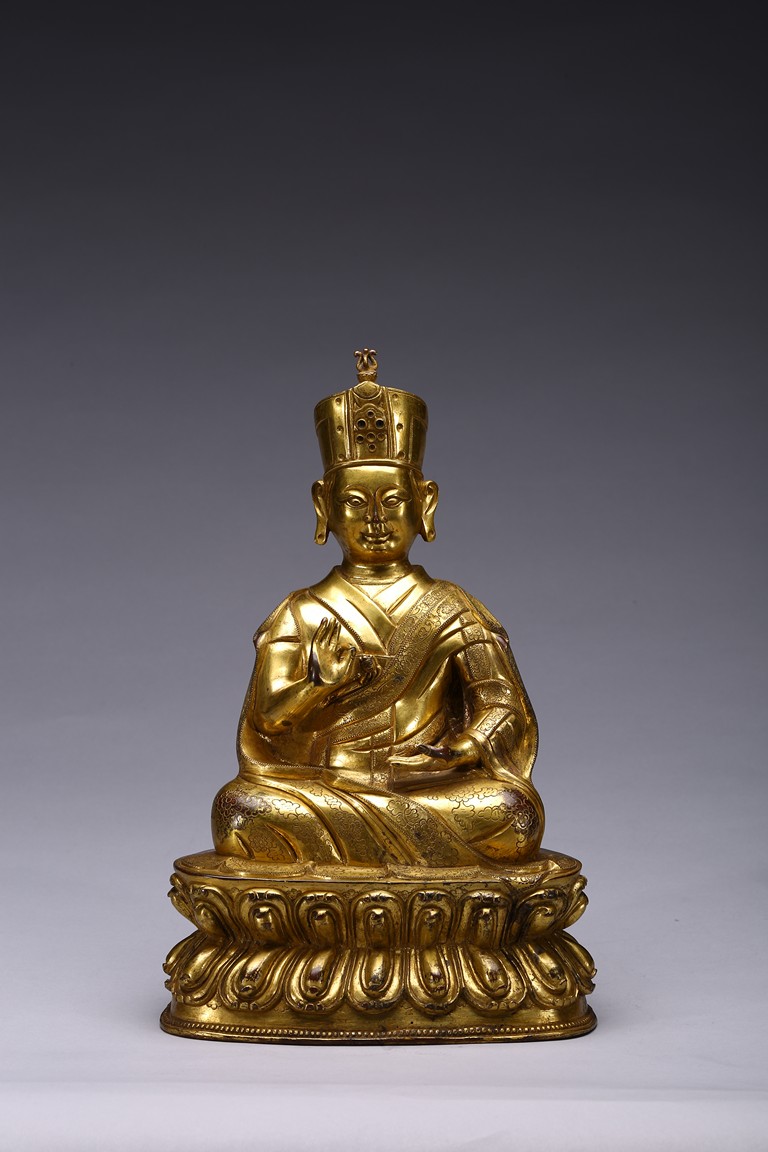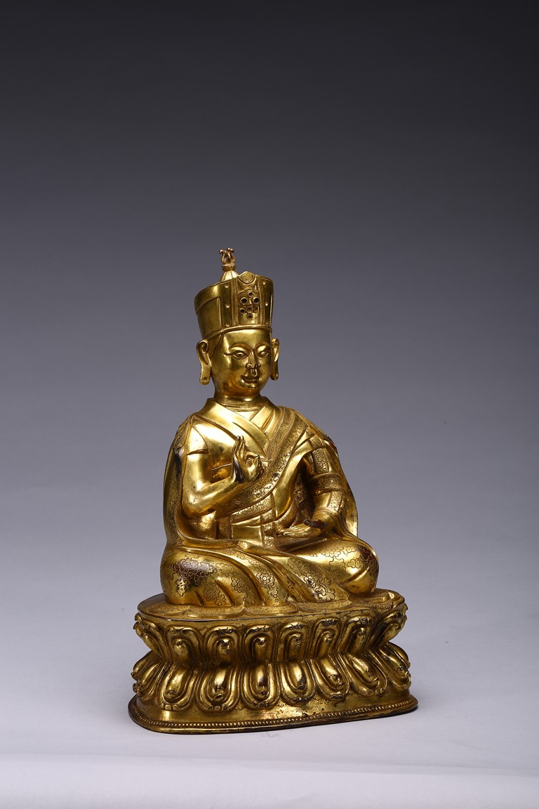 Cast seated on a double-lotus base, with left hand resting on his lap, and right hand raised in vitarka mudra before the chest, depicted with serene expression and downcast eyes, wearing a hat and dressed in loose robes incised floral borders. Qing Dynasty period.