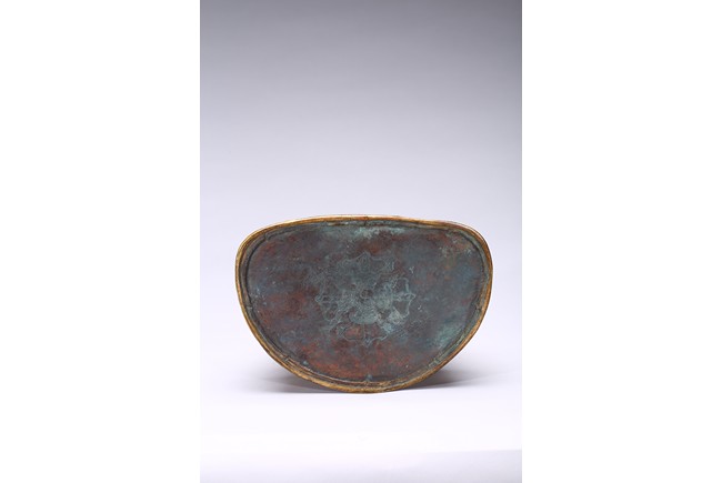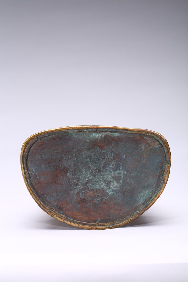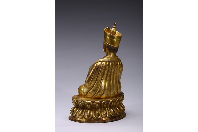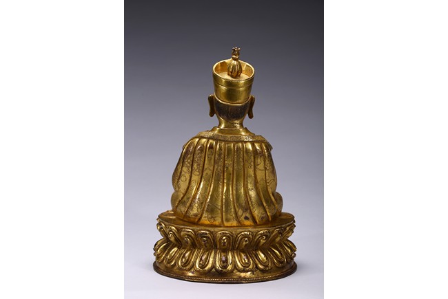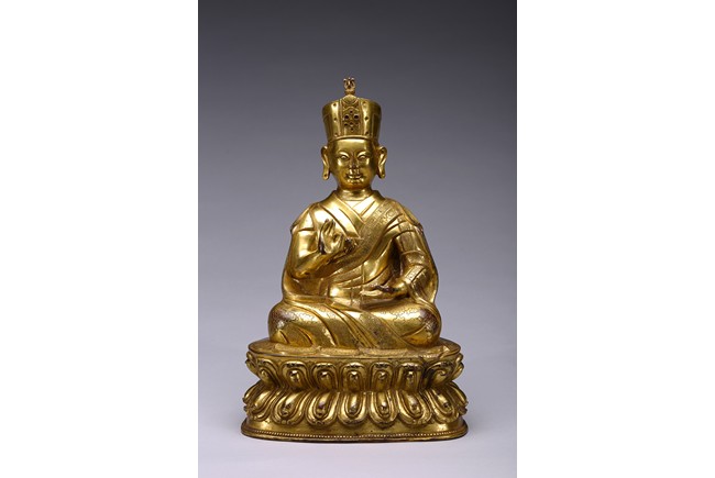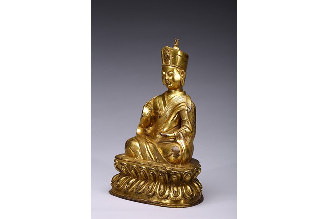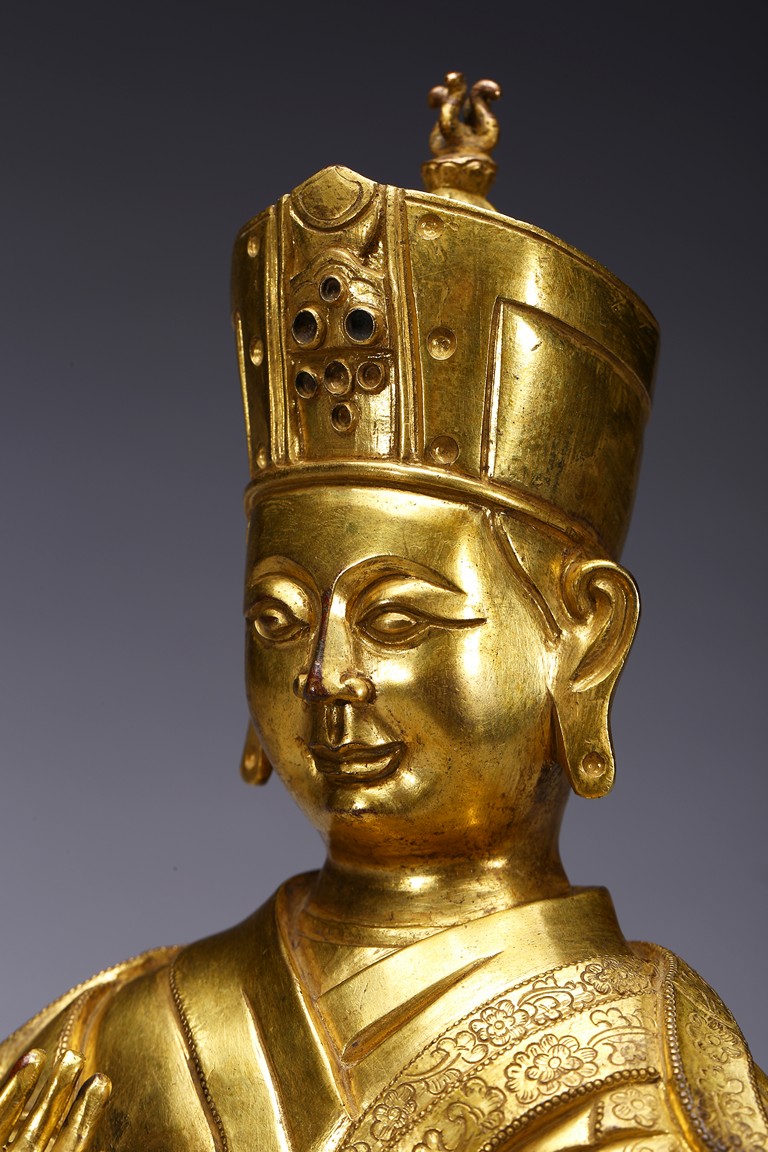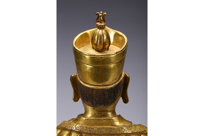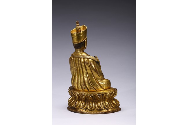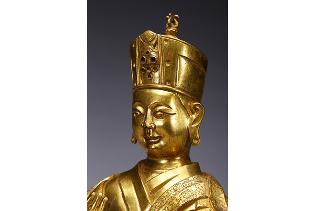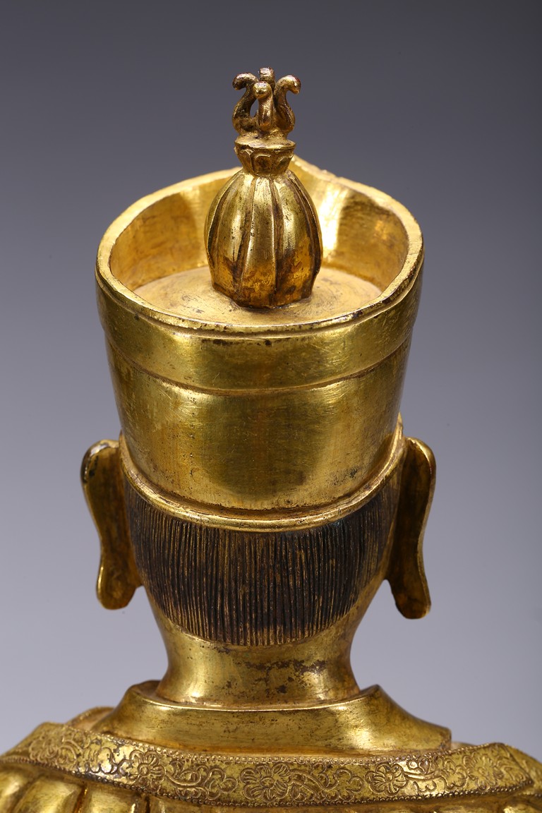 Cast seated on a double-lotus base, with left hand resting on his lap, and right hand raised in vitarka mudra before the chest, depicted with serene expression and downcast eyes, wearing a hat and dressed in loose robes incised floral borders. Qing Dynasty period.