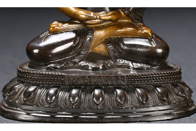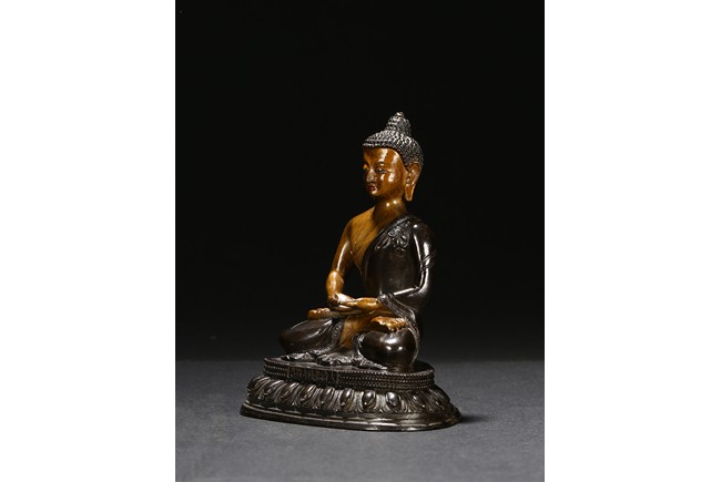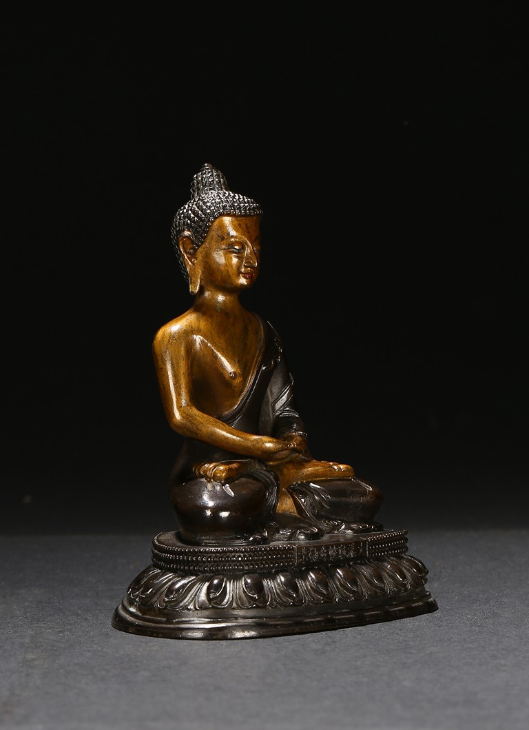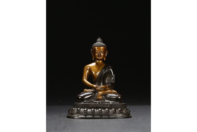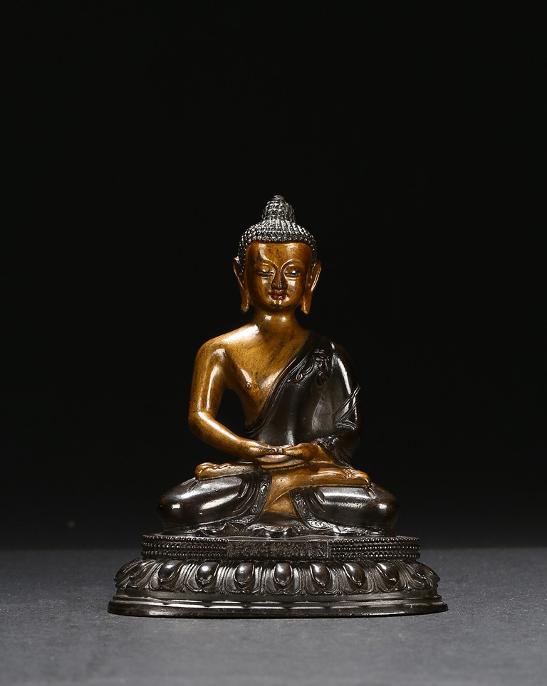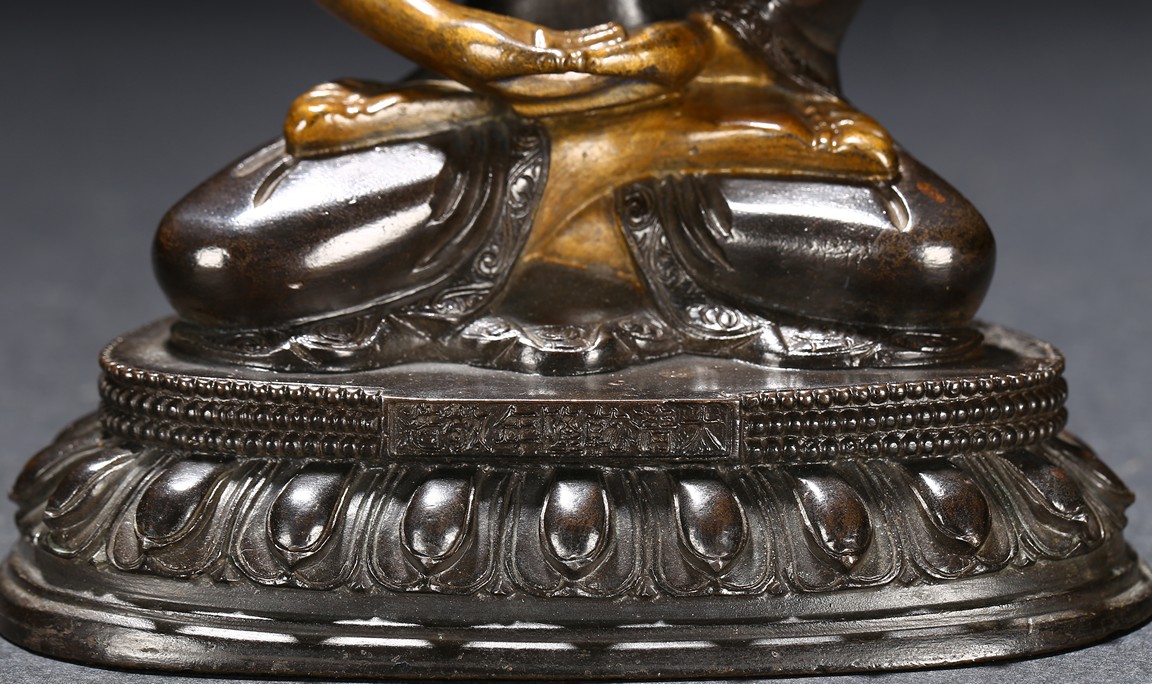 Shown seated in dhyanasana on double lotus throne and with both hands held in mutra, wearing dhoti with elegant folds, face with serene expression, front stand cast with six characte Qianlong mark. Qing Dynasty period.
