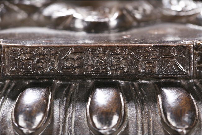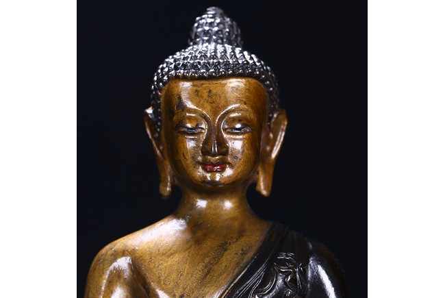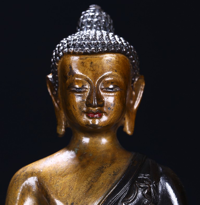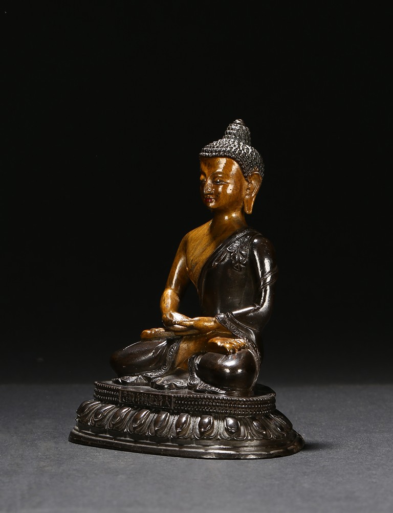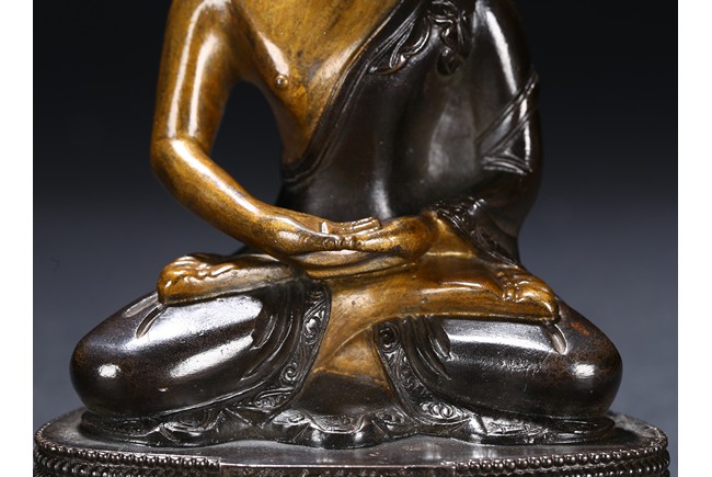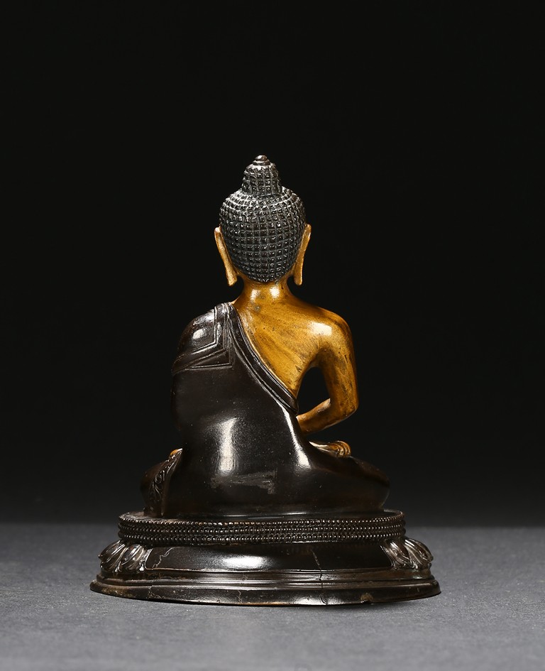 Shown seated in dhyanasana on double lotus throne and with both hands held in mutra, wearing dhoti with elegant folds, face with serene expression, front stand cast with six characte Qianlong mark. Qing Dynasty period.